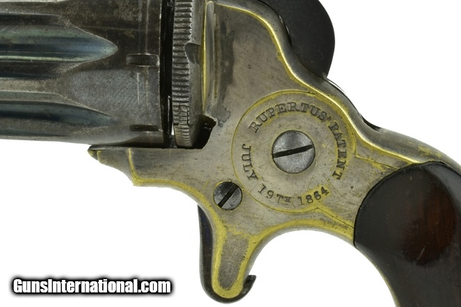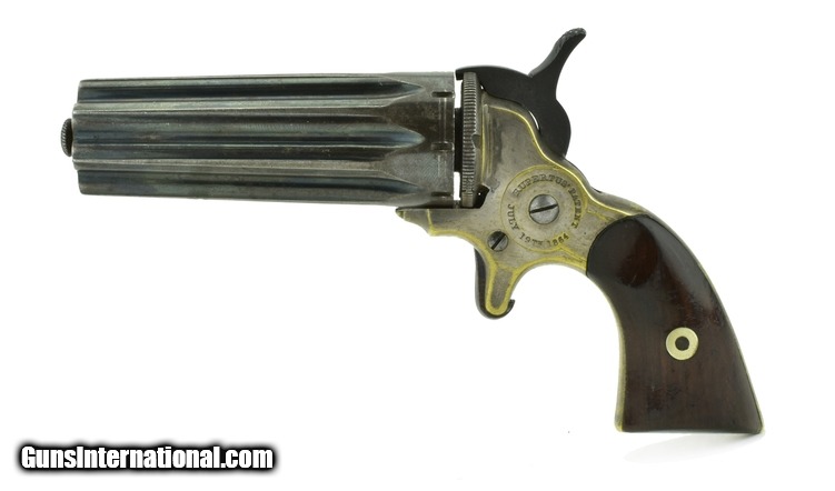 Description: Rupertus Pepperbox. .22 Caliber with a 3” barrel. Barrel has 80% of the original blue with slight high edge wear. Frame is brass with approximately 50% of the original silver. Grips are very good with 70% of the original varnish. SOLD Antique: Yes |
