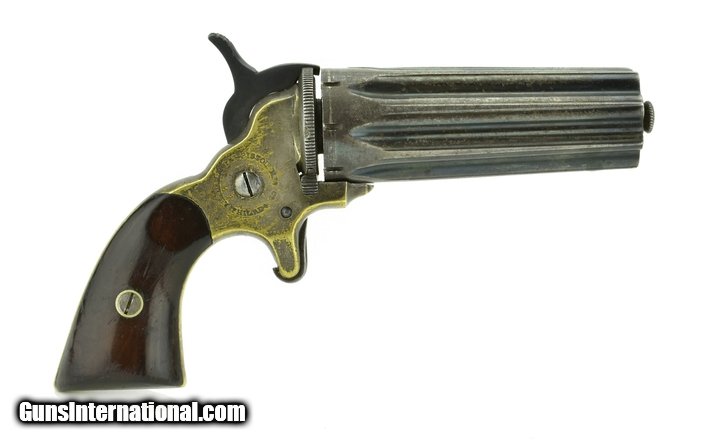 Rupertus Pepperbox. .22 Caliber with a 3” barrel. Barrel has 80% of the original blue with slight high edge wear. Frame is brass with approximately 50% of the original silver. Grips are very good with 70% of the original varnish.