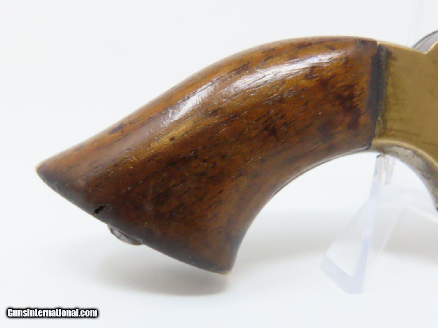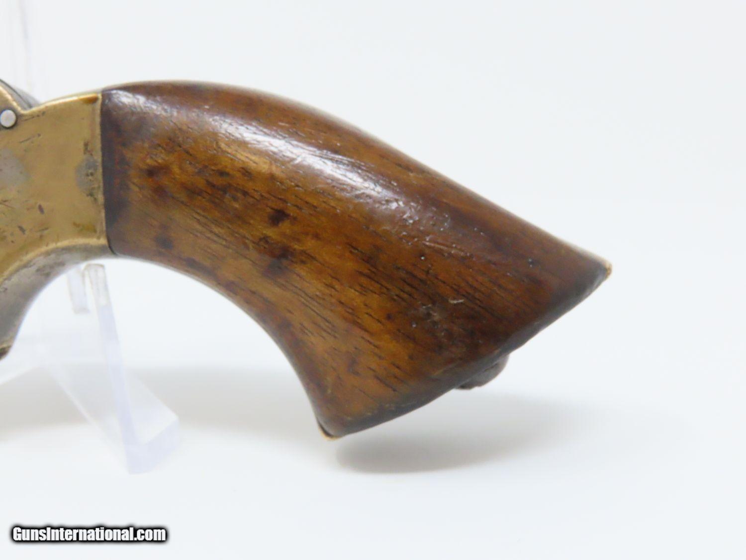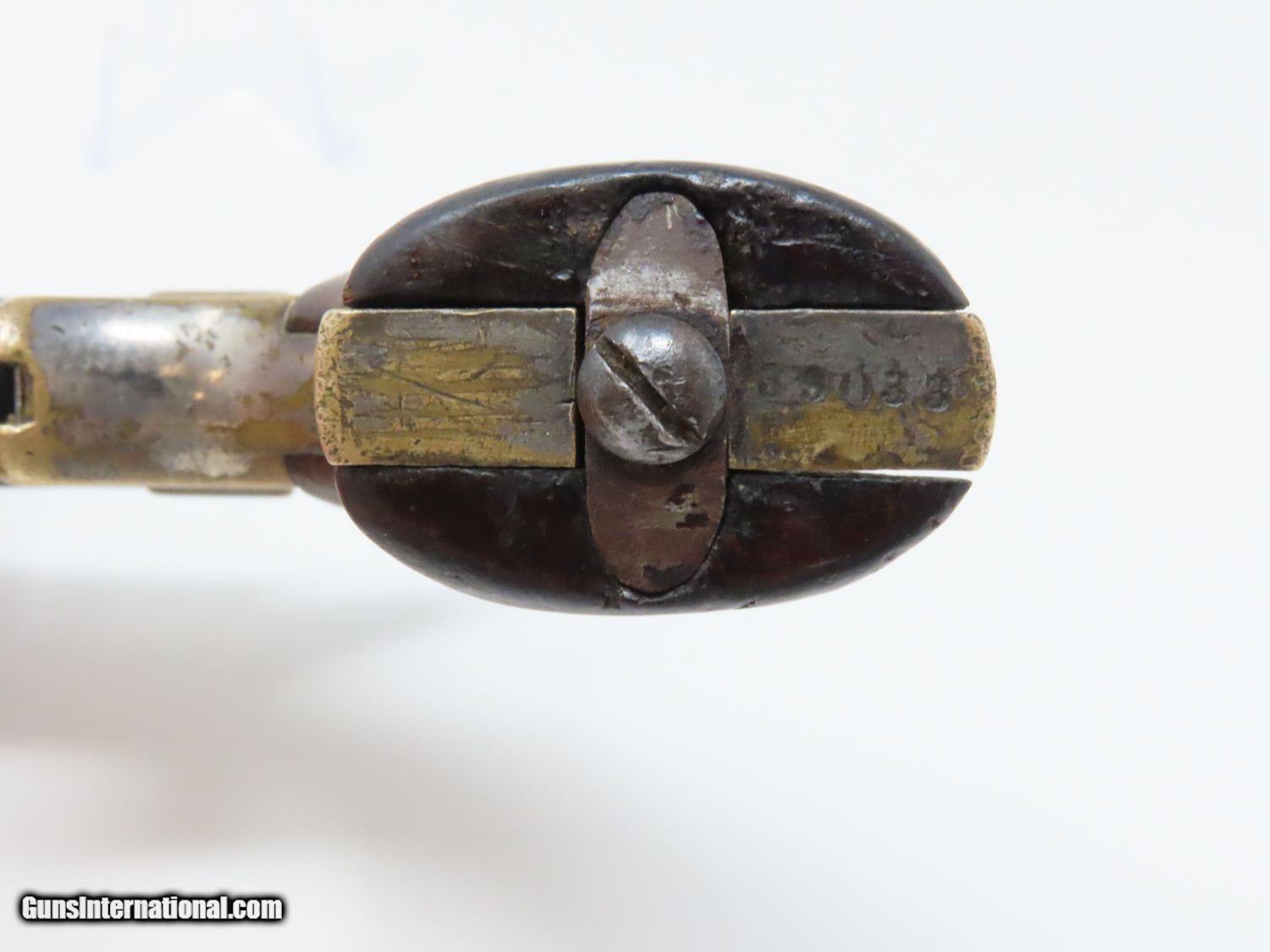 Description: 4-Shot 1860s Antique CHRISTIAN SHARPS .22 Caliber Rimfire PEPPERBOX Pistol With Unique Revolving Firing Pin! Here we present an antique Sharps Model 1A Pepperbox Pistol, made circa the 1860s with a production run of 1859 through 1874 in Philadelphia, Pennsylvania. Christian Sharps invented his famously large bore, breech-loading rifle in 1848, after practicing gun-making under John Hall at Harpers Ferry Armory. In 1859, he premiered another unique design in the 4-barreled pepperbox pistol with a unique revolving firing pin, made for 19th Century concealed carry. This repeating design was able to utilize the new rimfire ammunition like Smith & Wesson, without infringing on Smith & Wesson’s Rollin White Patent for bored through chambers on a revolver’s cylinder. This gave Sharps a leg up in the market since everyone else either had to produce single shot pistols, come up with an alternate ammunition and weapon design, or just stick with percussion until the patent expired. They made very nice, easy to use and compact firearms for 19th century conceal and carry. The overall condition is good. The action functions and the revolving firing pin does too. The bores are in good condition. The markings on frame are clear. A fantastic piece of American ingenuity from the mid-19th Century! Own the original! This is a legitimate antique and not a reproduction. Barrels are 2-½ inches. Caliber: .22 Rimfire Overall condition as seen in photos. Very Fast. Very Safe. FREE SHIPPING WORLDWIDE. Delivered directly to your door by express mail! Guaranteed AUTHENTIC & Includes CERTIFICATE OF AUTHENTICITY. ancestryguns $1200 #20281 SOLD Antique: Yes |