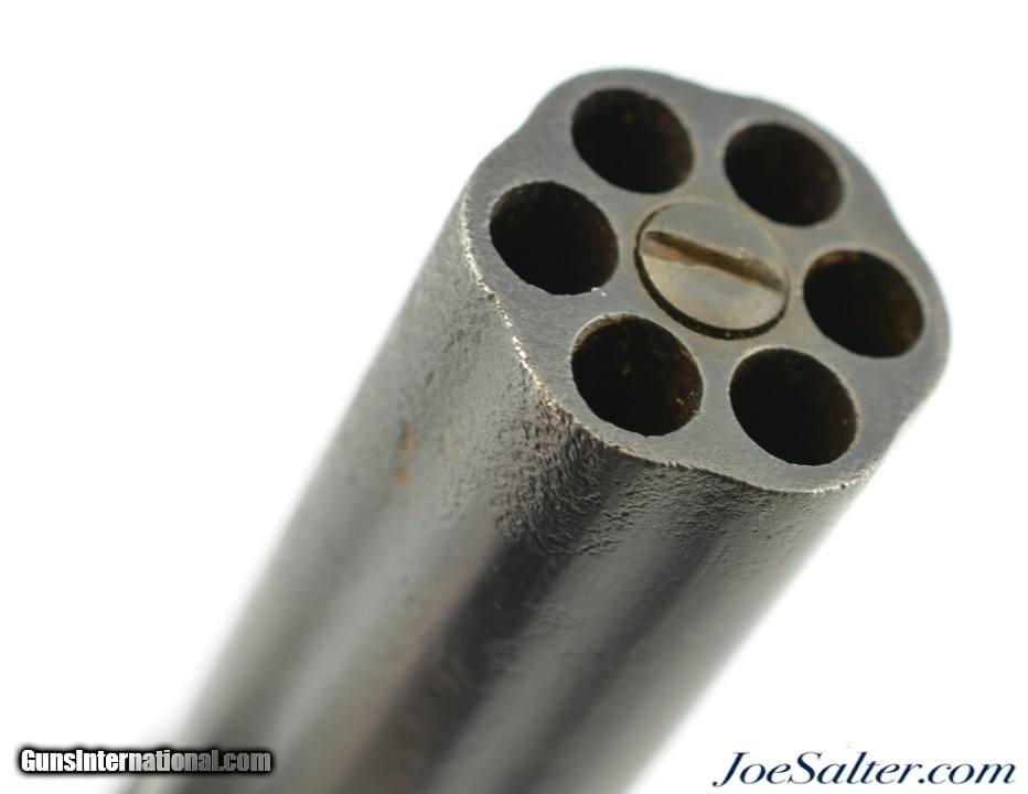 Description: Batch #58, .31 Caliber black powder percussion, 4 inch 6 barrel cluster with very fine dark bores. This is a "Allen & Thurber" Worcester marked Pepperbox double action, bar hammer pistol. The antique pistol features an engraved frame and nipple shield with the scarcer left side plate on the frame and Worcester style, bag shaped grip and fluted barrels. It retains much of a later added finish on the metal surfaces with old pitting visible under the finish heaviest near the muzzle with some isolated spots near the nipple shield and around the nipples. The bar hammer is marked "Allens Patent / 1845" and show some minor nicks and dings. The bag shaped walnut grips, each numbered to the gun, rate about excellent with some light use marks and old contusions. Mechanically it functions properly with good barrel alignment and a crisp trigger pull. A nicely marked and good looking example of this rather scarce Worcester made Allen & Thurber Pepperbox. Antique SOLD |