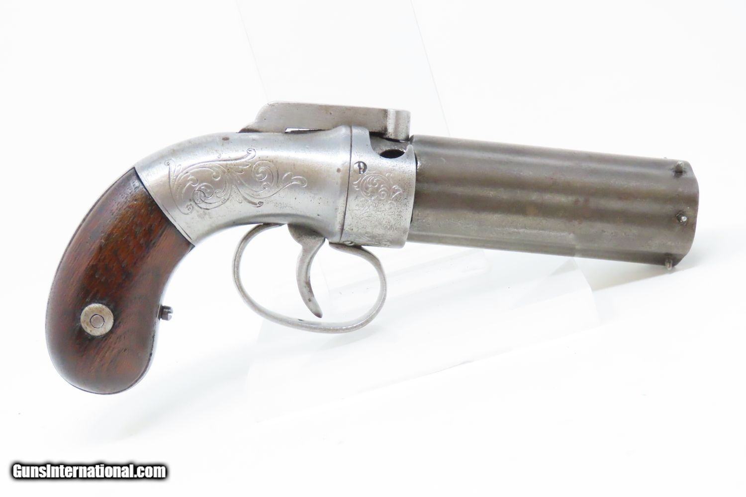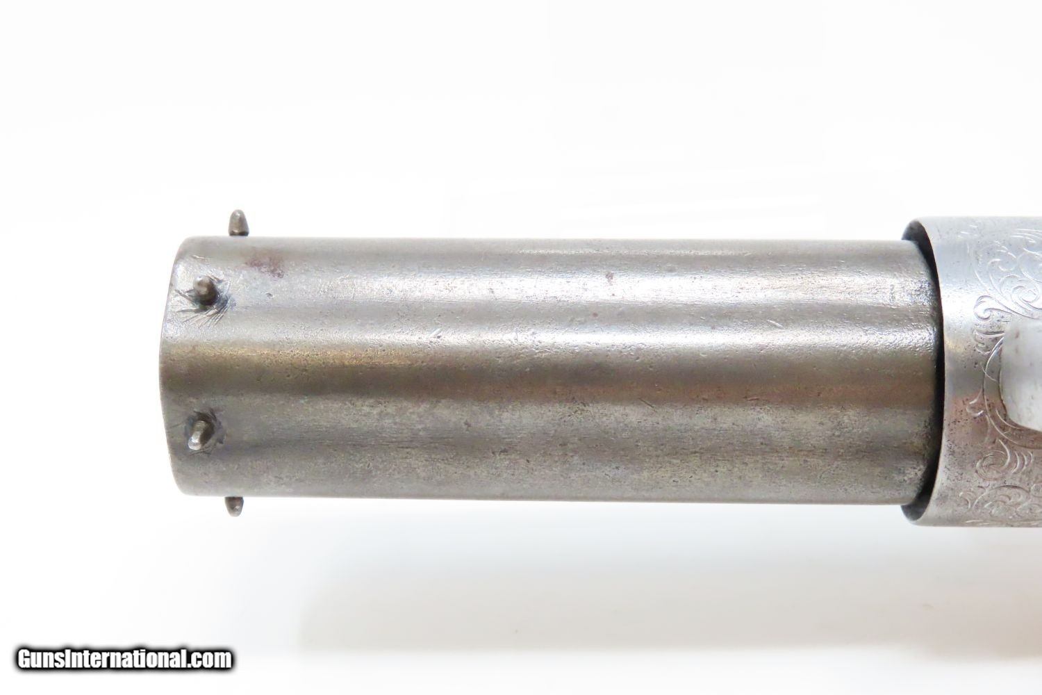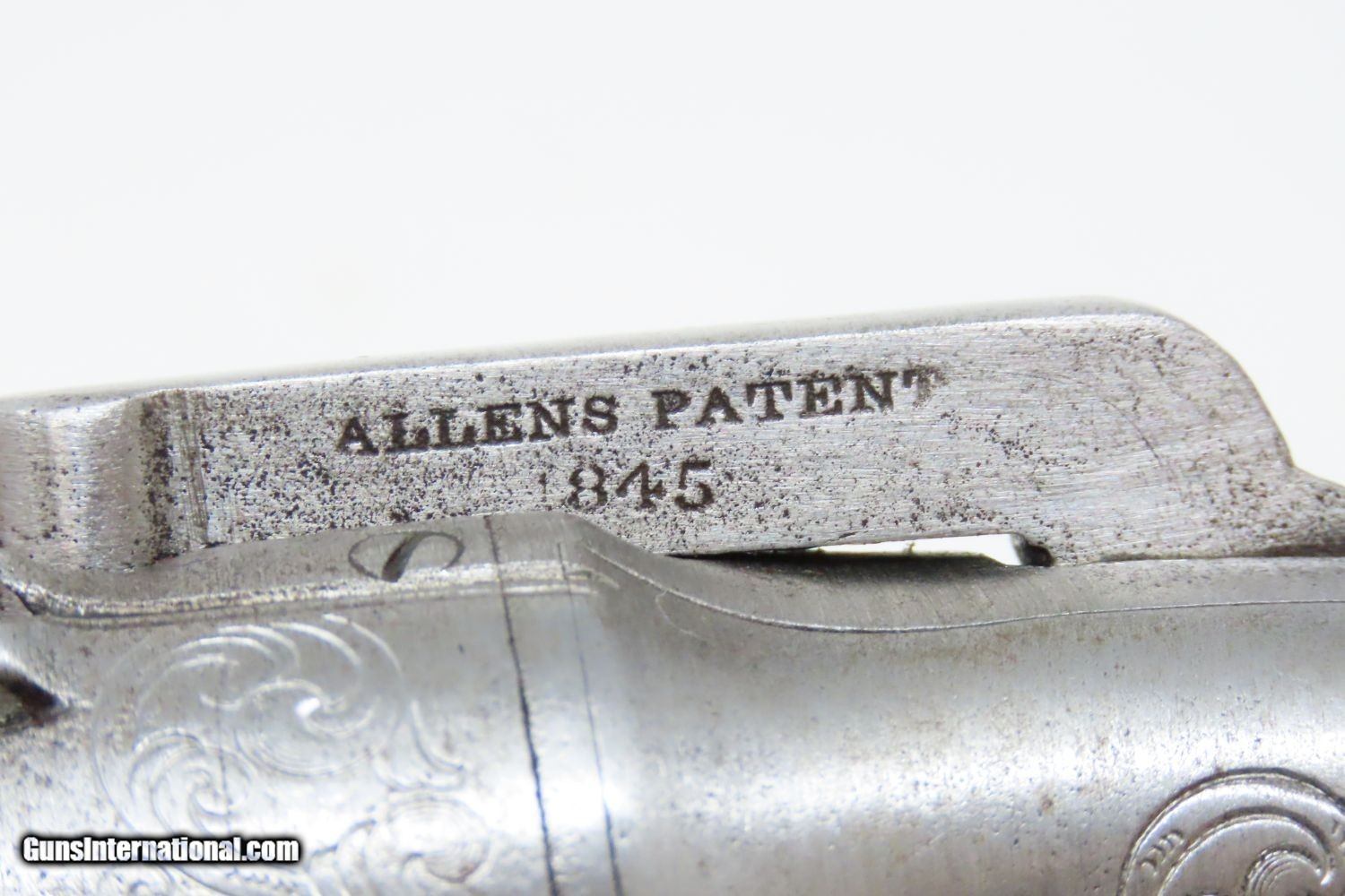 Description: ANTIQUE Allen & Thurber WORCHESTER PERIOD .32 Bar Hammer PEPPERBOX Revolver First American Double Action Revolving Percussion Pistol Here we present an antique Engraved Allen & Thurber Bar Hammer 6-shot Percussion Pepperbox pistol. Ethan Allen was already a prolific inventor and successful businessman in the 1830s when he came up with this design. This percussion, six-shot, double-action pocket revolver was a very popular pistol that was produced in Worcester, Massachusetts. It’s a 32-caliber pepperbox with a revolving fluted set of barrels and has factory engravings in a floral motif executed on both sides of the frame. Made from 1847-1854, these pistols enjoyed even greater popularity than Sam Colt’s first pistol. The history that these pistols enjoyed over the years is astounding: the Seminole Wars, Gold Rush, Mexican War and American Civil War. These guns are true relics of American history. The overall condition is very good. Strong action. This example has an interesting modification, in that each barrel has its own front sight and the portion of the “nipple shield” on the left side of the hammer has been modified to be a rear sight. Bores are smooth and in good condition. Nice floral engraving on the frame. Both grips are seated firmly with minimal wear. A neatly customized Ethan Allen pepperbox! Own the original! This is a legitimate antique and not a reproduction. Barrel is 3-3/8 inches. Caliber: .32 Percussion Overall condition as seen in photos. Very Fast. Very Safe. FREE SHIPPING WORLDWIDE. Delivered directly to your door by express mail! Guaranteed AUTHENTIC & Includes CERTIFICATE OF AUTHENTICITY. ancestryguns $1565 #210126 SOLD Antique: Yes |