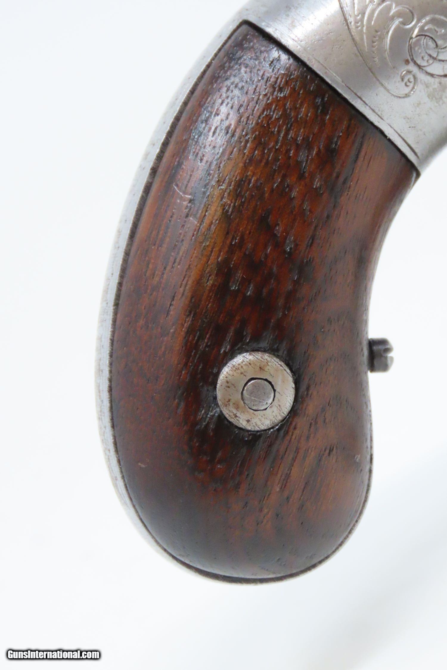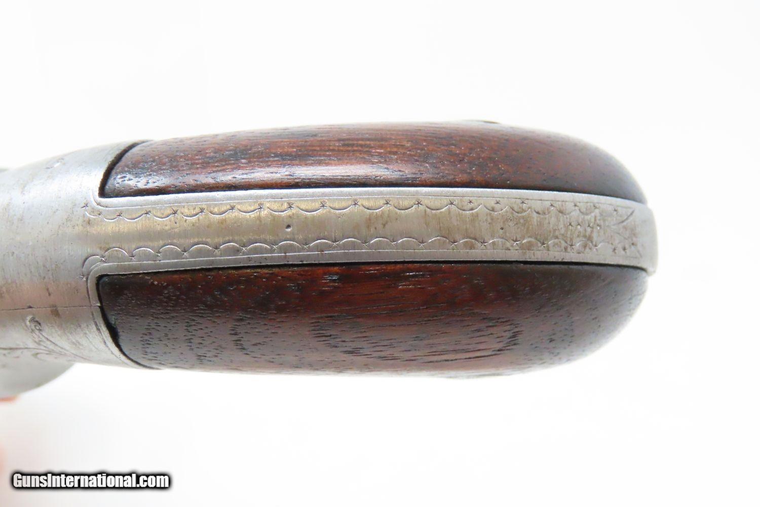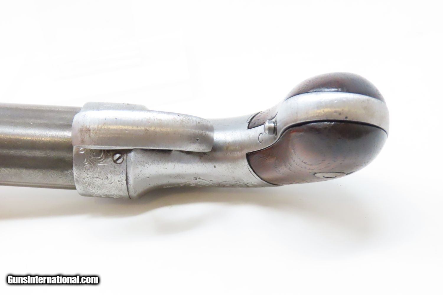 Description: ANTIQUE Allen & Thurber WORCHESTER PERIOD .32 Bar Hammer PEPPERBOX Revolver First American Double Action Revolving Percussion Pistol Here we present an antique Engraved Allen & Thurber Bar Hammer 6-shot Percussion Pepperbox pistol. Ethan Allen was already a prolific inventor and successful businessman in the 1830s when he came up with this design. This percussion, six-shot, double-action pocket revolver was a very popular pistol that was produced in Worcester, Massachusetts. It’s a 32-caliber pepperbox with a revolving fluted set of barrels and has factory engravings in a floral motif executed on both sides of the frame. Made from 1847-1854, these pistols enjoyed even greater popularity than Sam Colt’s first pistol. The history that these pistols enjoyed over the years is astounding: the Seminole Wars, Gold Rush, Mexican War and American Civil War. These guns are true relics of American history. The overall condition is very good. Strong action. This example has an interesting modification, in that each barrel has its own front sight and the portion of the “nipple shield” on the left side of the hammer has been modified to be a rear sight. Bores are smooth and in good condition. Nice floral engraving on the frame. Both grips are seated firmly with minimal wear. A neatly customized Ethan Allen pepperbox! Own the original! This is a legitimate antique and not a reproduction. Barrel is 3-3/8 inches. Caliber: .32 Percussion Overall condition as seen in photos. Very Fast. Very Safe. FREE SHIPPING WORLDWIDE. Delivered directly to your door by express mail! Guaranteed AUTHENTIC & Includes CERTIFICATE OF AUTHENTICITY. ancestryguns $1565 #210126 SOLD Antique: Yes |