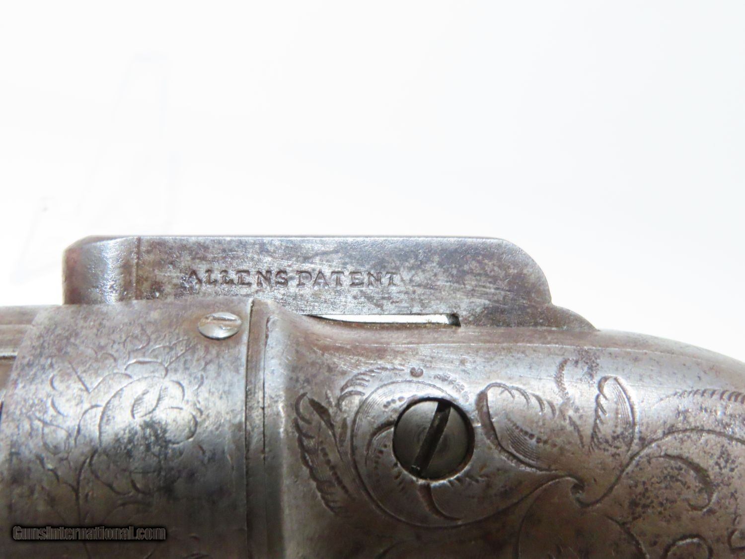 Description: ANTIQUE Allen & Thurber WORCHESTER PERIOD Bar Hammer PEPPERBOX Revolver First American Double Action Revolving Pistol Here we present an antique Allen & Thurber Bar Hammer 5-shot Pepperbox Revolving Pistol, made circa 1850 in Worcester, Massachusetts. It was during the Worcester period (Ethan Allen moved from Grafton to Norwich to Worcester) that the five-shot pepperbox was introduced. Percussion nipples were integrated to the barrels. Made with a bar hammer and standard trigger, models have been encountered with or without an integral nipple shield. .32 was the most common caliber. The five barrel is relatively rare compared to the six-barrel models. Ethan Allen was already a prolific inventor and successful businessman in the 1830s when he came up with this design. This percussion, five-shot, double-action pocket revolver was a very popular pistol that was produced in Worcester, Massachusetts. It’s a 32-caliber pepperbox with a revolving screw off fluted barrel and has factory engravings in a floral motif executed on both sides of the frame. Made from 1847-1854, these pistols enjoyed even greater popularity than Sam Colt’s first pistol. The history that these pistols enjoyed over the years is astounding: the Seminole Wars, Gold Rush, Mexican War and American Civil War. These guns are true relics of American history. The overall condition is very good. The action functions properly. The bores are dark and smooth. The frame is lightly engraved from the factory. The finish has matured to a smooth and pleasing gray patina. A fantastic piece of American craftsmanship from before the War Between the States! Own the original! This is a legitimate antique and not a reproduction. Barrel is 4-1/8 inches. Caliber: .32 Overall condition as seen in photos. Very Fast. Very Safe. FREE SHIPPING WORLDWIDE. Delivered directly to your door by express mail! Guaranteed AUTHENTIC & Includes CERTIFICATE OF AUTHENTICITY. ancestryguns $1275 #20382 SOLD Antique: Yes |