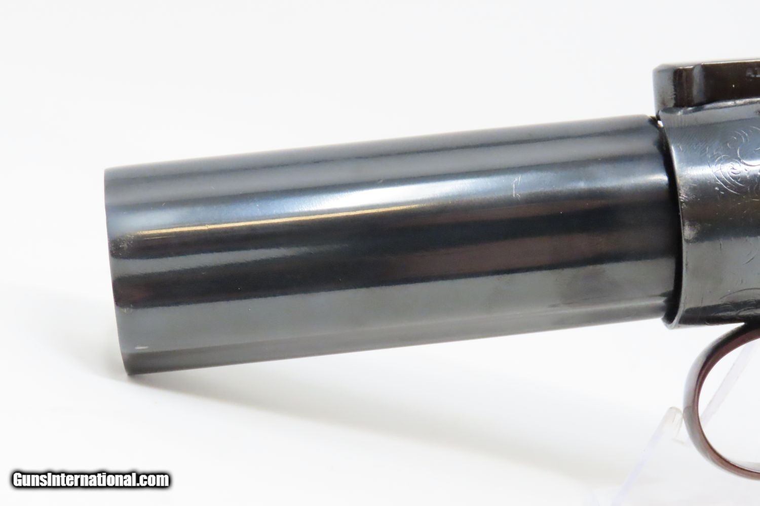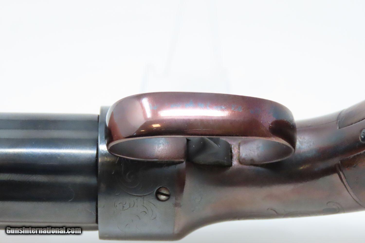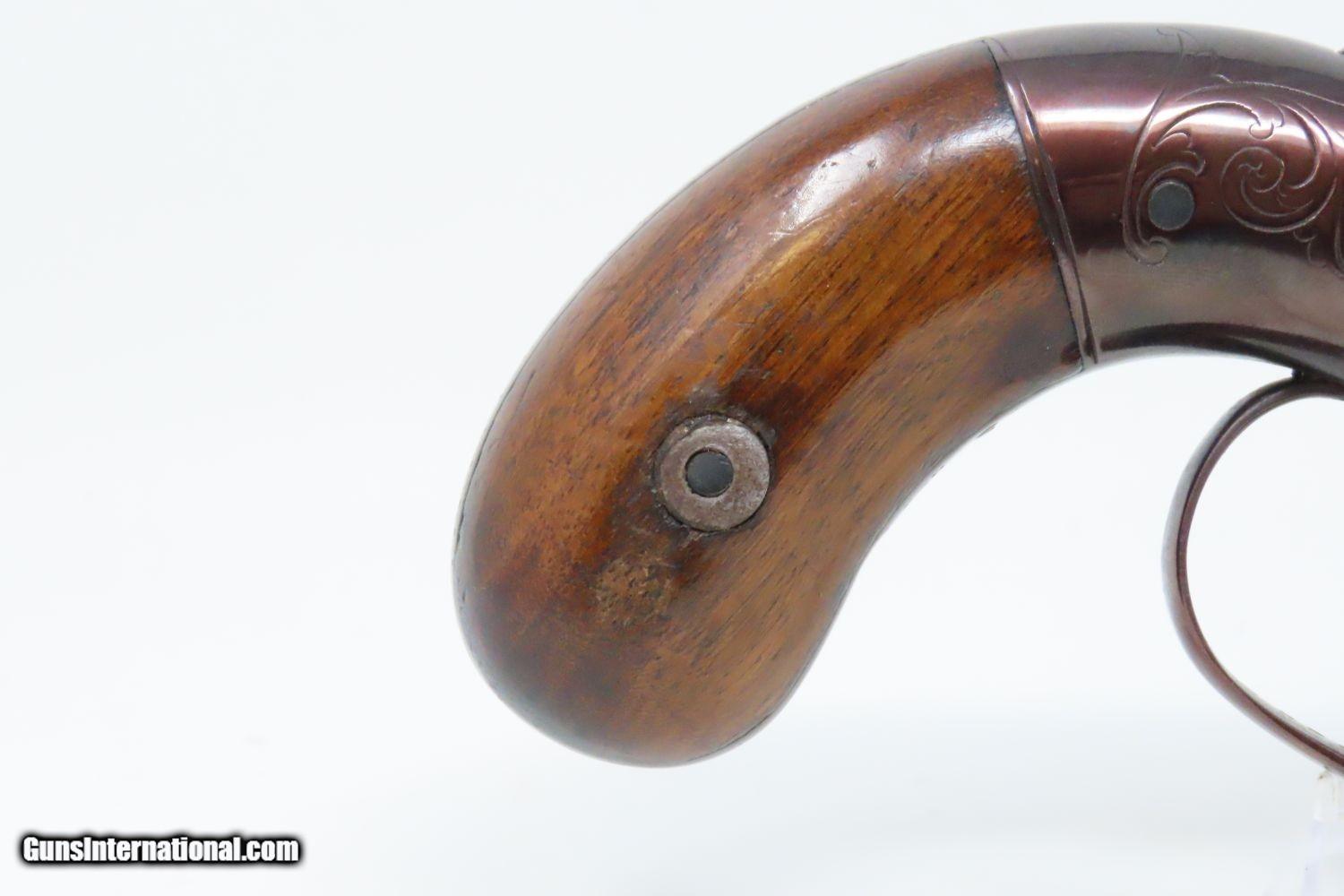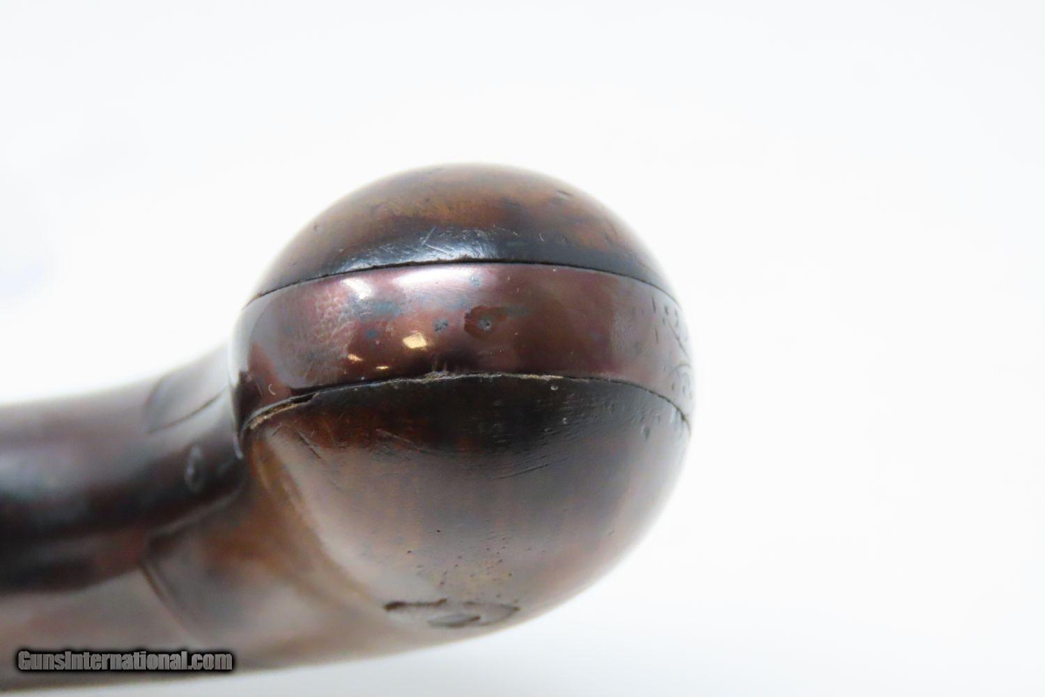 Description: ANTIQUE Allen & Thurber WORCHESTER PERIOD Bar Hammer PEPPERBOX Revolver First American Double Action Revolving Pistol Here we present an antique Allen & Thurber Bar Hammer 6-shot Pepperbox pistol. Only six-barrel pepperbox pistols were produced during the Grafton and Norwich periods (1837–1847), and all had smooth barrel external contours until the later Worchester and Allen and Wheelock period, when fluted barrels became the norm. Though this is a six shot, it was during the Worchester period that the five-shot pepperbox was introduced. Percussion nipples were integrated to the barrels. Made with a bar hammer and standard trigger, models have been encountered with or without an integral nipple shield. While simplifying shooting (no manual cocking of the hammer), the bar hammer did preclude the inclusion of usable sights. However, this early example of a double-action pistol must have been quite a selling point. As these were considered “point and shoot” short range defensive weapons or “belly guns”, the market did not seem to object to the limitation of not having sights. Ethan Allen was already a prolific inventor and successful businessman in the 1830s when he came up with this design. This percussion, six-shot, double-action pocket revolver was a very popular pistol that was produced in Worcester, Massachusetts. It’s a 31-caliber pepperbox with a revolving screw off fluted barrel and has factory engravings in a floral motif executed on both sides of the frame. Made from 1847-1854, these pistols enjoyed even greater popularity than Sam Colt’s first pistol. The history that these pistols enjoyed over the years is astounding: the Seminole Wars, Gold Rush, Mexican War and American Civil War. These guns are true relics of American history. The overall condition is fine. Nicely refinished. The action is strong all around. The bores are in good shape. The grips are firm with a good grain pattern. Here is a percussion pepper box to collect and display! Own the original! This is a legitimate antique and not a reproduction. Barrel is 3-1/2 inches. Caliber: .31 Percussion Overall condition as seen in photos. Very Fast. Very Safe. FREE SHIPPING WORLDWIDE. Delivered directly to your door by express mail! Guaranteed AUTHENTIC & Includes CERTIFICATE OF AUTHENTICITY. ancestryguns $1235 #201263 SOLD Antique: Yes |