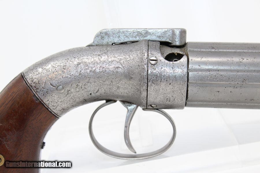 Description: ANTIQUE c1850 Allen & Thurber Bar Hammer PEPPERBOX First American Double Action Revolving Pistol Here we present an antique Allen & Thurber Bar Hammer Pepperbox Pistol, made circa the 1850s in Worcester, Massachusetts. Ethan Allen was already a prolific inventor and successful businessman in the 1830s when he came up with this design. Made from 1830-1865, these pistols enjoyed even greater popularity than Sam Colt’s first pistol. The history that these pistols enjoyed over the years is astounding: the Seminole Wars, Gold Rush, Mexican War and American Civil War. These guns are true relics of American history. The overall condition is good. The steel surfaces are semi-bright with clear markings. The grips are in very good condition. The bores are smooth and clean. The action is strong. Here is a nice example of one of the earliest successful revolver! Own the original! This is a legitimate antique and not a reproduction. Barrel is 4 inches. Caliber: .32 Percussion Overall condition as seen in photos. Very Fast. Very Safe. FREE SHIPPING WORLDWIDE. Delivered directly to your door by express mail! Guaranteed AUTHENTIC & Includes CERTIFICATE OF AUTHENTICITY. ancestryguns $895 #8372 SOLD Antique: Yes |