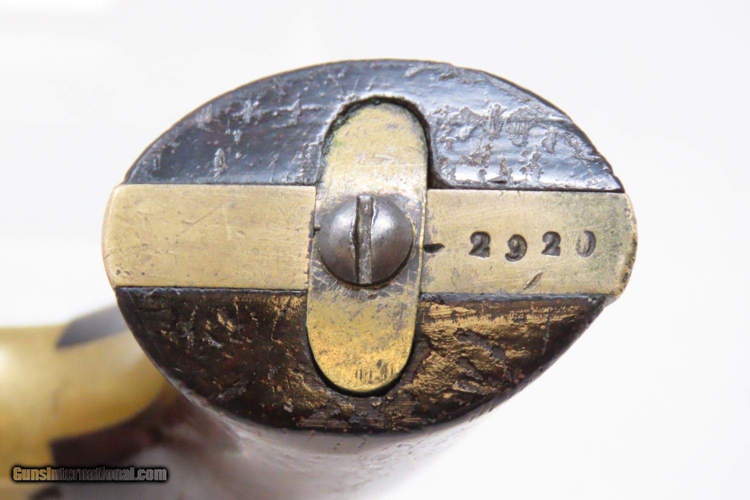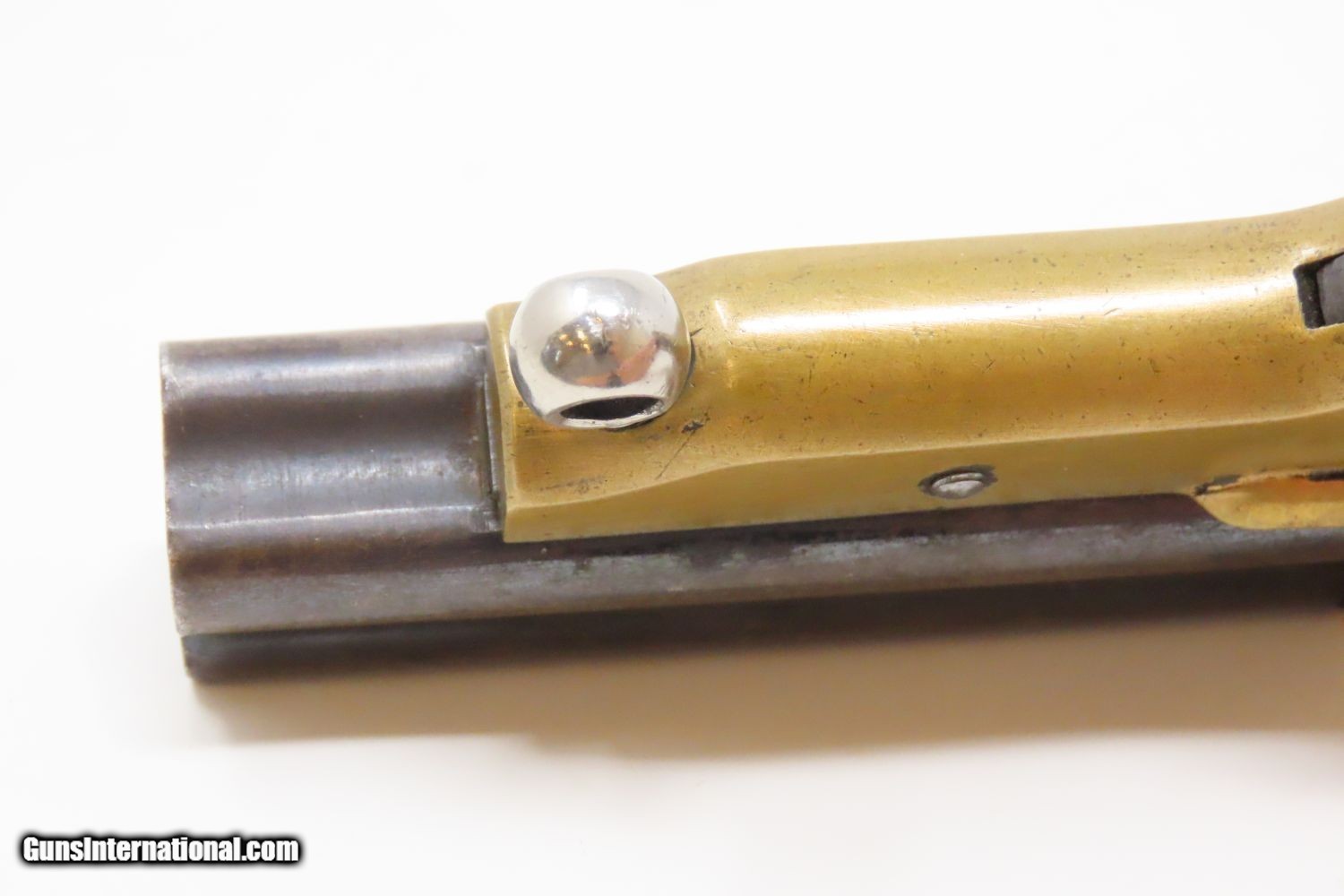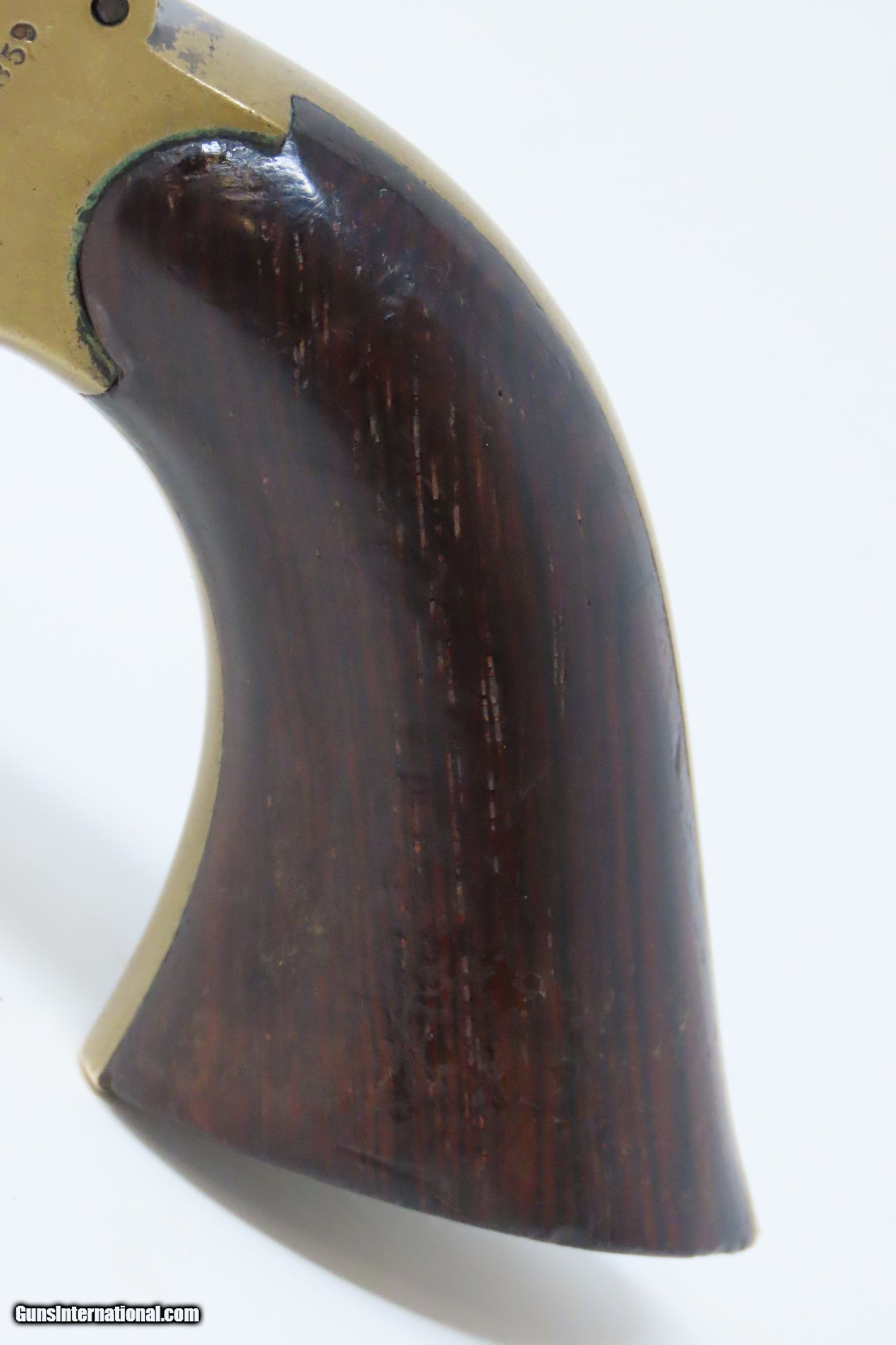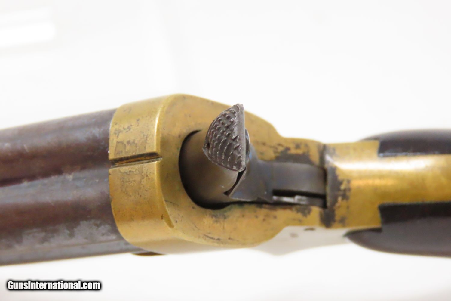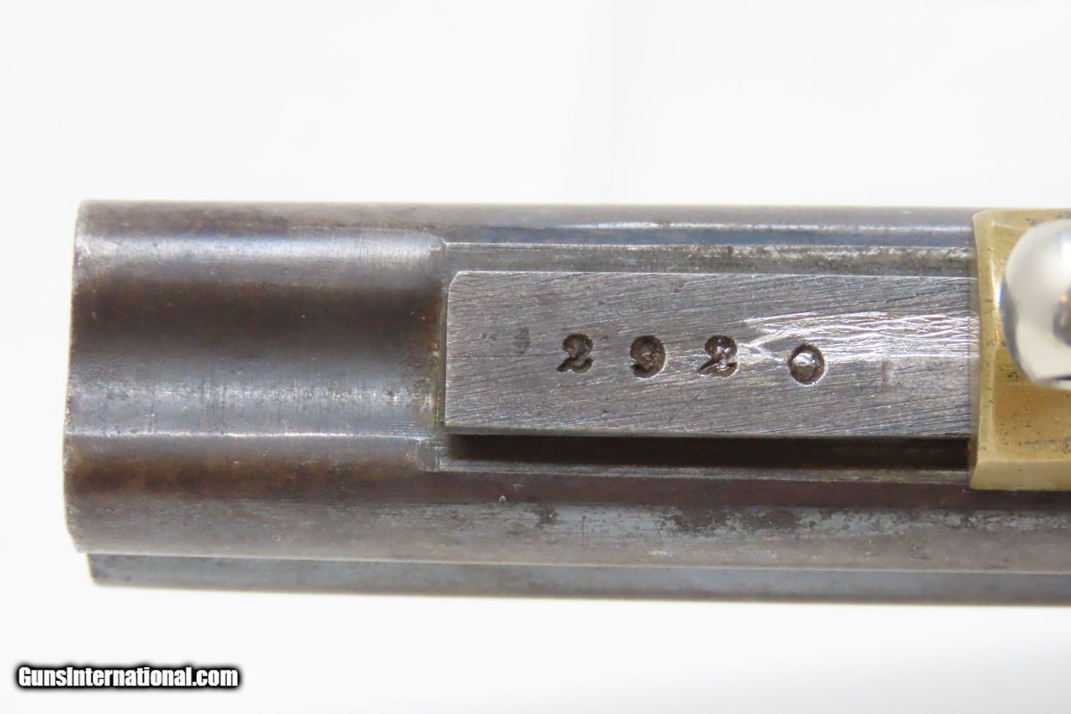 Description: Antique CIVIL WAR Era C. SHARPS Model 2 .30 Cal. Rimfire PEPPERBOX Revolver 4 Shot Self Defense Pocket Gun with Rosewood Grips Here we present an antique Sharps Model 2 Pepperbox Revolver in .30 Rimfire, made circa 1861 with a production run from 1859 to 1874 in Philadelphia, Pennsylvania. Christian Sharps invented his famously namesake large bore, breech-loading rifle in 1848, after practicing gun-making under John Hall at Harpers Ferry Armory. In 1859, he premiered another unique design in the 4-barreled pepperbox pistol with a unique revolving firing pin, made for 19th Century concealed carry. This repeating design was able to utilize the new rimfire ammunition like Smith & Wesson, without infringing on Smith & Wesson’s Rollin White Patent for bored through chambers on a revolver’s cylinder. This gave Sharps a leg up in the market since everyone else either had to produce single shot pistols, come up with an alternate ammunition and weapon design, or just stick with percussion until the patent expired. They made very nice, easy to use and compact firearms for 19th Century conceal and carry! The overall condition is very good. Original blue finish. Strong action, fully rotating firing pin. Good bores. Both grips are in good shape with an expected amount of wear. Numbers match. The barrel release is an ad hoc replacement. Own the original! This is a legitimate antique and not a reproduction. Barrel is 3 inches. Caliber: .30 Rimfire Overall condition as seen in photos. Very Fast. Very Safe. FREE SHIPPING WORLDWIDE. Delivered directly to your door by express mail! Guaranteed AUTHENTIC & Includes CERTIFICATE OF AUTHENTICITY. ancestryguns $1275 #210704 SOLD Antique: Yes |