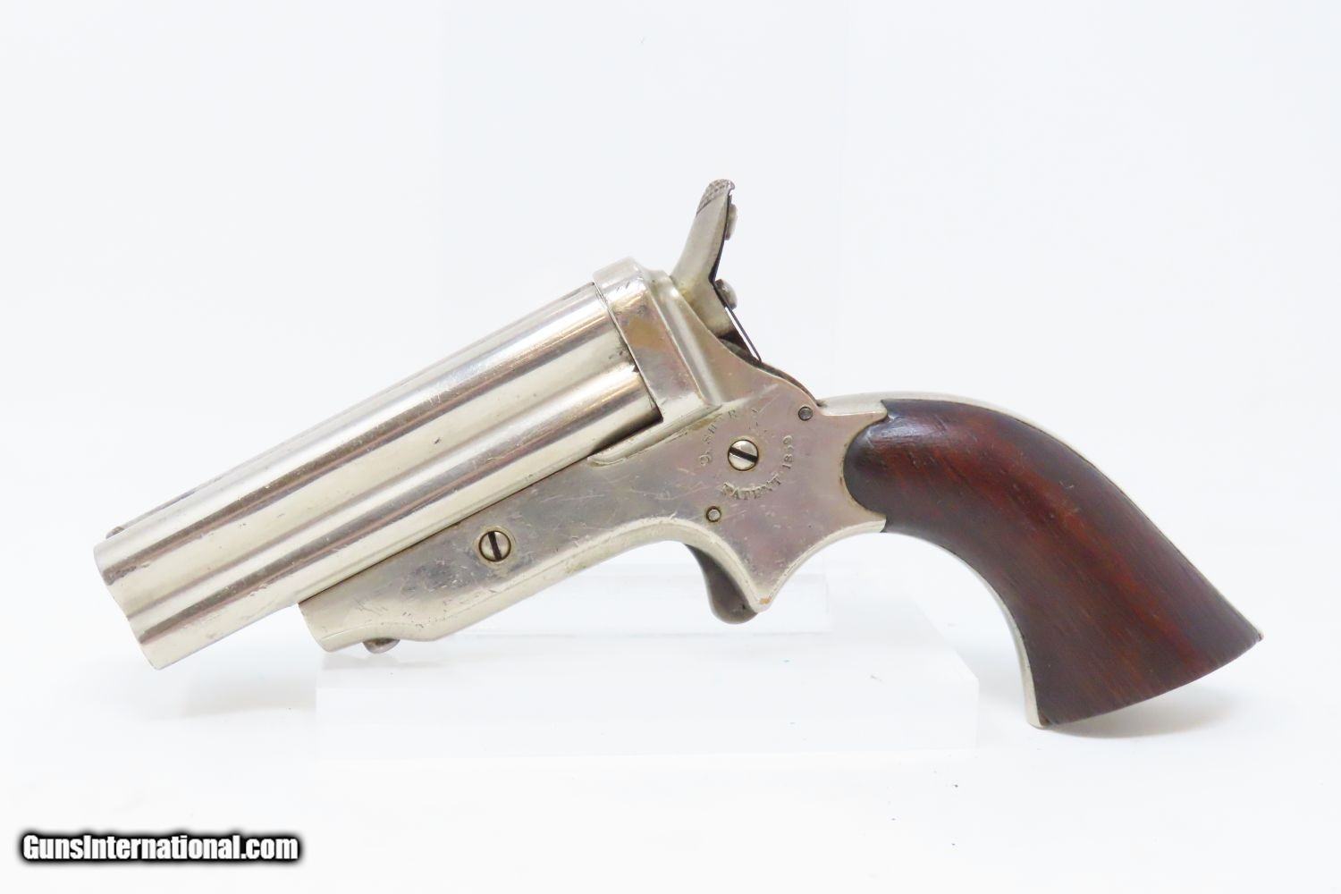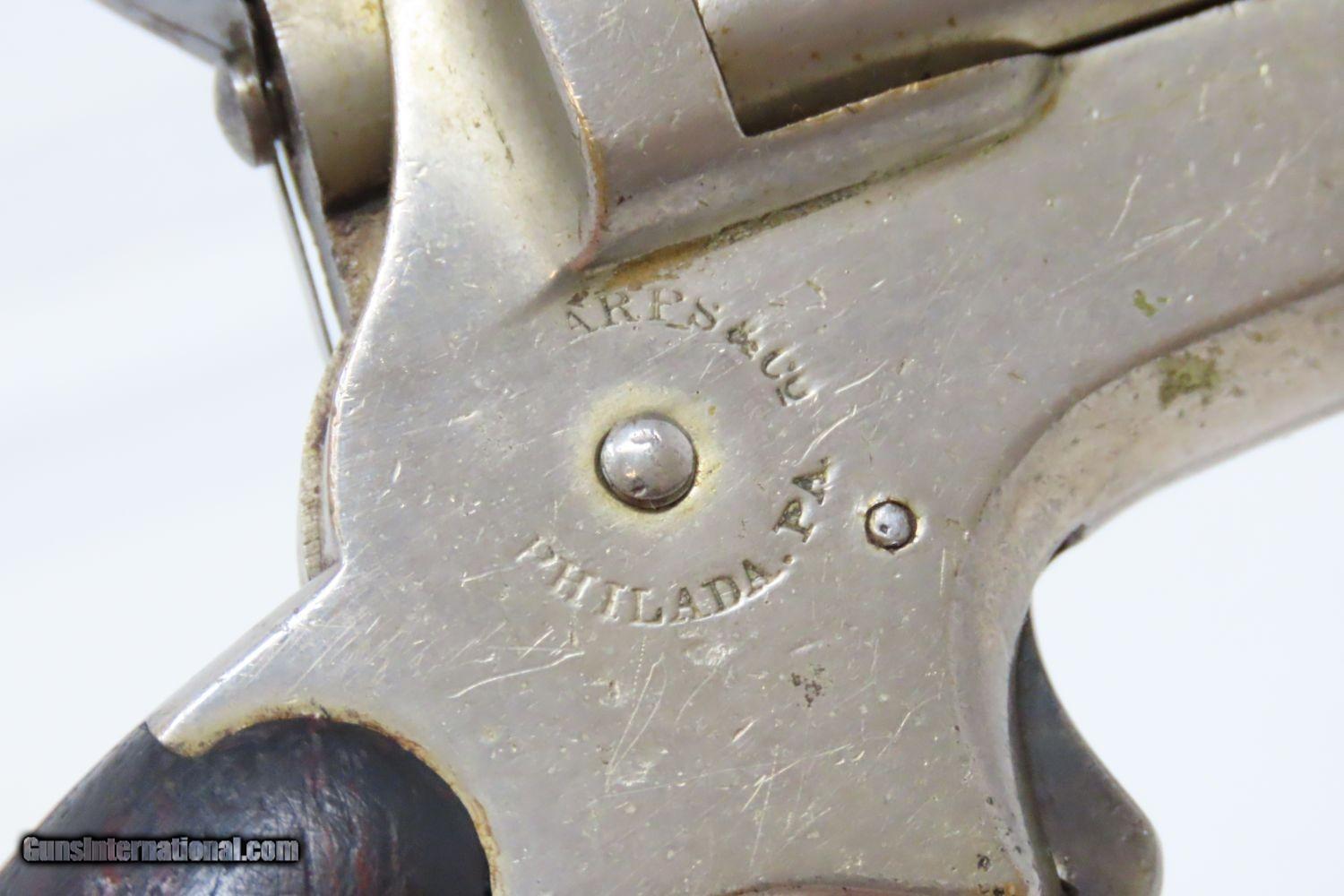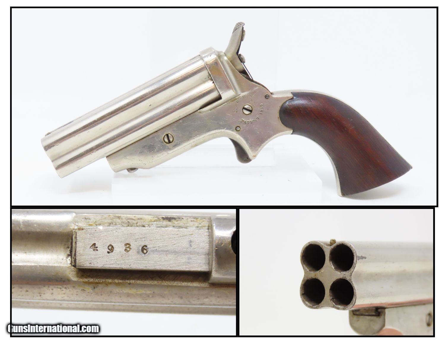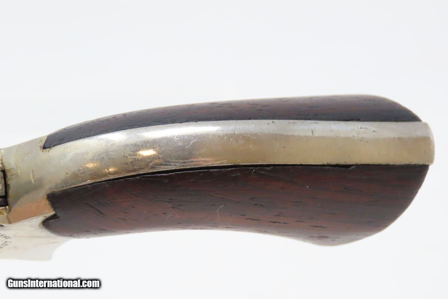 Description: Antique CIVIL WAR Era SHARPS Model 2 .30 Caliber Rimfire PEPPERBOX Revolver 4 Shot Self Defense Pocket Gun Here we present an antique C. Sharps Model 2 Pepperbox Revolver in .30 Rimfire, made circa 1859 to 1862 in Philadelphia, Pennsylvania. Christian Sharps invented his famously namesake large bore, breech-loading rifle in 1848, after practicing gun-making under John Hall at Harpers Ferry Armory. In 1859, he premiered another unique design in the 4-barreled pepperbox pistol with a unique revolving firing pin, made for 19th Century concealed carry. This repeating design was able to utilize the new rimfire ammunition like Smith & Wesson, without infringing on Smith & Wesson’s Rollin White Patent for bored through chambers on a revolver’s cylinder. This gave Sharps a leg up in the market since everyone else either had to produce single shot pistols, come up with an alternate ammunition and weapon design, or just stick with percussion until the patent expired. They made very nice, easy to use and compact firearms for 19th Century conceal and carry! The overall condition is near fine. The nickel finish is virtually complete. The action is strong and tight, although the hammer does not sit in its fully cocked position. The bores are bright with light frosting. Both grips are solid with minimal handling marks and well-defined grains. The markings are mostly legible, although have faded on the right frame. The numbers match. A gorgeous little pistol! Own the original! This is a legitimate antique and not a reproduction. Barrel is 3 inches. Caliber: .30 Rimfire Overall condition as seen in photos. Very Fast. Very Safe. FREE SHIPPING WORLDWIDE. Delivered directly to your door by express mail! Guaranteed AUTHENTIC & Includes CERTIFICATE OF AUTHENTICITY. ancestryguns $1145 #201246 SOLD Antique: Yes |