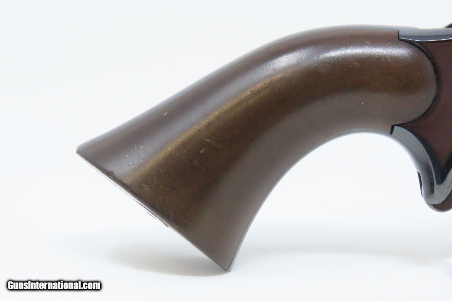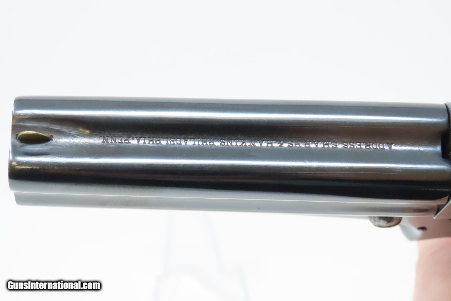 Description: Antique CIVIL WAR Era SHARPS Model 3 .32 Caliber Rimfire PEPPERBOX Revolver 4-Shot Self Defense Pocket Gun Here we present an antique Sharps & Hankins Model 3 Pepperbox Revolver in .32 Rimfire, made circa 1862 to 1867 in Philadelphia, Pennsylvania. Christian Sharps invented his famously namesake large bore, breech-loading rifle in 1848, after practicing gun-making under John Hall at Harpers Ferry Armory. In 1859, he premiered another unique design in the 4-barreled pepperbox pistol with a unique revolving firing pin, made for 19th Century concealed carry. This repeating design was able to utilize the new rimfire ammunition like Smith & Wesson, without infringing on Smith & Wesson’s Rollin White Patent for bored through chambers on a revolver’s cylinder. This gave Sharps a leg up in the market since everyone else either had to produce single shot pistols, come up with an alternate ammunition and weapon design, or just stick with percussion until the patent expired. They made very nice, easy to use and compact firearms for 19th Century conceal and carry! The overall condition is very good. Nicely refinished; virtually complete blue finish. The action is strong and the firing pin rotates properly. The bores are in good shape. All numbers match with the markings remaining clear. The grips are firm. Here is a wonderful little pistol to collect and display! Own the original! This is a legitimate antique and not a reproduction. Barrel is 3-1/2 inches. Caliber: .32 Rimfire Overall condition as seen in photos. Very Fast. Very Safe. FREE SHIPPING WORLDWIDE. Delivered directly to your door by express mail! Guaranteed AUTHENTIC & Includes CERTIFICATE OF AUTHENTICITY. ancestryguns $1375 #201264 SOLD Antique: Yes |