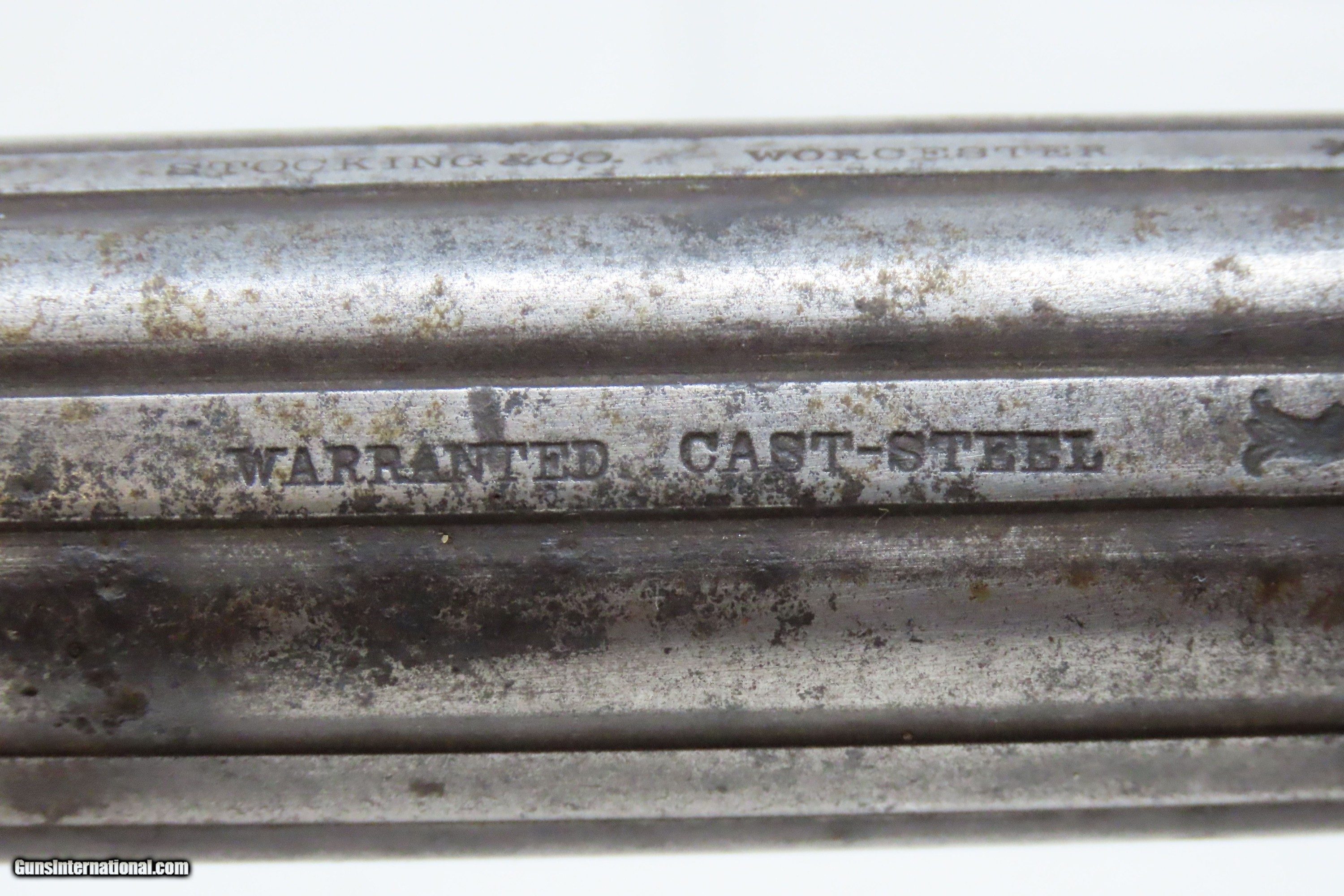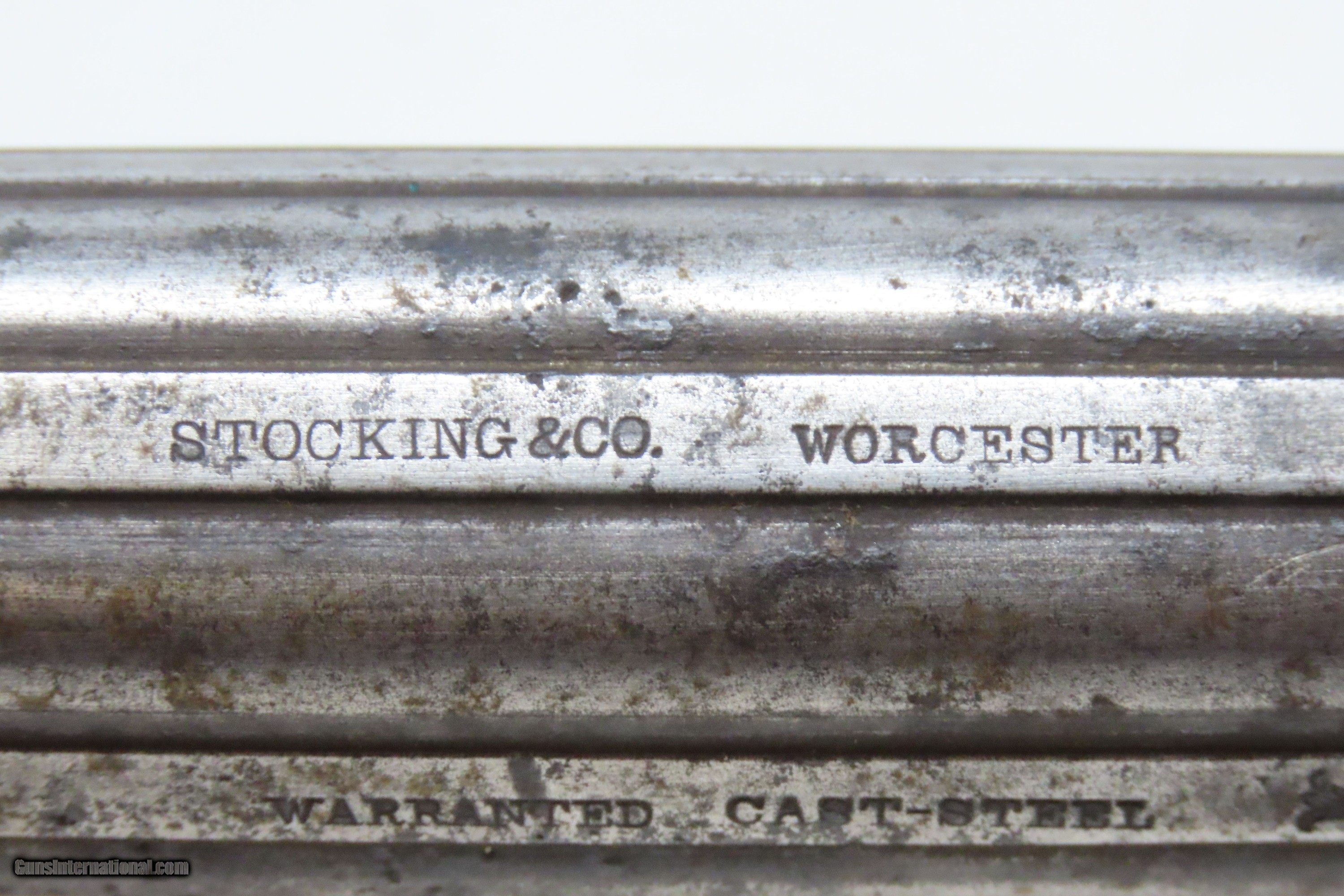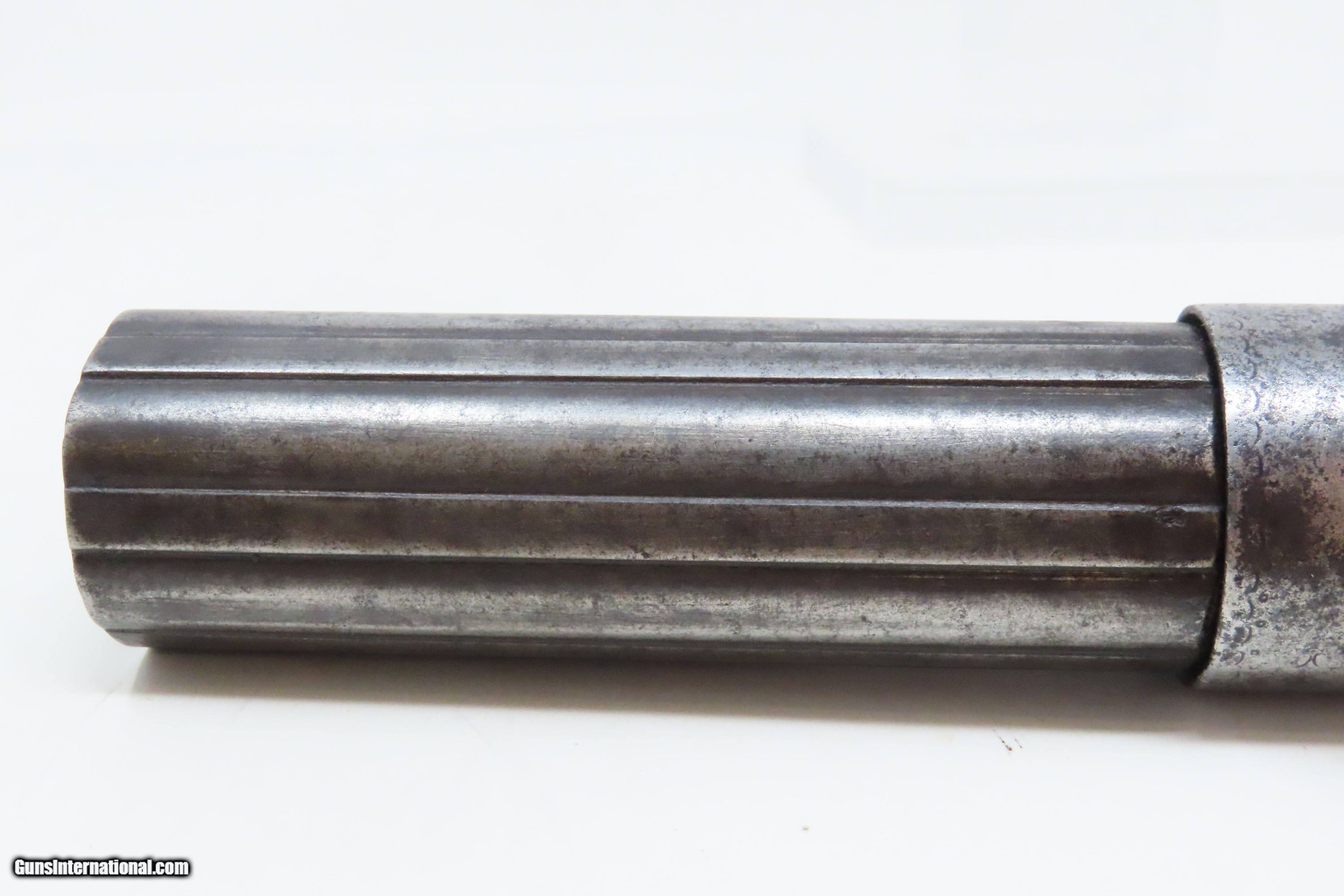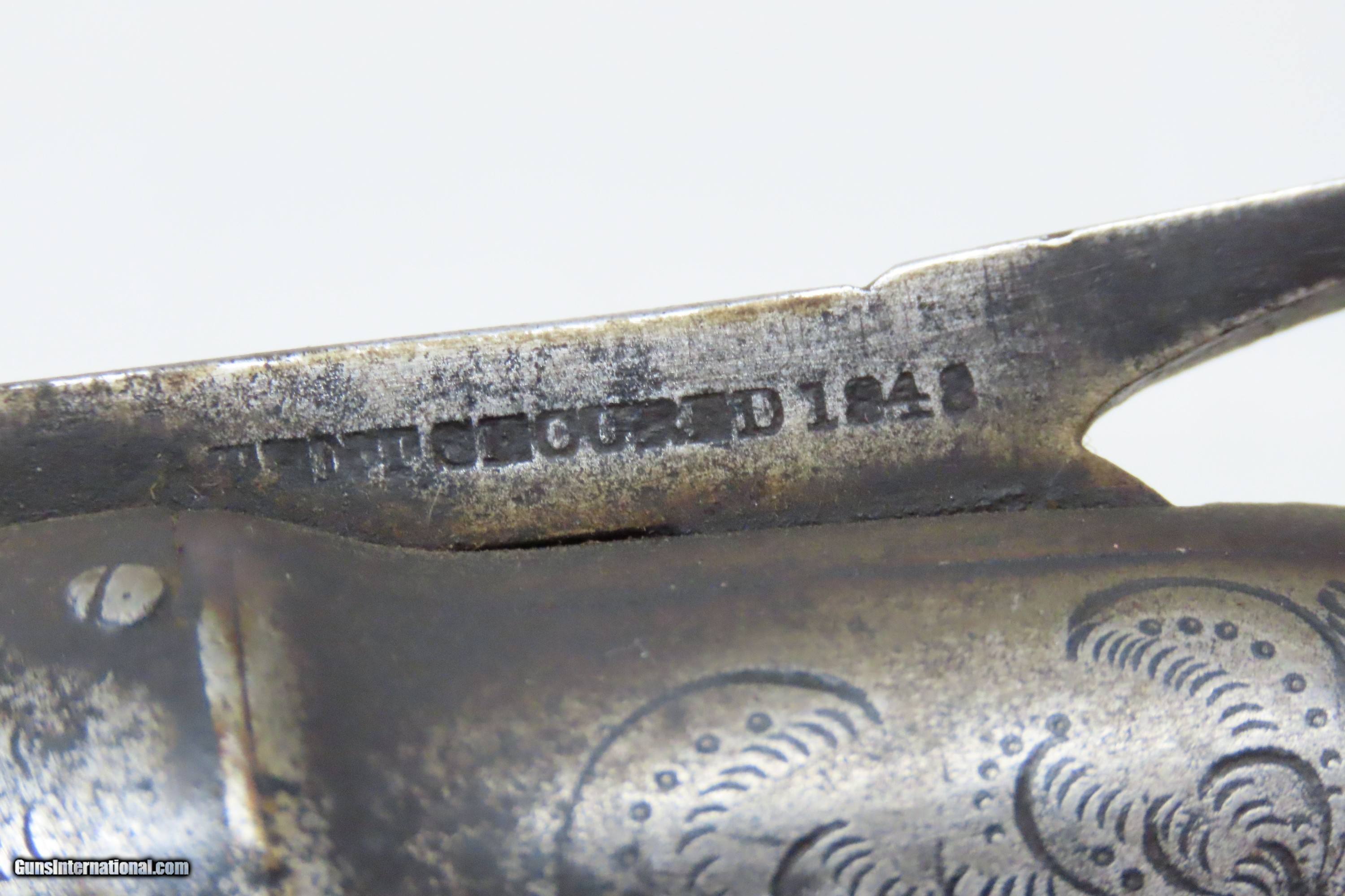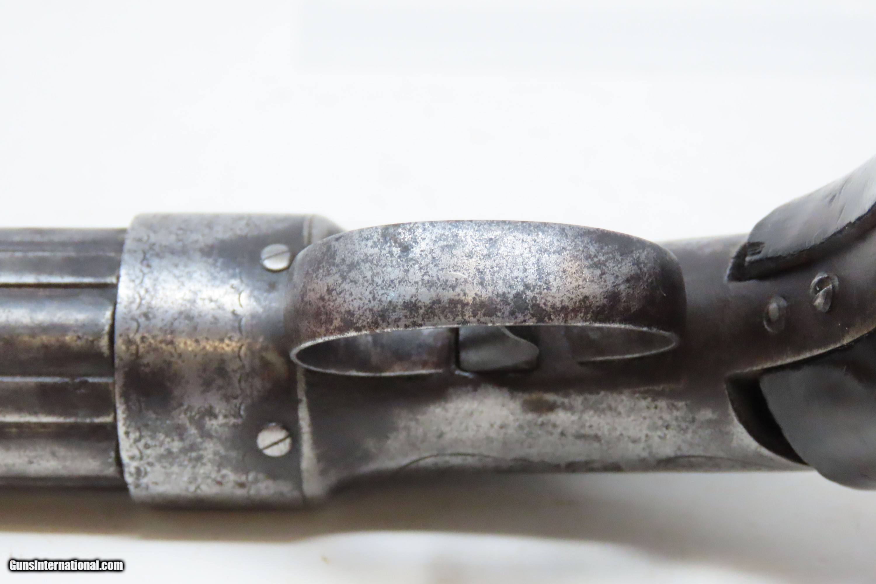 Description: Antique STOCKING & Co. .28 Percussion PEPPERBOX Point & Shoot BELLY GUN ENGRAVED Pre-CIVIL WAR Era 6-Shot Pepperbox Here we present an antique Engraved Stocking & Co. Single Action Pocket-Sized Percussion Pepperbox Revolver, manufactured circa 1849-1852 in Worcester, Massachusetts. These guns were single action, bar hammer pistols with 6-shot ribbed barrel clusters that were typically between 3” and 6” in length. The guns were available in .28, .31 and .36 caliber variants, and were produced with and without a nipple shield around the breech. Most were manufactured with nipples that were integral with the barrels, but removable nipples versions were made on a limited basis. Standard finish was blued barrels and frames with a case hardened hammer and two-piece walnut grip. The guns were batch or assembly numbered, and no records survive to indicate the total number of arms produced. According to Frank Seller’s “American Gunsmiths” the firm was only in business between 1849 and 1852, and it is generally believed that only a few hundred Stocking & Company pepperboxes were produced. Today, the Stocking & Company pepperboxes are quite rare and are prized additions to collections of American made pepperbox pistols. The bar hammer did preclude the inclusion of usable sights. As these were considered “point and shoot” short range defensive weapons or “belly guns”, the market did not seem to object to the limitation of not having sights. The history that pepperbox pistols enjoyed over the years is astounding: the Seminole Wars, Gold Rush, Mexican War and American Civil War. These guns are true relics of American history. The overall condition is good. The action functions but does not index properly every time. Some nipples are not intact. Good bores. All bores appear to have debris obstructions near the breech. Legible markings. Lightly engraved frame. Both grips are not seated fully, but are in good shape overall. Own the original! This is a legitimate antique and not a reproduction. Barrel is 4 inches. Caliber: .28 Percussion Overall condition as seen in photos. Very Fast. Very Safe. FREE SHIPPING WORLDWIDE. Delivered directly to your door by express mail! Guaranteed AUTHENTIC & Includes CERTIFICATE OF AUTHENTICITY. ancestryguns $1200 #233622 SOLD Antique: Yes |