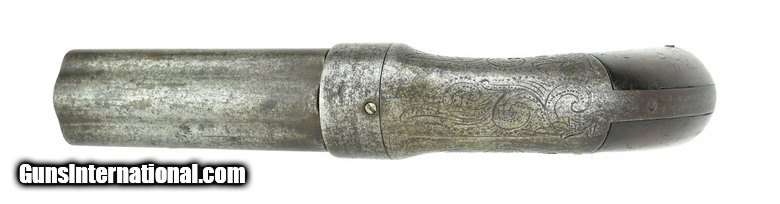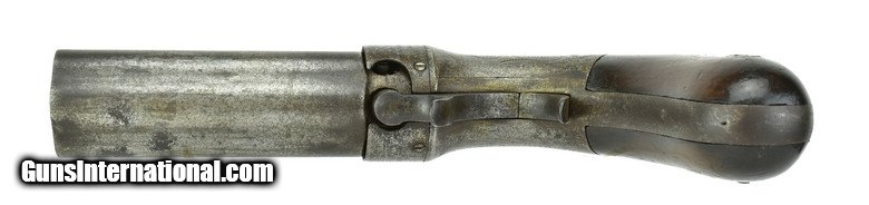 Description: Bacon Underhammer Percussion Pepperbox. Made circa 1855. .31 Caliber 6-shot with 4” barrels. Unusual design with a single action underhammer. Metal has a light gray to brown patina. Wood grips are good. Gun is unmarked. Actions works well. SOLD Antique: Yes |