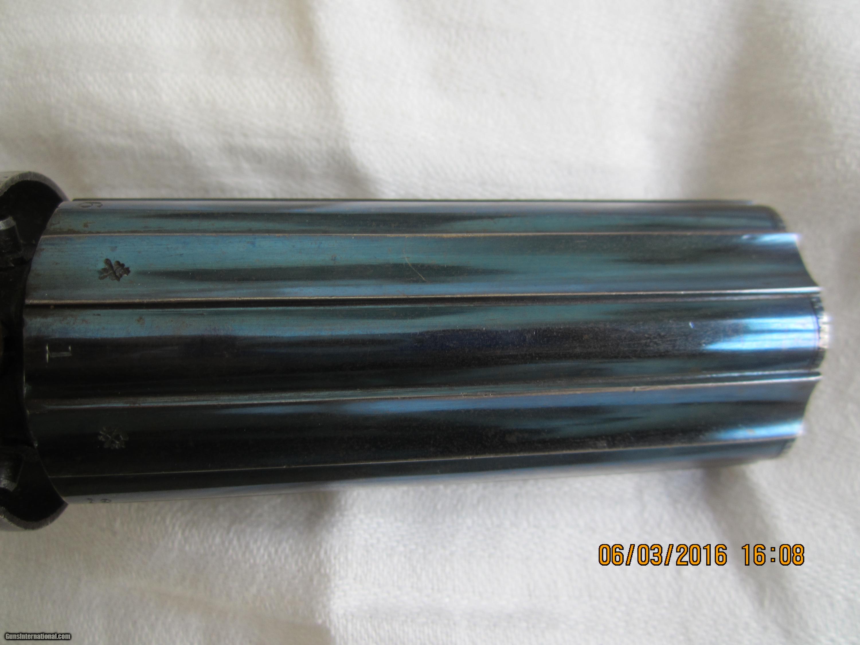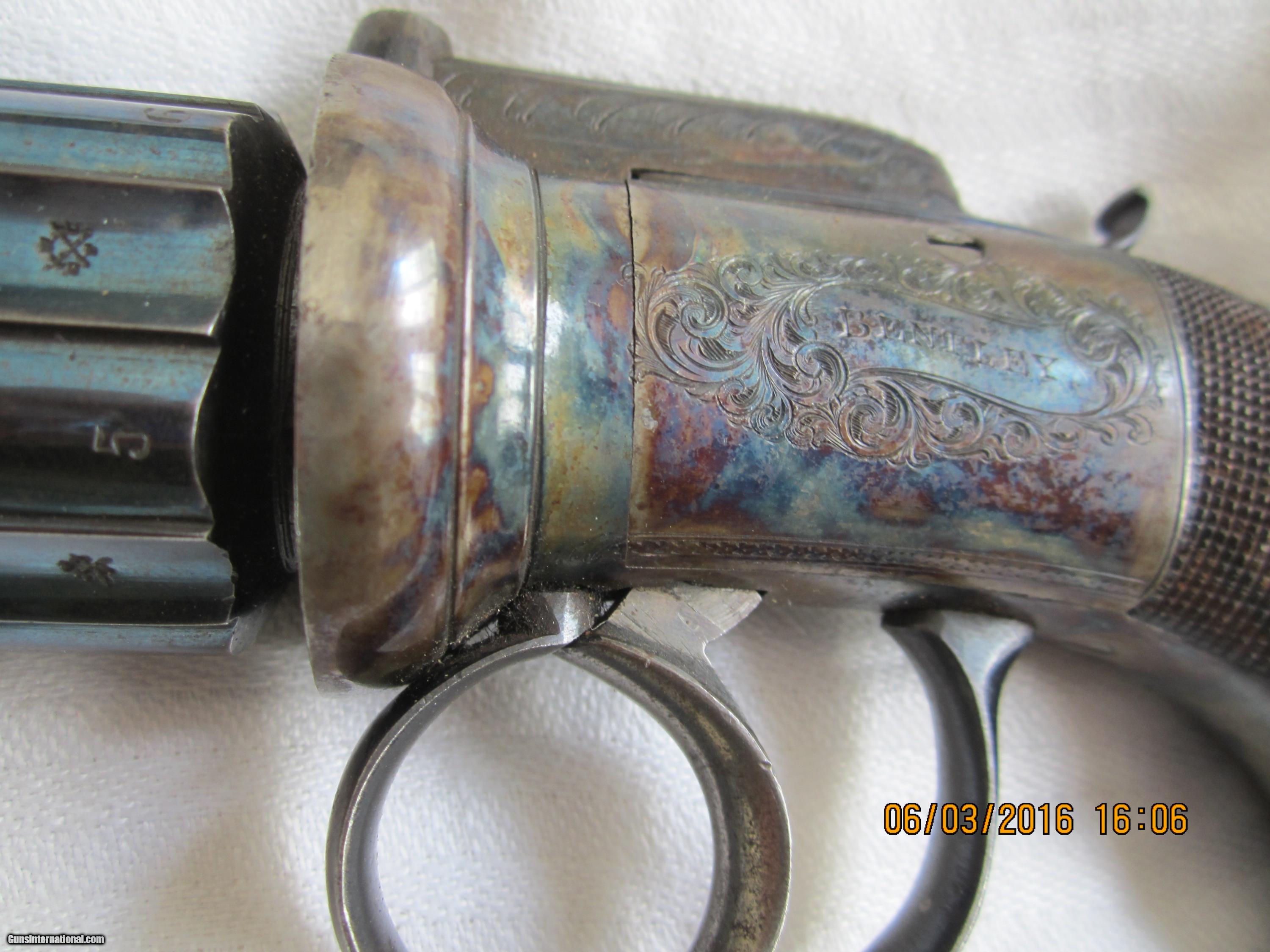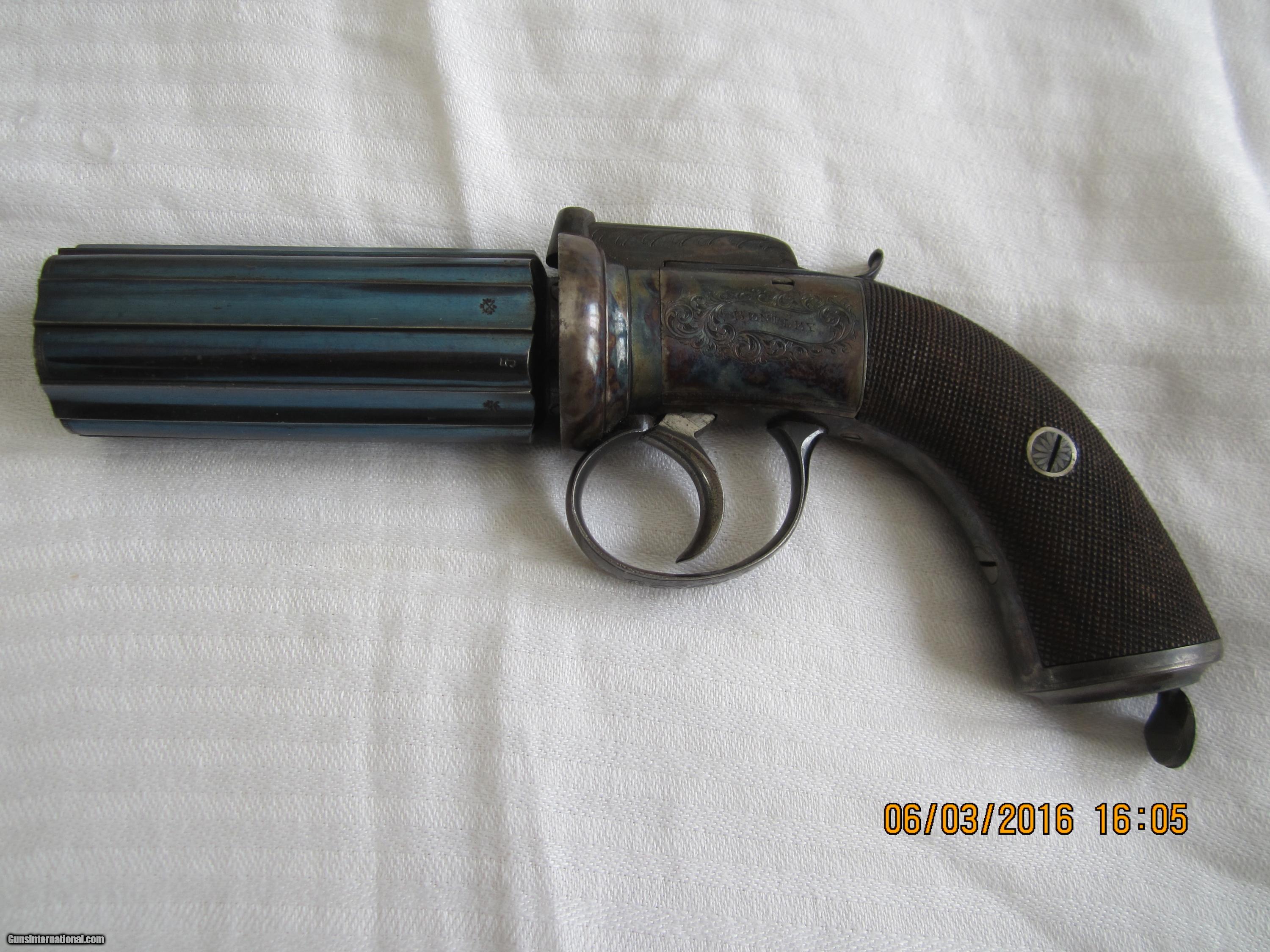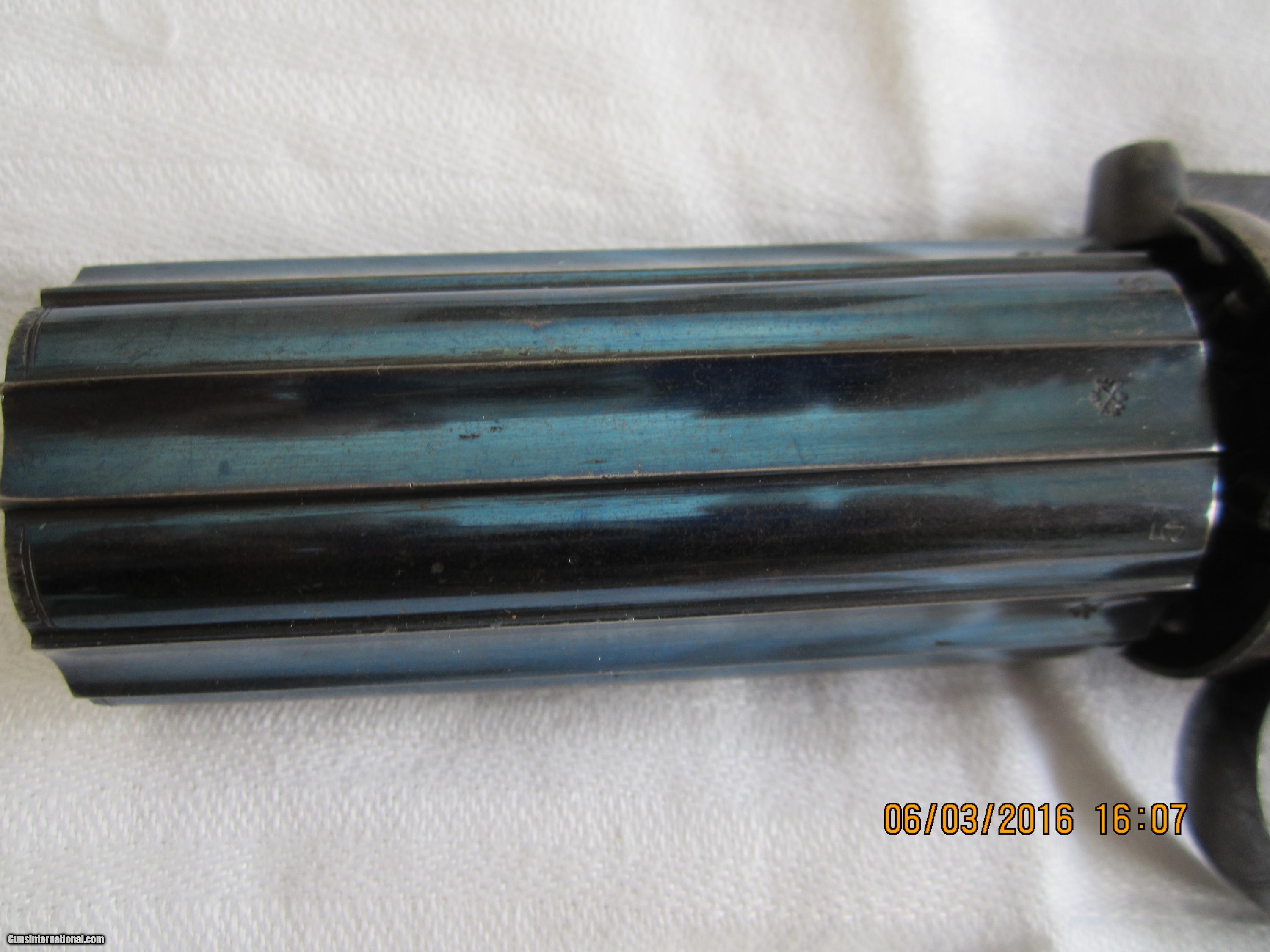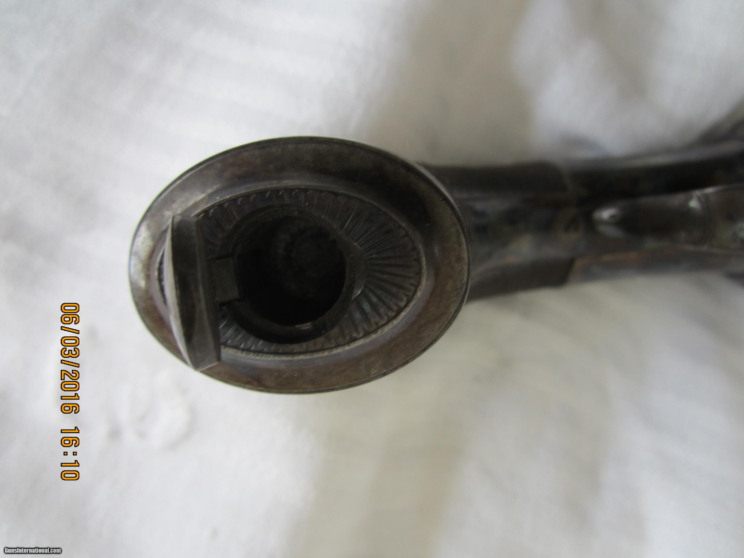 Description: Probably the nicest pepperbox you will ever find. It really looks like it was made yesterday. This is the ultimate find for a collector of fine English pepperboxes or for a discerning collector who appreciates quality and wants to own the finest on the market. This pistol has seen little, if any use. It could be unfired. The 6 blued barrels are numbered 1 to 6 and are 3 & 1/2" long. The overall length of this pistol is 8 & 3/4". The barrels are all tight, there is no play and they revolve properly when the percussion hammer is moved by the trigger. The action is strong. The rest of the metal including the action, trigger guard, grip straps, butt cap and cap box cover in the bottom of the grip are all case colored and retain 99%+ of the beautiful multi-colors.There is a safety and it works properly. The walnut grips are finely checkered. All of the percussion caps are in good condition. The overall condition of this pistol is 99%+. The lock, hammer, butt cap, trigger guard and barrel screw are all engraved. John Bentley worked from a shop in London, England from 1852 to 1885 under his own name and then from 1885 to 1900 under the name Bentley & Playfair. This is an antique, so it can be sent dierectly to a new proud owner I have owned it for 45 years. SOLD Antique: Yes Manufacturer: BENTLEY Model: Pepperbox (6 shot) Serial Number: none Caliber Info: .36 Condition: EXCELLENT Metal Condition: EXCELLENT Wood Condition: EXCELLENT Bore Condition: EXCELLENT Barrels: 6 Barrel Type: round -sculptured Action: percussion Triggers: one Stock: checkered Finish: Blued Sights: none Manufacture Date: circa 1860 Engraving: yes Item Location: California |