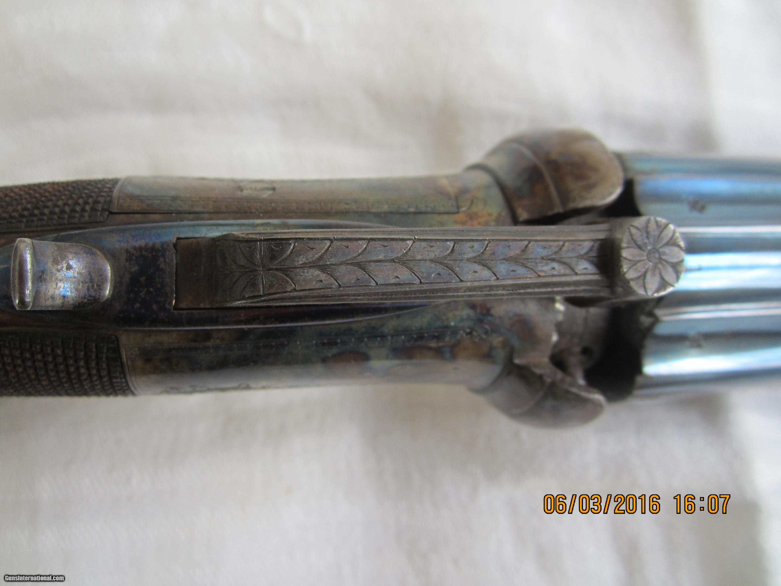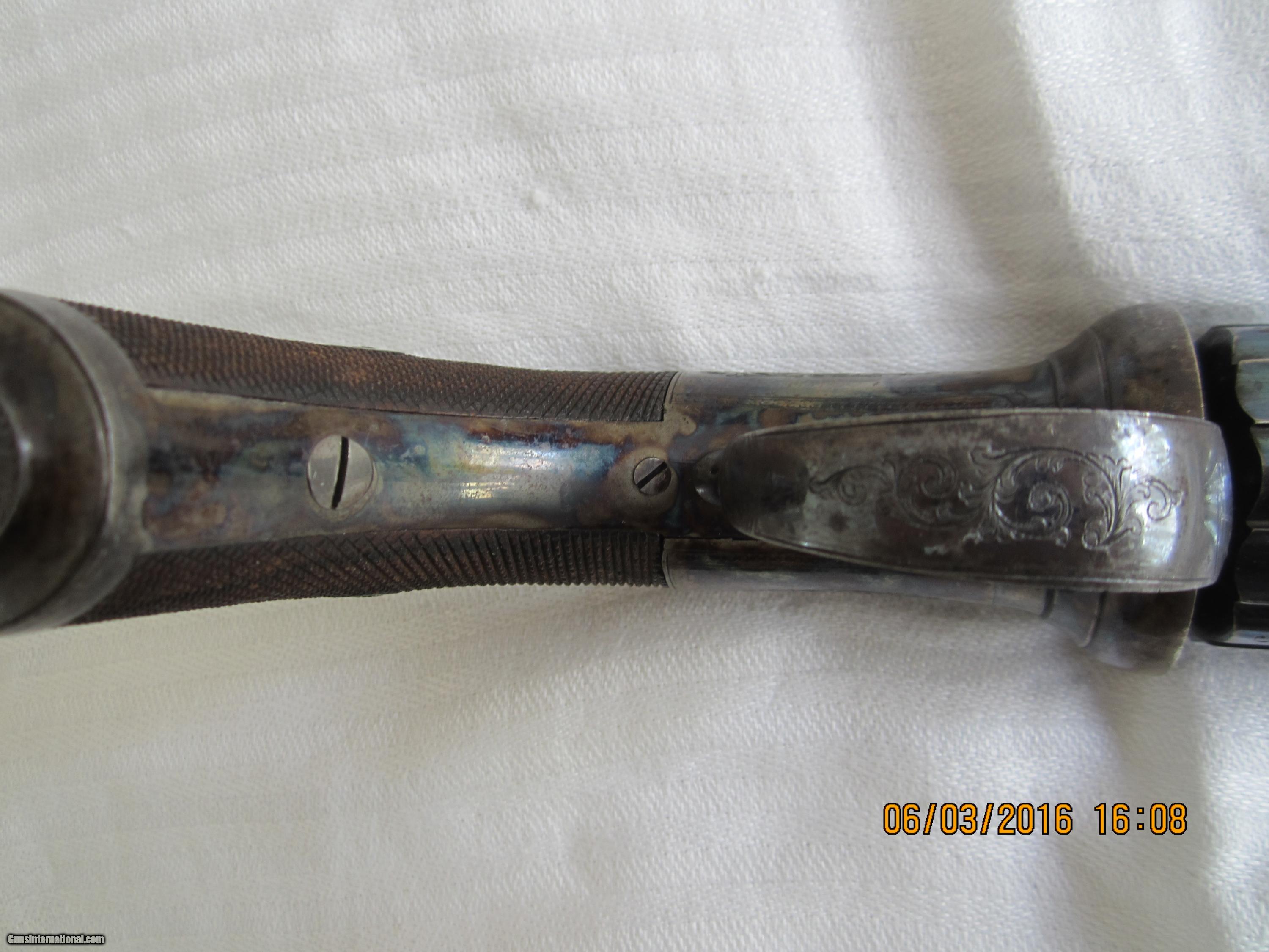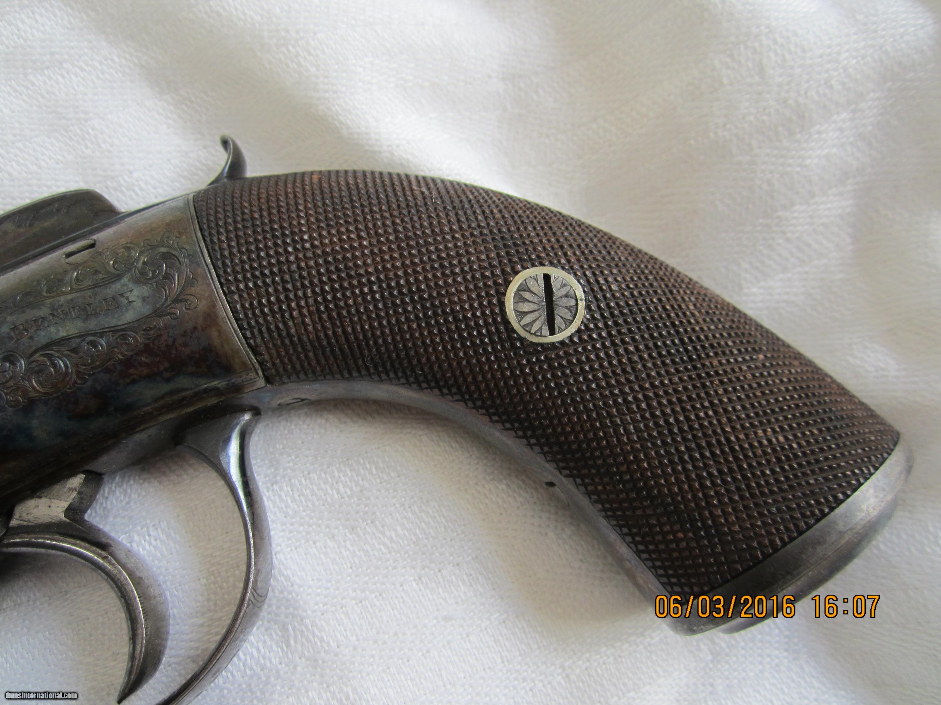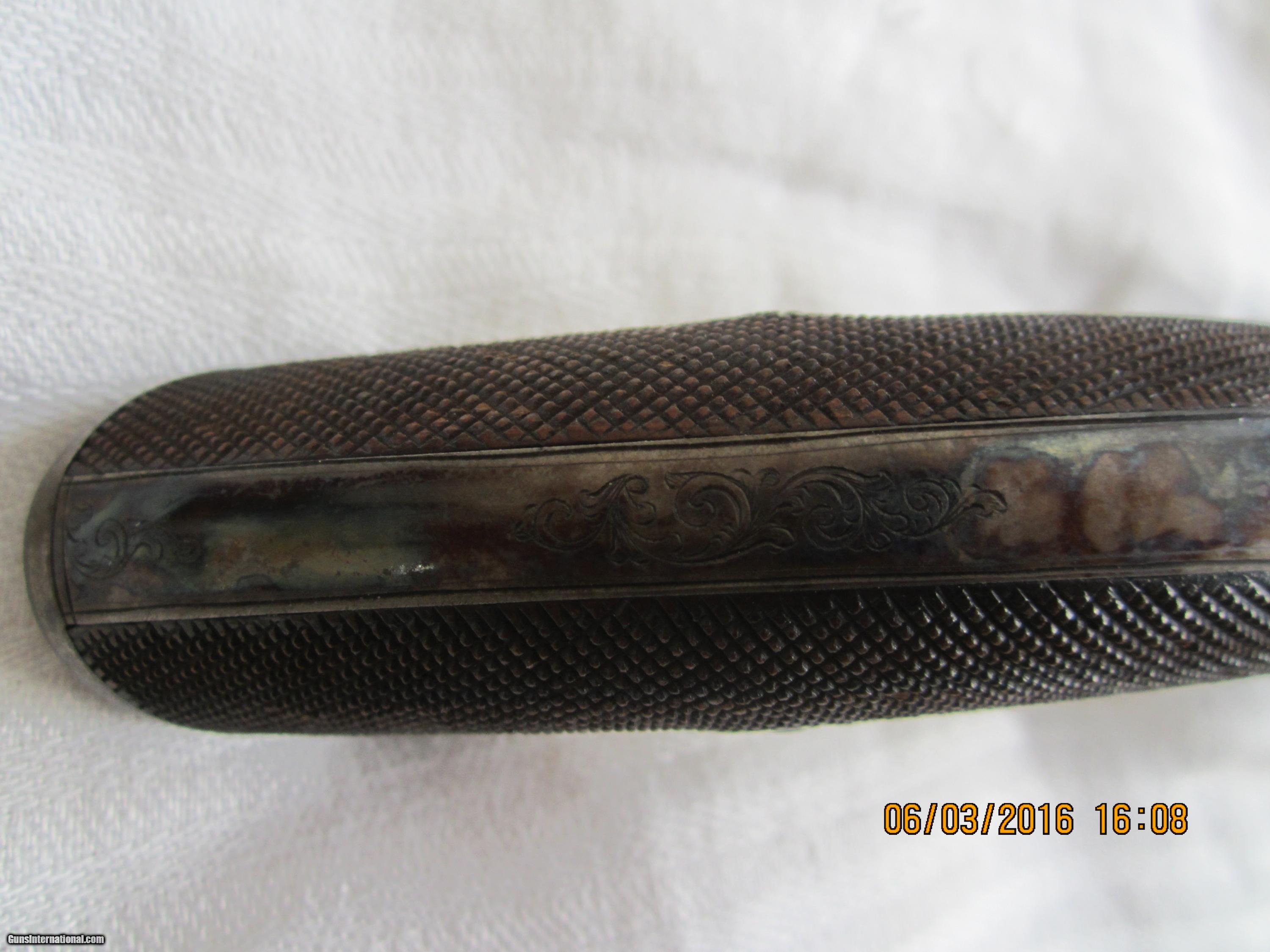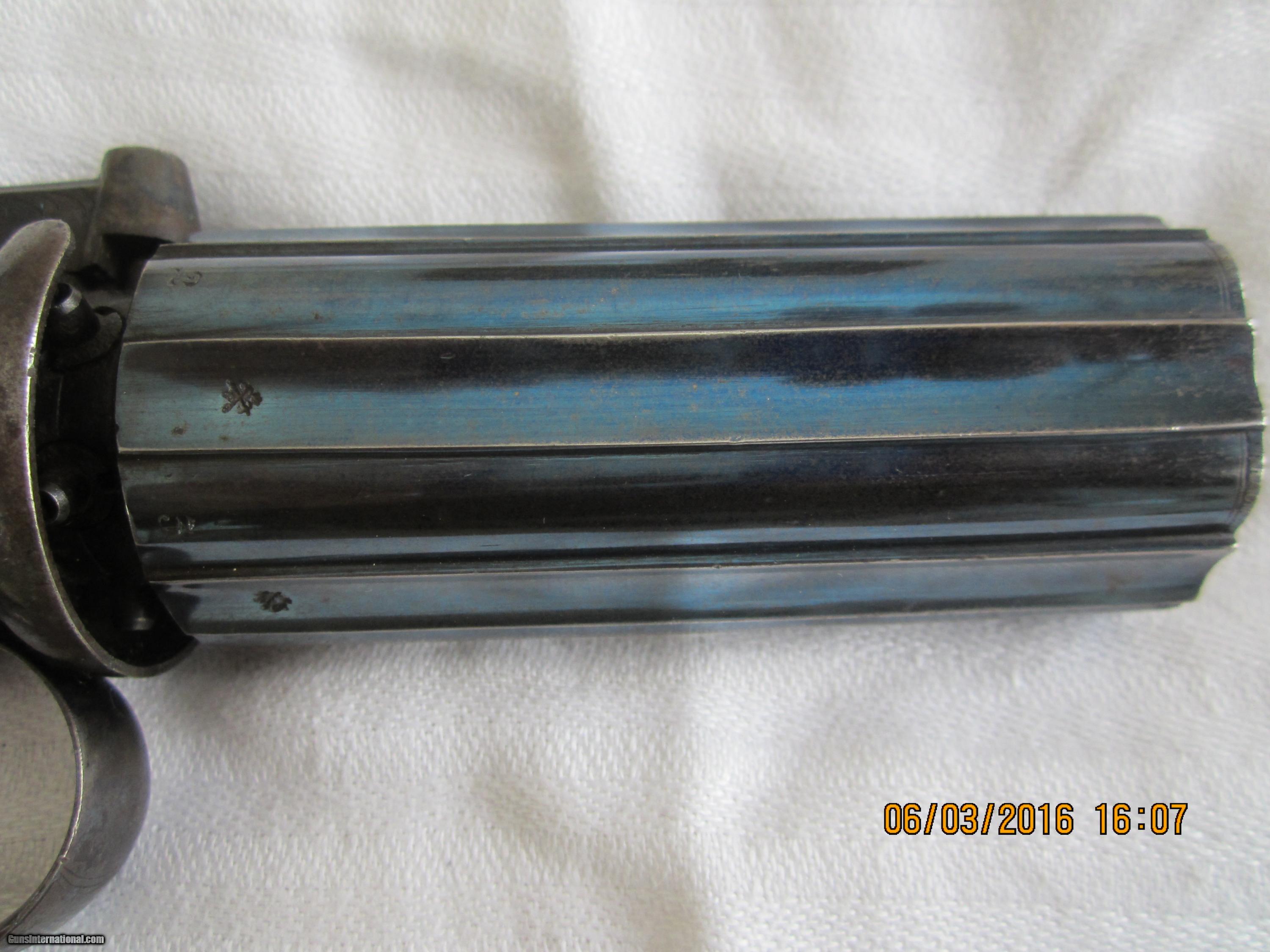 Description: Probably the nicest pepperbox you will ever find. It really looks like it was made yesterday. This is the ultimate find for a collector of fine English pepperboxes or for a discerning collector who appreciates quality and wants to own the finest on the market. This pistol has seen little, if any use. It could be unfired. The 6 blued barrels are numbered 1 to 6 and are 3 & 1/2" long. The overall length of this pistol is 8 & 3/4". The barrels are all tight, there is no play and they revolve properly when the percussion hammer is moved by the trigger. The action is strong. The rest of the metal including the action, trigger guard, grip straps, butt cap and cap box cover in the bottom of the grip are all case colored and retain 99%+ of the beautiful multi-colors.There is a safety and it works properly. The walnut grips are finely checkered. All of the percussion caps are in good condition. The overall condition of this pistol is 99%+. The lock, hammer, butt cap, trigger guard and barrel screw are all engraved. John Bentley worked from a shop in London, England from 1852 to 1885 under his own name and then from 1885 to 1900 under the name Bentley & Playfair. This is an antique, so it can be sent dierectly to a new proud owner I have owned it for 45 years. SOLD Antique: Yes Manufacturer: BENTLEY Model: Pepperbox (6 shot) Serial Number: none Caliber Info: .36 Condition: EXCELLENT Metal Condition: EXCELLENT Wood Condition: EXCELLENT Bore Condition: EXCELLENT Barrels: 6 Barrel Type: round -sculptured Action: percussion Triggers: one Stock: checkered Finish: Blued Sights: none Manufacture Date: circa 1860 Engraving: yes Item Location: California |