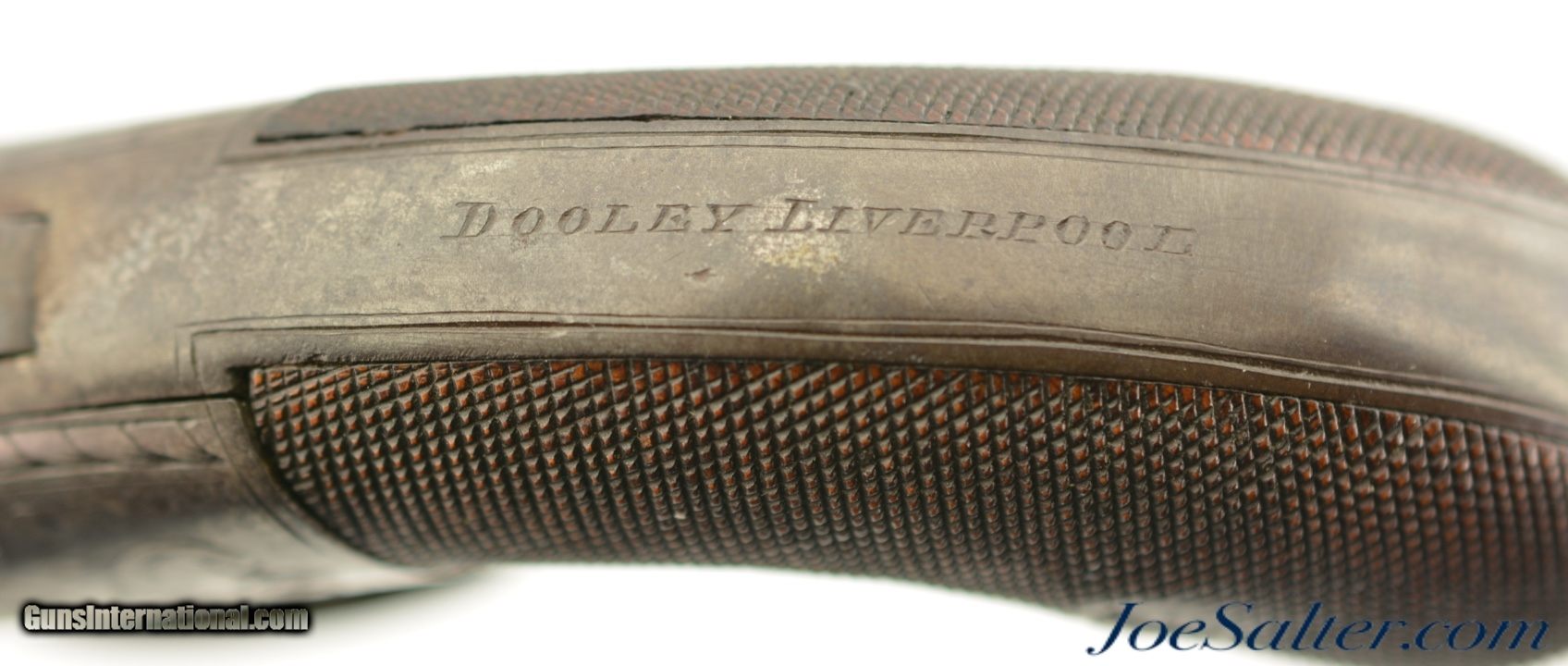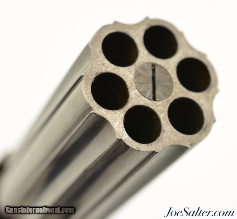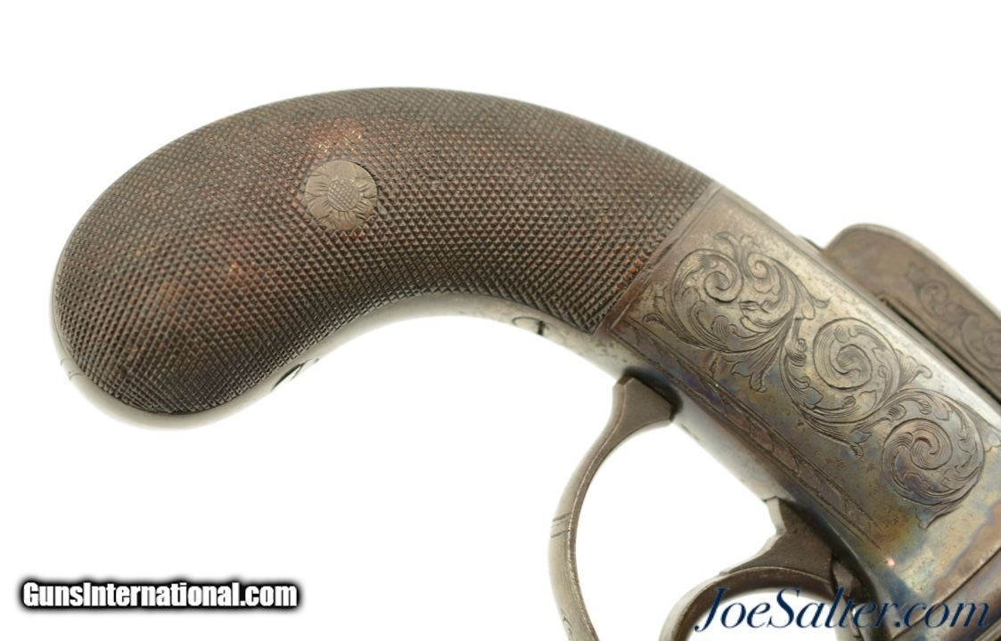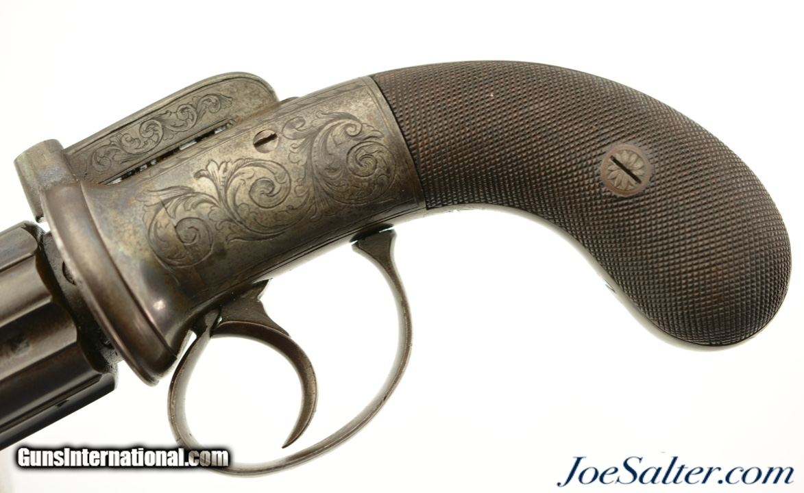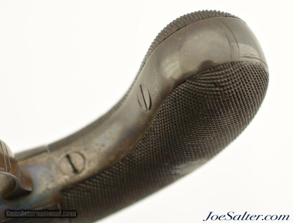 Description: NSN, .36 Caliber, 3 1/2" barrels with fine, bright bores having some mild freckling along their lengths. This is a truly handsome pistol that retains 70-75% of the original muted color case-hardening on the metal, including the barrel cluster, which was not blued. The frame, hammer, and trigger guard have crisp floral scrollwork engraving, while the flared recoil shield retains stronger original color case-hardening around the exterior. The backstrap is maker marked: "DOOLEY LIVERPOOL." The bag-shaped grip has walnut panels with extremely fine checkering, and exhibits only minor wear and flattening of the points. The action is tight and functions flawlessly. This is a great-looking British pepperbox, and in excellent overall condition. Antique SOLD Antique: Yes |