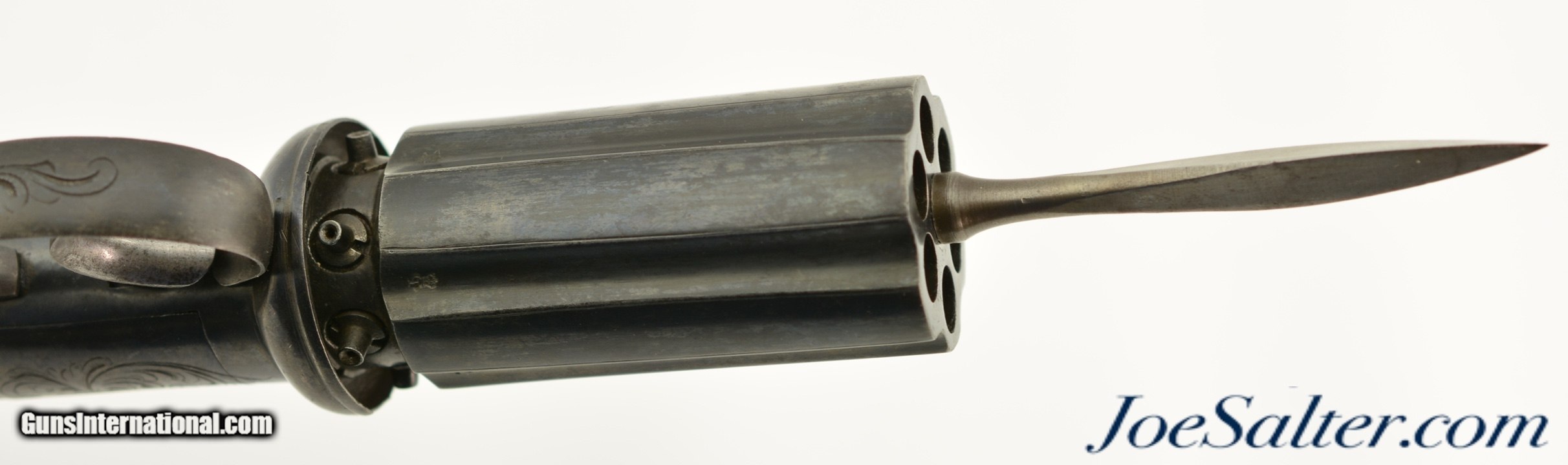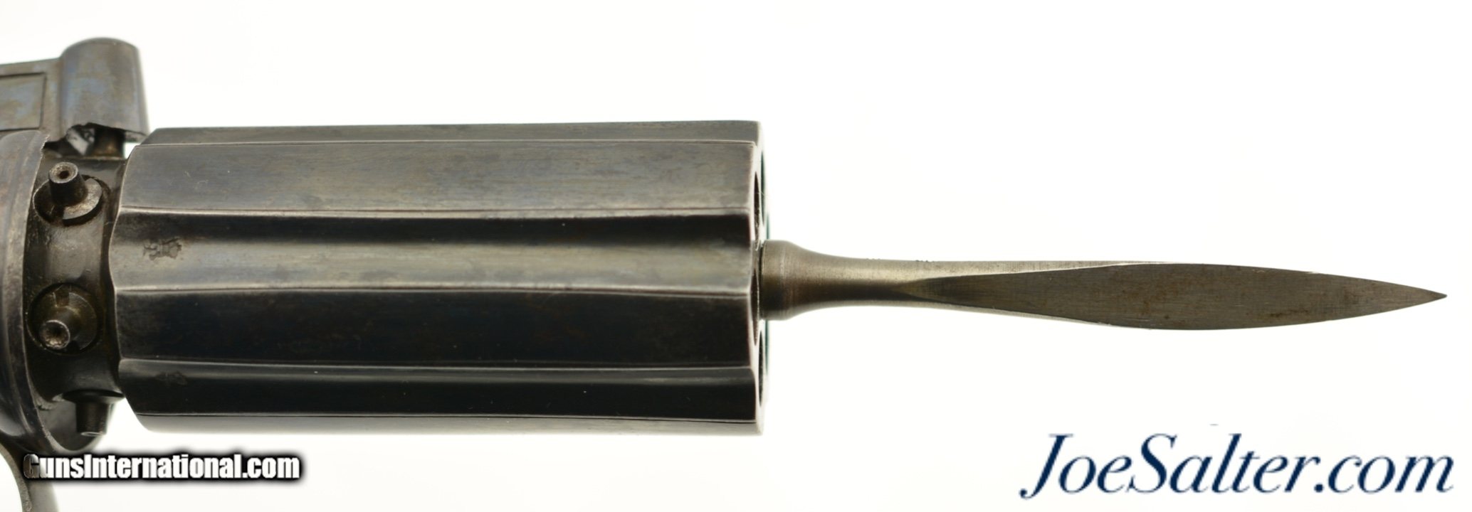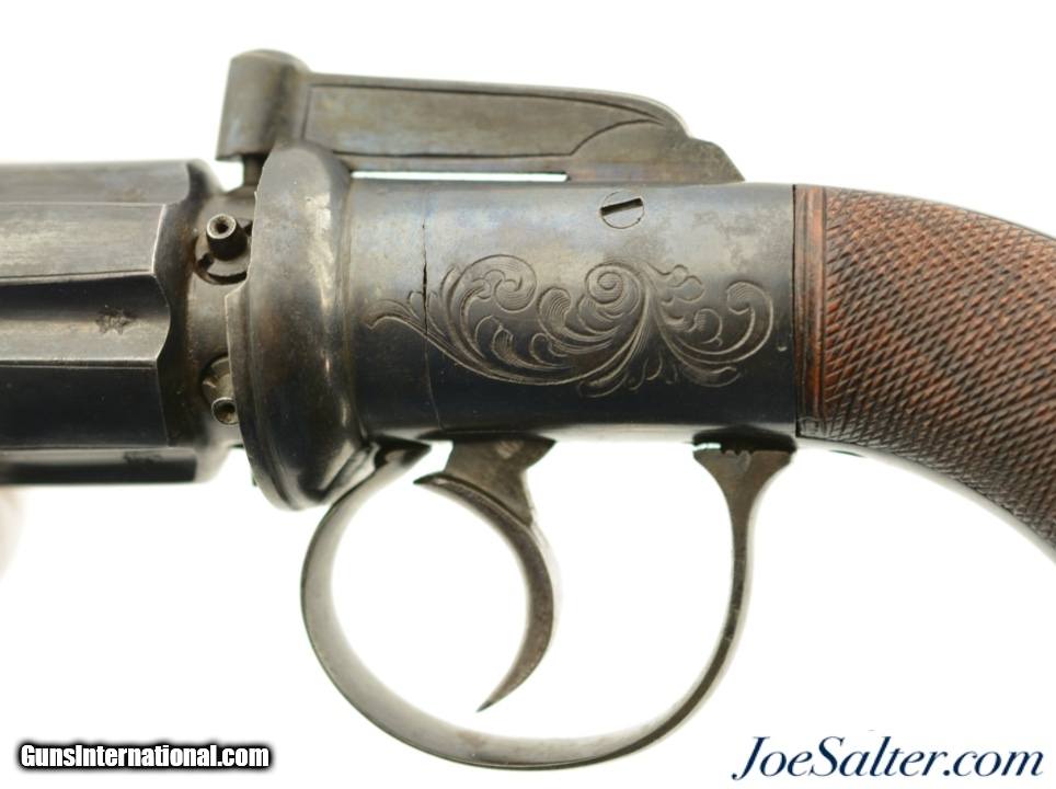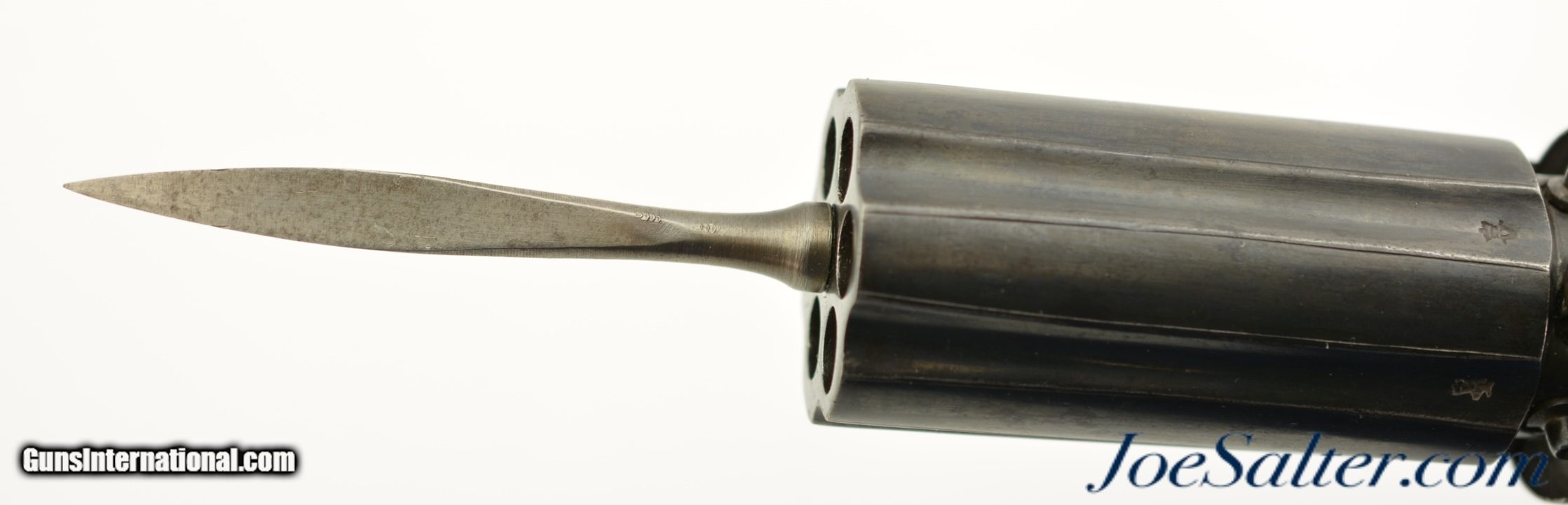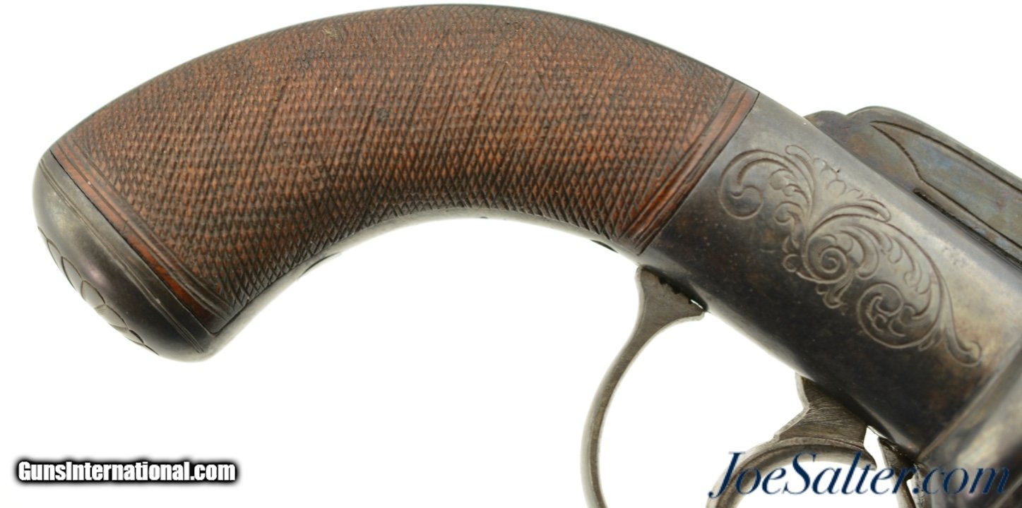 Description: NSN, .36 Caliber, 2 7/8" barrels with fine, bright bores having some mild freckling along their lengths. This is a great looking pistol that has most of an old, reapplied blue finish remaining, turning to an overall smooth plum-brown patina with scattered small spots of freckling and very mild surface oxidation scattered about. The frame, hammer, and trigger guard have crisp floral scrollwork engraving, while the barrel cluster has equally crisp London proofs. An original leaf-shaped, angular blade, 3 1/8" long and having three smooth, unground faces, is mounted to the center of the barrel cluster at the muzzles. The blade is finished in-the-white, and has developed a slightly mottled, pewter gray patina over time. There is no maker’s marking, and the backstrap is simply marked: "LONDON." The grip has nicely burled walnut panels with extremely fine checkering, and exhibits only minor wear and flattening of the points. The action is tight and functions flawlessly. This is a great-looking British pepperbox, with an extremely rare accessory, and is in fine-near excellent overall condition. Antique SOLD Antique: Yes |