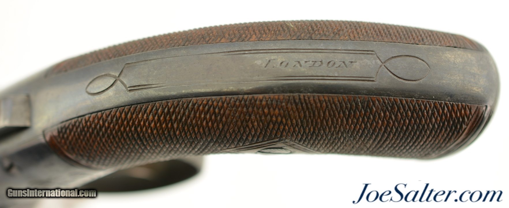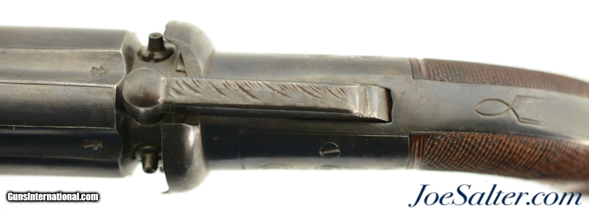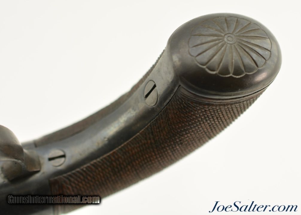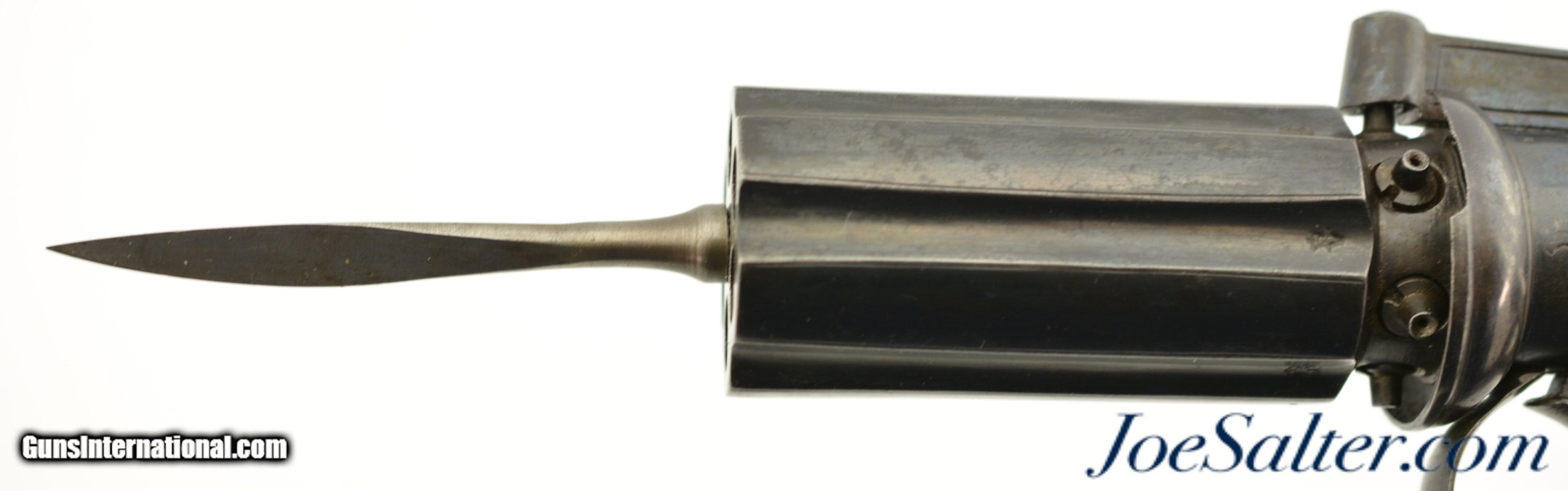 Description: NSN, .36 Caliber, 2 7/8" barrels with fine, bright bores having some mild freckling along their lengths. This is a great looking pistol that has most of an old, reapplied blue finish remaining, turning to an overall smooth plum-brown patina with scattered small spots of freckling and very mild surface oxidation scattered about. The frame, hammer, and trigger guard have crisp floral scrollwork engraving, while the barrel cluster has equally crisp London proofs. An original leaf-shaped, angular blade, 3 1/8" long and having three smooth, unground faces, is mounted to the center of the barrel cluster at the muzzles. The blade is finished in-the-white, and has developed a slightly mottled, pewter gray patina over time. There is no maker’s marking, and the backstrap is simply marked: "LONDON." The grip has nicely burled walnut panels with extremely fine checkering, and exhibits only minor wear and flattening of the points. The action is tight and functions flawlessly. This is a great-looking British pepperbox, with an extremely rare accessory, and is in fine-near excellent overall condition. Antique SOLD Antique: Yes |
