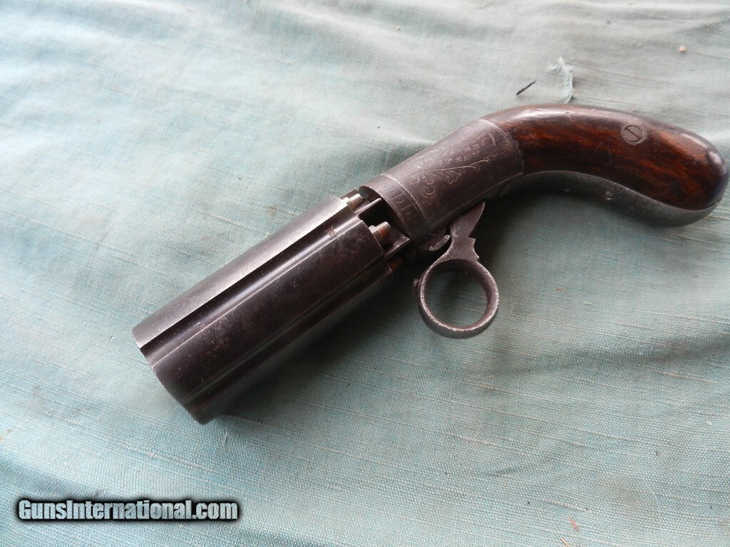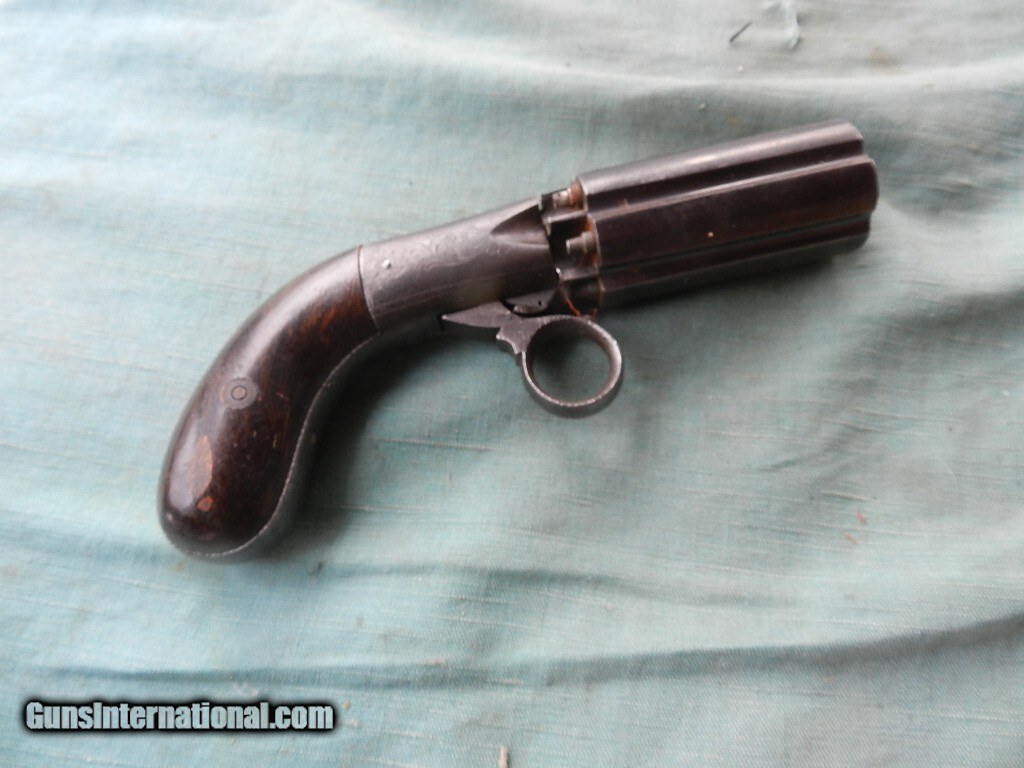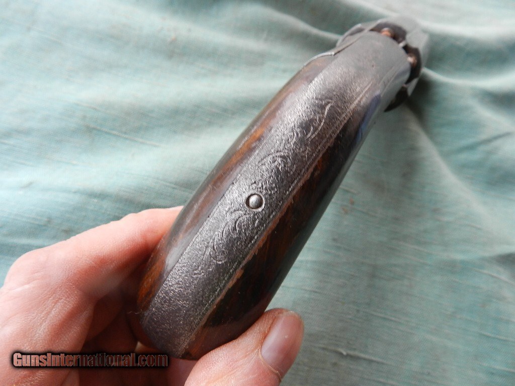 Description: . John Rock Cooper patented this design in 1843, and remained in business until 1853. The patent was apparently for the UNDERHAMMER firing mechanism, which is linked directly to the ring trigger. Most other pepperboxes use a hammer that strikes a cap nipple cone on the side of the cylinder, but these have the nipples on the rear. The only other markings present on the revolver are the CROWN / CROSSED SCEPTERS / BPC "black powder proof" and CROWN / CROSSED SCEPTERS / V "viewed" marks from the city of Birmingham, stamped on the breech end of the cylinder flutes. This city was well known for its firearms industry, which supplied many guns to smaller gun shops and outfitters. Year of Manufacture: circa 1850 Caliber: approx .39" Ammunition Type: Cap and Ball Barrel Length: 3 1/2 inches Overall Length: 7 3/4 inches Action: Double Only Feed System: 6 Shot Revolver Indexes good and .locks up as underhammer striked the nipple.ouple ned nippled look more recent , but all are complete.Chisel engraving on the frame and backstrap,however the backstrap has pitting from handling. When buying a gun always have it examined by a competent gunsmith before shooting. To buy a gun from me you must get a direct email for me, with details, and shipping cost. We don’t have a web site .I prefer money orders or a check. Item ships when funds come in. I try to keep guns affordable, which means I make less money than most dealers. You won’t get altitude sickness, or nose bleed, with my prices! I consistently have the best selection of older guns If you attempt to buy, you must still contact us for details . Best to email to buy. Sometimes a local person can stop buy and purchase before the gun is removed. Sometimes not home to get calls. Some guns are required shipment to a gun dealer near you for a transfer to you when it arrives. Otherwise many older or black powder guns ship to your door. With the widest selection of older guns at great prices, We don’t have a store, and sell on the internet only. I’m easy to get along with. Thank You Antique: Yes Price: $950.00 Contact Seller |