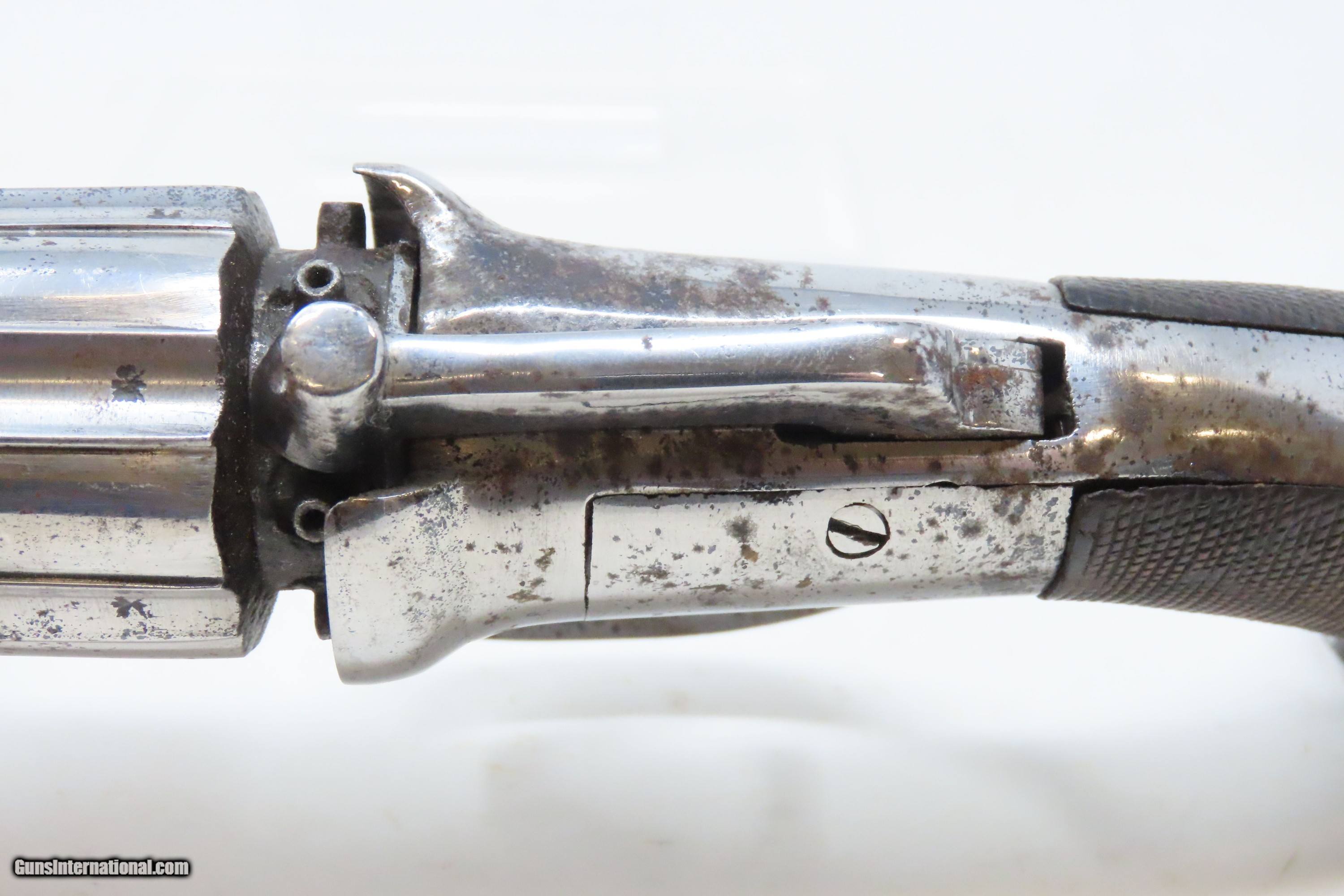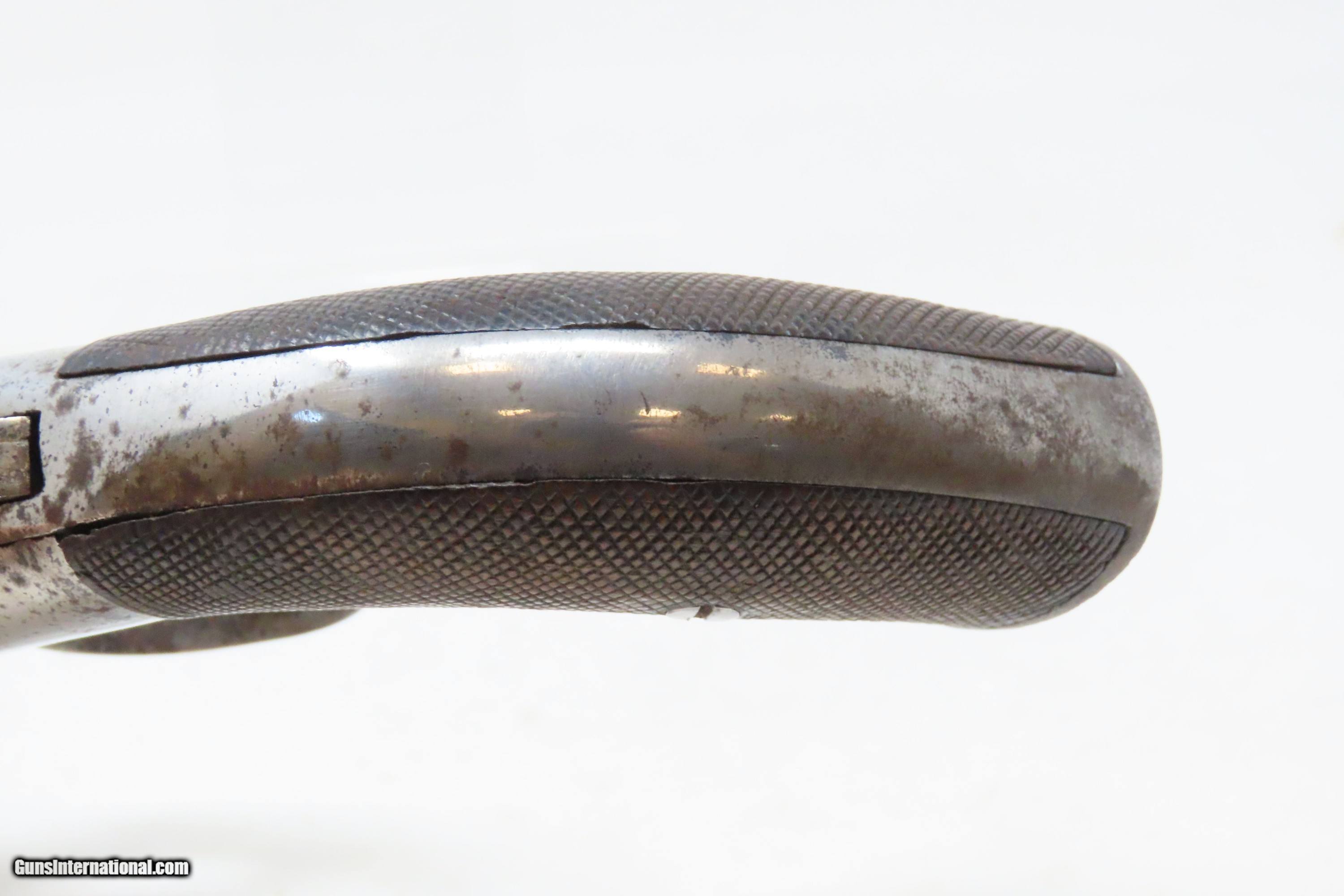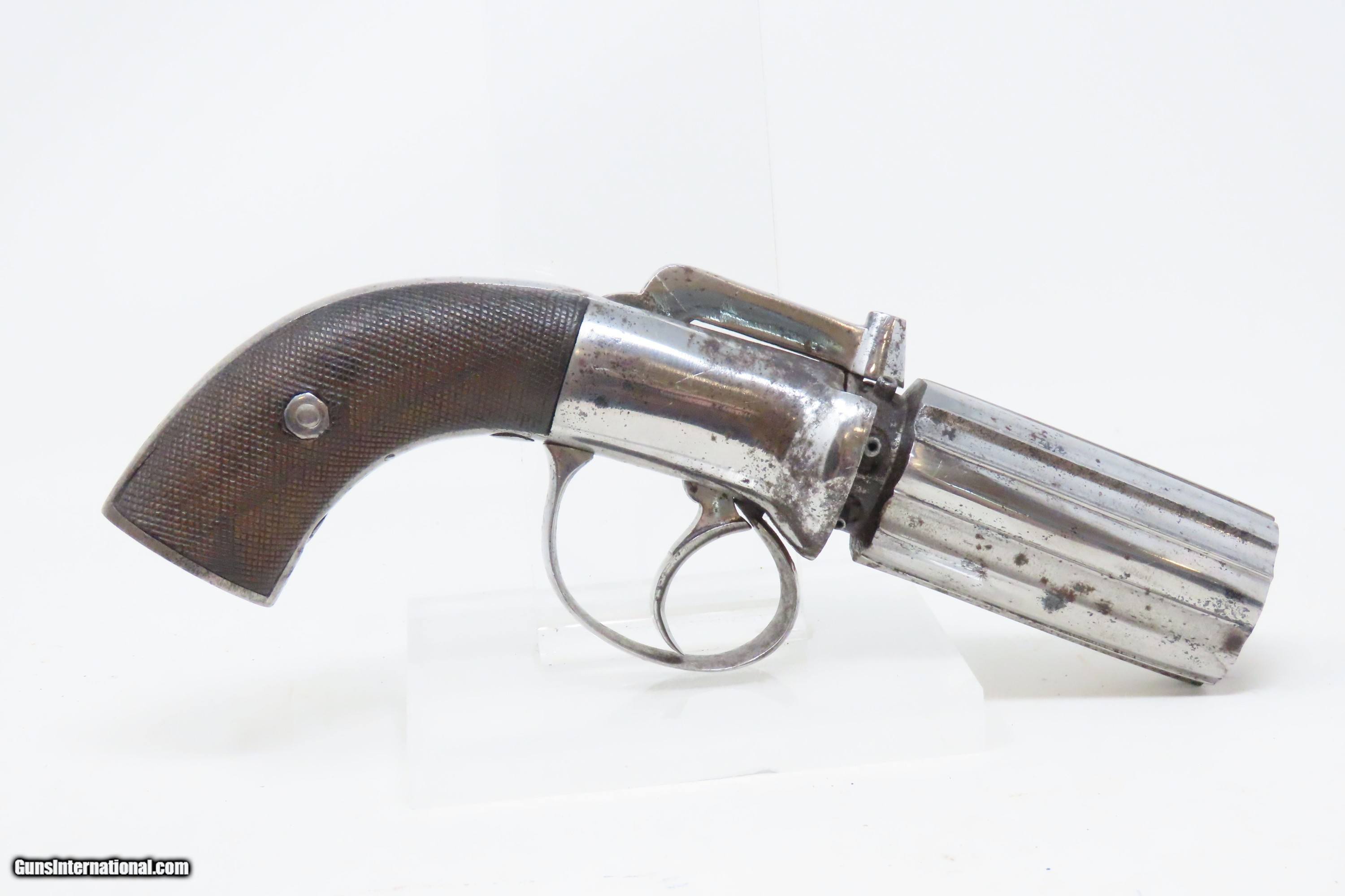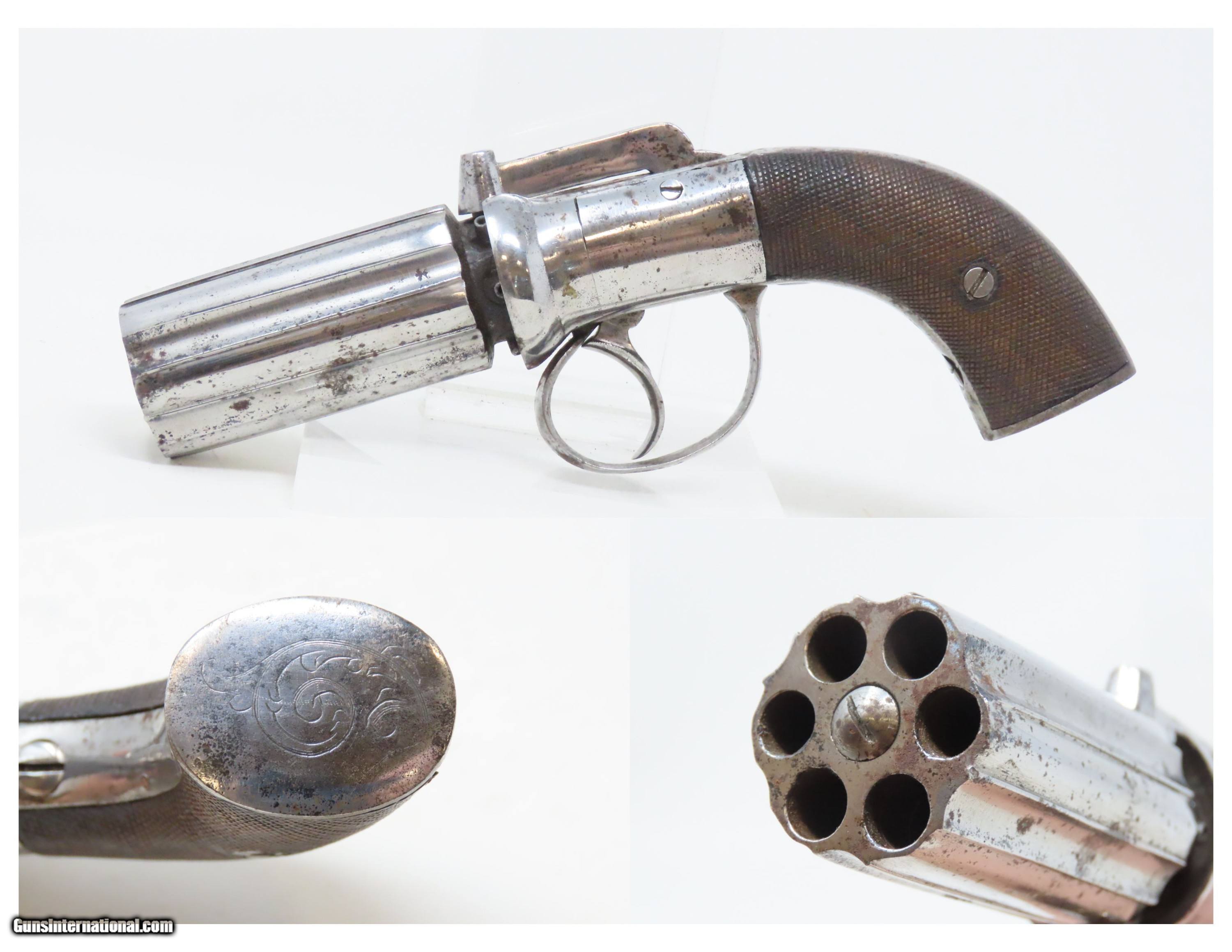 Description: BRITISH PROOFED Antique .32 Cal. Bar Hammer Percussion PEPPERBOX Revolver Double Action Pepperbox with Nickel Finish Here we present an antique Engraved British Proofed Bar Hammer 6-shot Percussion Pepperbox pistol made circa the 1850s likely in Birmingham, England. This example is much like the Allen & Thurber and Allen & Wheelock pepperbox revolvers being made in Worcester, Massachusetts during the same time period. Percussion nipples were integrated to the barrels. Made with a bar hammer and standard trigger, models have been encountered with or without an integral nipple shield. While simplifying shooting (no manual cocking of the hammer), the bar hammer did preclude the inclusion of usable sights. However, this early example of a double-action pistol must have been quite a selling point. As these were considered “point and shoot” short range defensive weapons or “belly guns”, the market did not seem to object to the limitation of not having sights. Made circa the mid-1850s, these pistols enjoyed even greater popularity than Sam Colt’s first pistol. The history that these pistols enjoyed over the years is astounding: the Seminole Wars, Gold Rush, Mexican War and American Civil War. These guns are true relics of American, and with this example, British history. The overall condition is good. Strong action. The bores are in good shape. British proofed flutes. Good, checkered grips. This example has been refinished in nickel. Own the original! This is a legitimate antique and not a reproduction. Barrel is 3 inches. Caliber: .32 Percussion Overall condition as seen in photos. Very Fast. Very Safe. FREE SHIPPING WORLDWIDE. Delivered directly to your door by express mail! Guaranteed AUTHENTIC & Includes CERTIFICATE OF AUTHENTICITY. ancestryguns $1200 #233698 SOLD Antique: Yes |