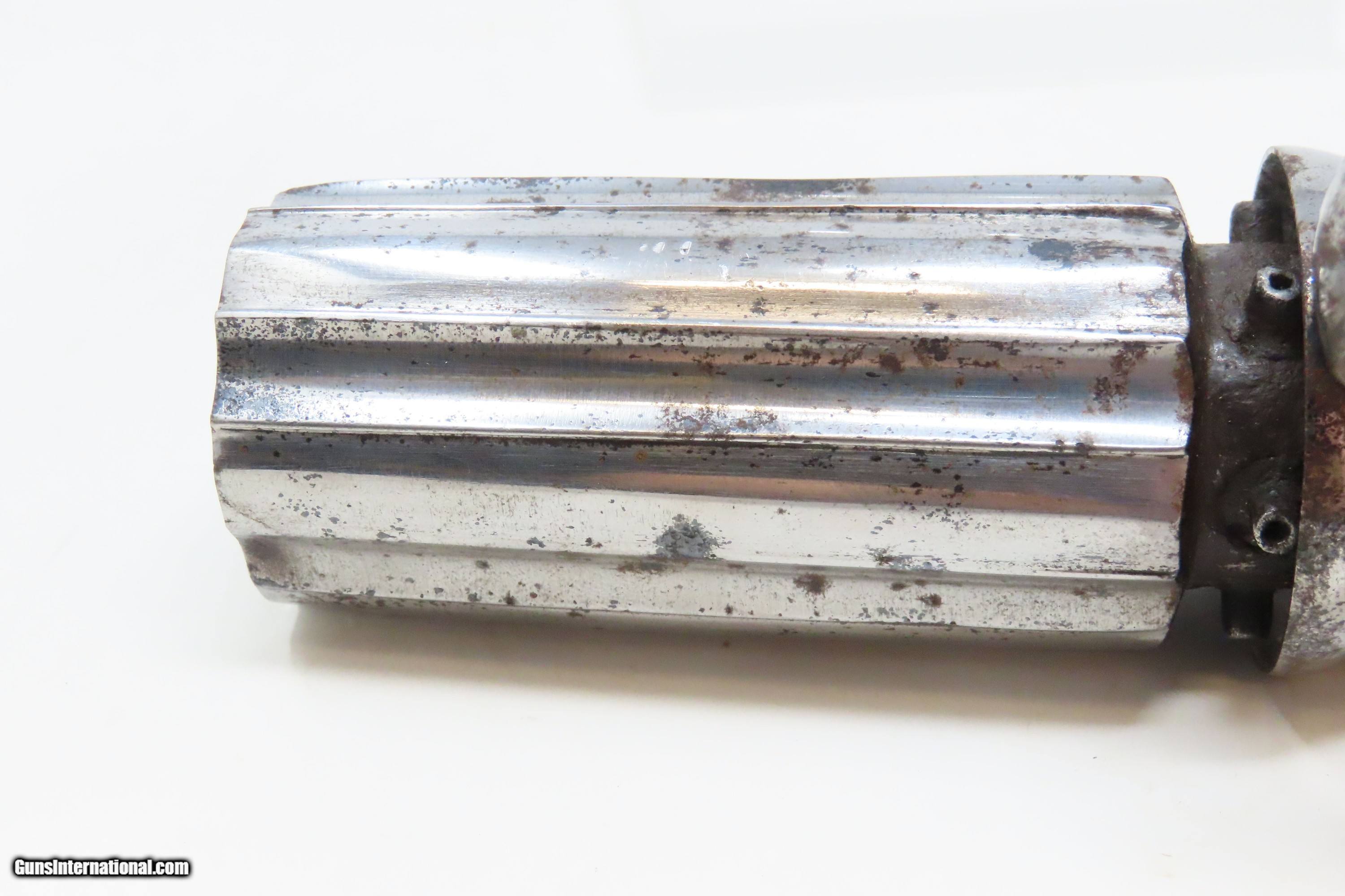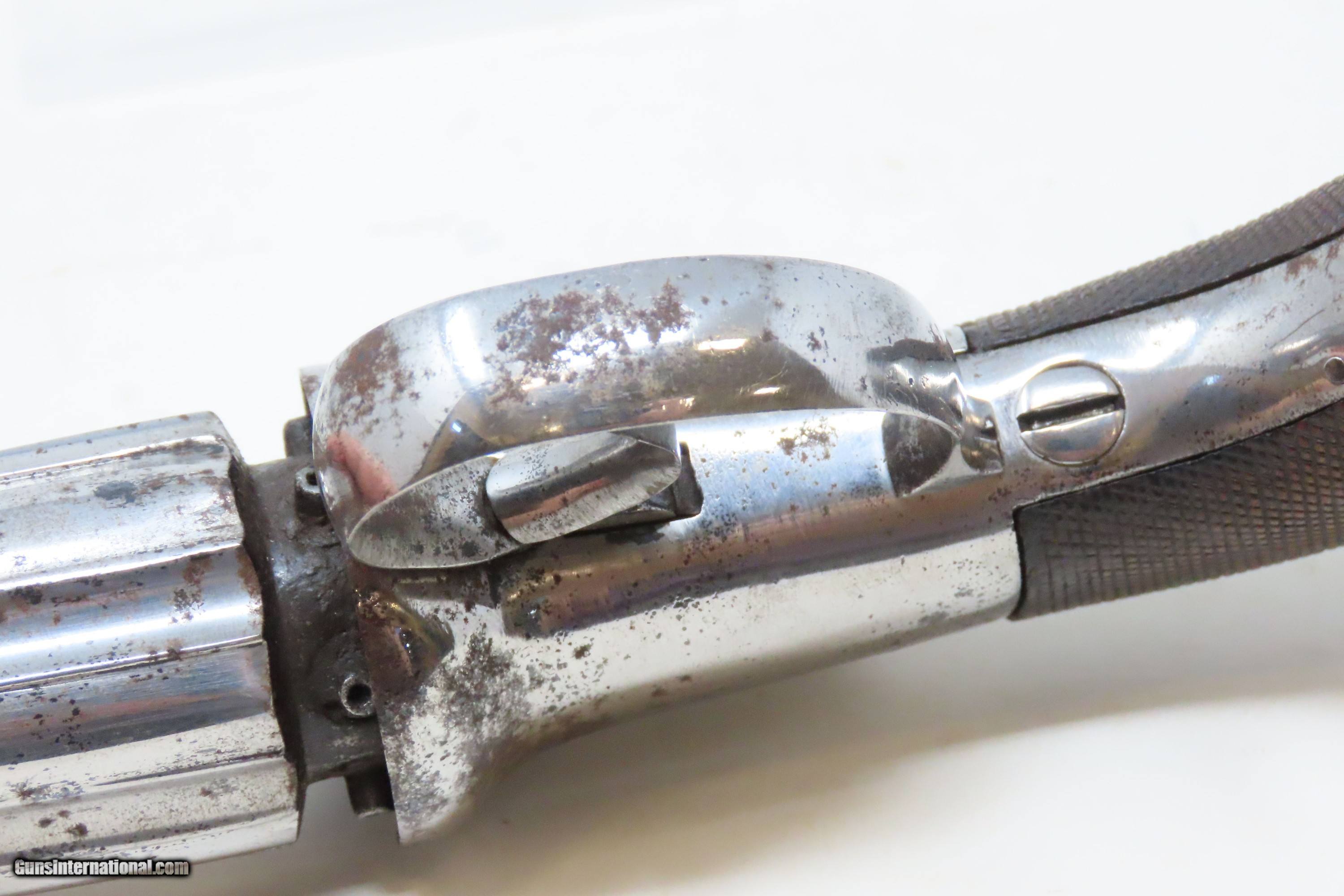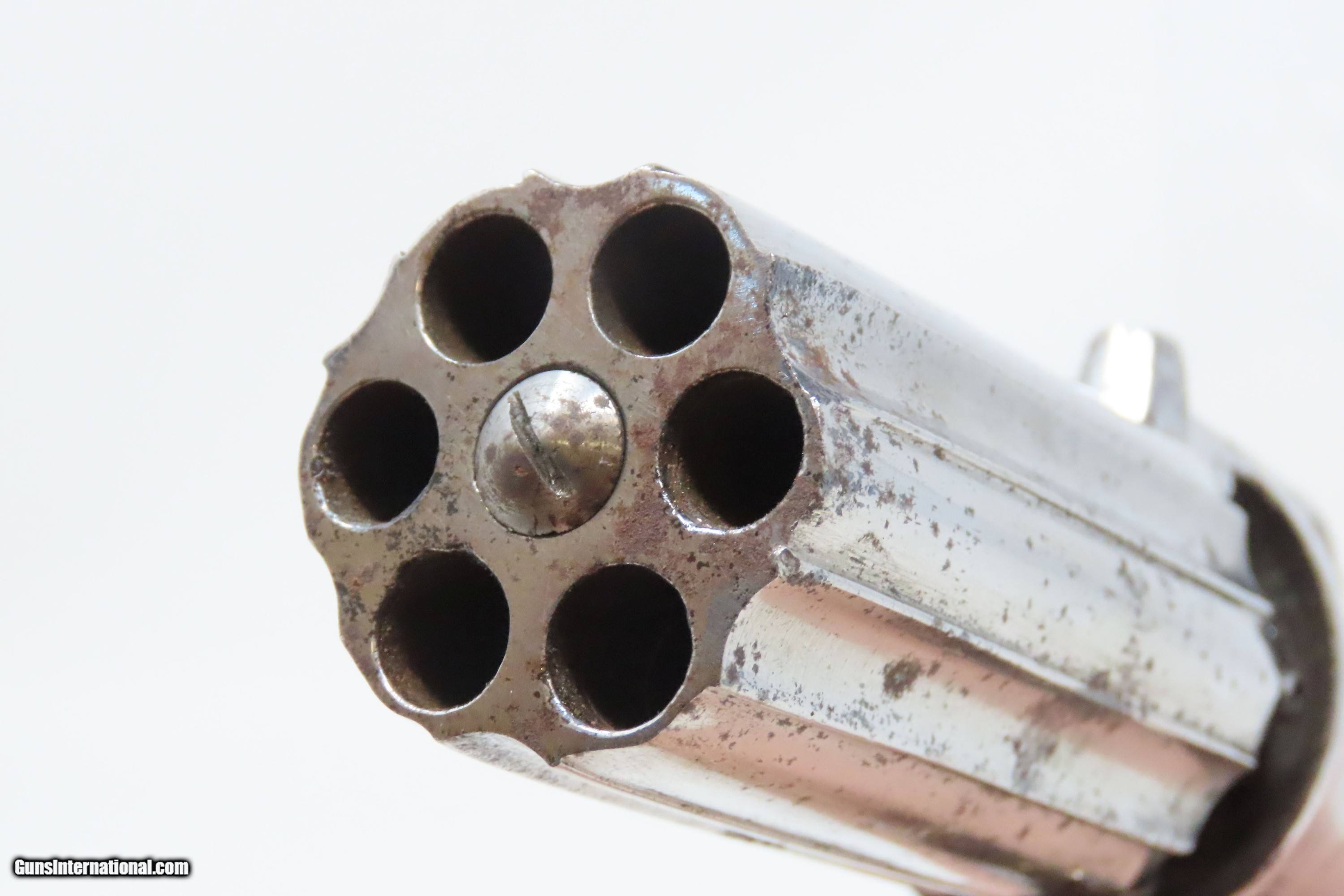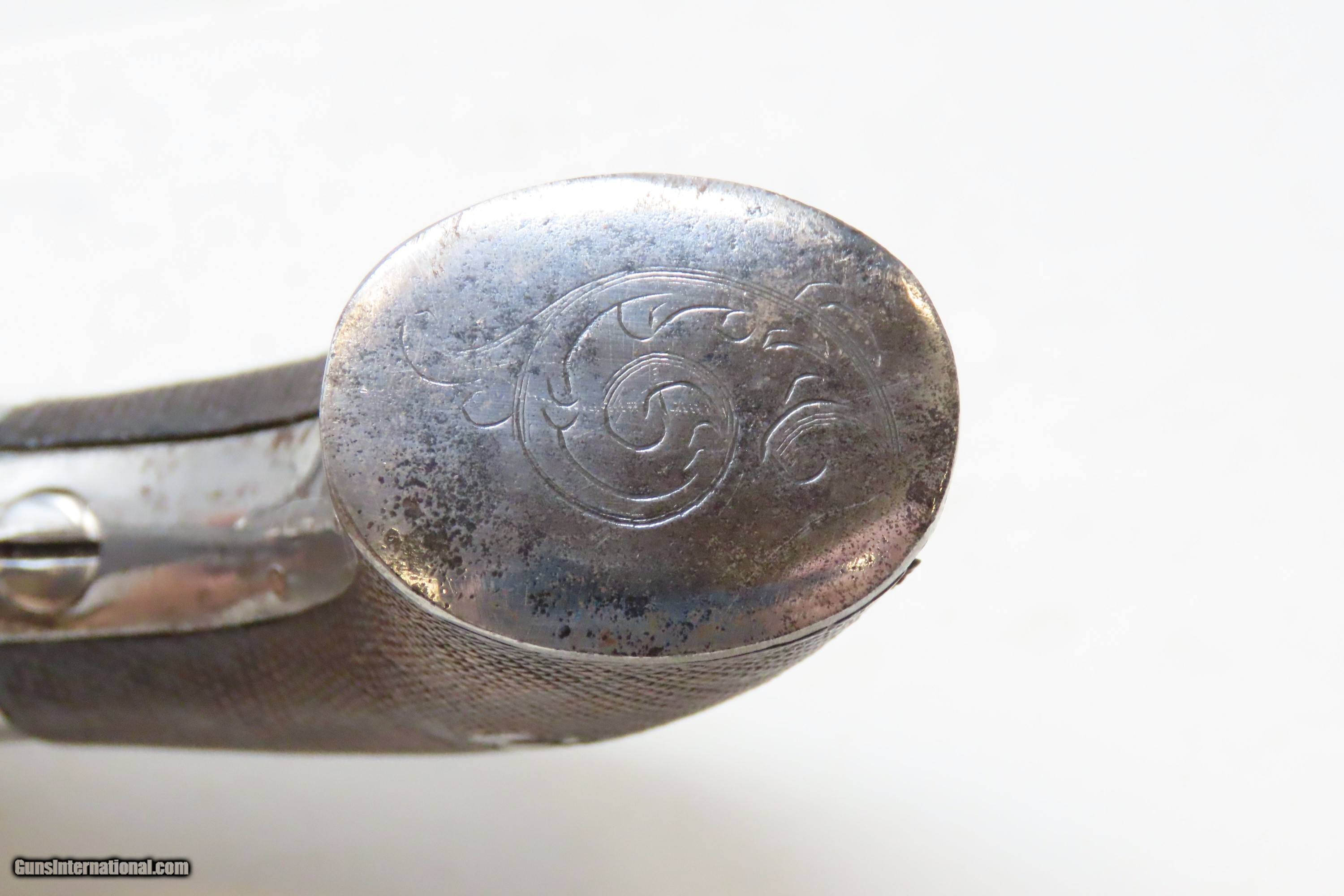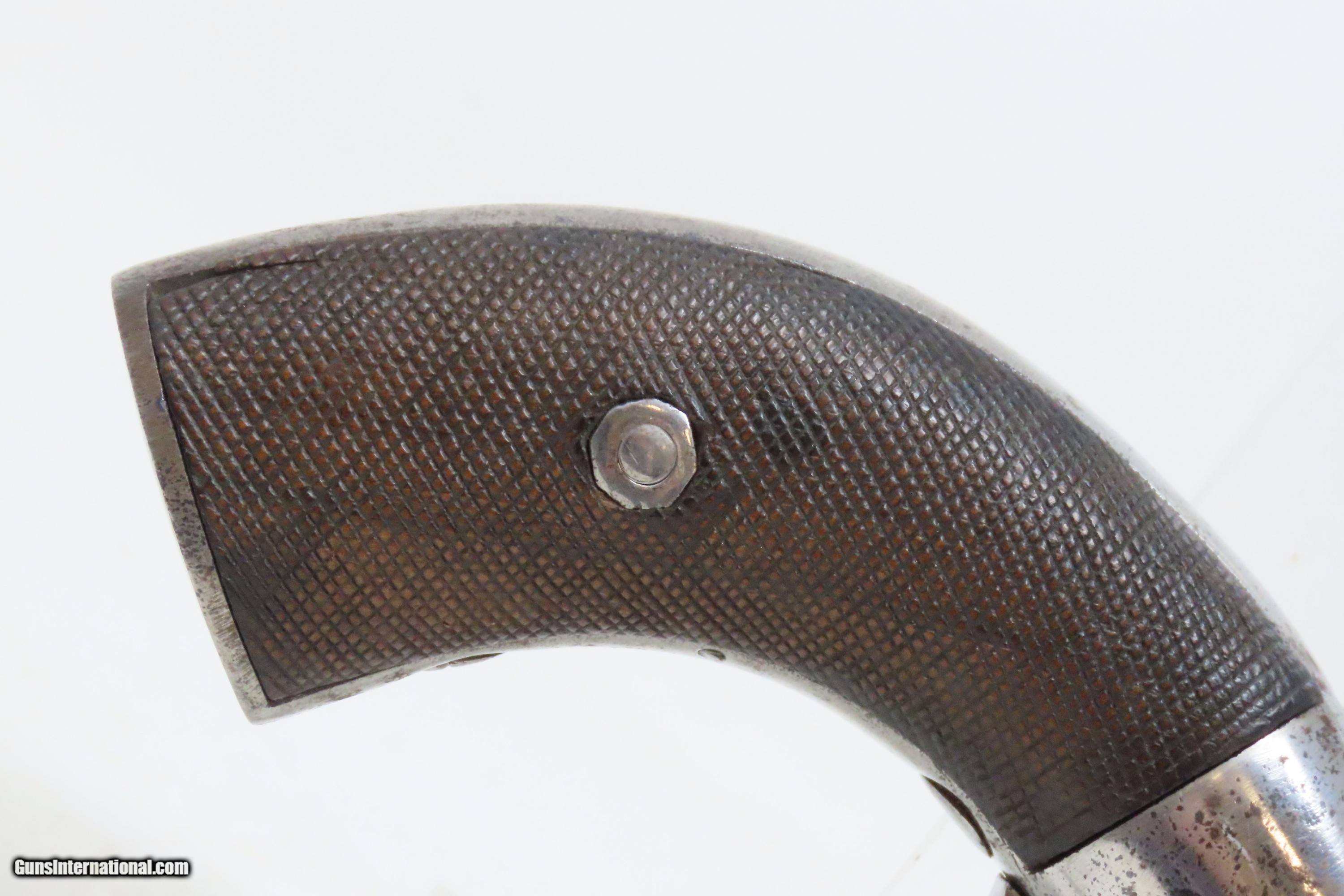 Description: BRITISH PROOFED Antique .32 Cal. Bar Hammer Percussion PEPPERBOX Revolver Double Action Pepperbox with Nickel Finish Here we present an antique Engraved British Proofed Bar Hammer 6-shot Percussion Pepperbox pistol made circa the 1850s likely in Birmingham, England. This example is much like the Allen & Thurber and Allen & Wheelock pepperbox revolvers being made in Worcester, Massachusetts during the same time period. Percussion nipples were integrated to the barrels. Made with a bar hammer and standard trigger, models have been encountered with or without an integral nipple shield. While simplifying shooting (no manual cocking of the hammer), the bar hammer did preclude the inclusion of usable sights. However, this early example of a double-action pistol must have been quite a selling point. As these were considered “point and shoot” short range defensive weapons or “belly guns”, the market did not seem to object to the limitation of not having sights. Made circa the mid-1850s, these pistols enjoyed even greater popularity than Sam Colt’s first pistol. The history that these pistols enjoyed over the years is astounding: the Seminole Wars, Gold Rush, Mexican War and American Civil War. These guns are true relics of American, and with this example, British history. The overall condition is good. Strong action. The bores are in good shape. British proofed flutes. Good, checkered grips. This example has been refinished in nickel. Own the original! This is a legitimate antique and not a reproduction. Barrel is 3 inches. Caliber: .32 Percussion Overall condition as seen in photos. Very Fast. Very Safe. FREE SHIPPING WORLDWIDE. Delivered directly to your door by express mail! Guaranteed AUTHENTIC & Includes CERTIFICATE OF AUTHENTICITY. ancestryguns $1200 #233698 SOLD Antique: Yes |