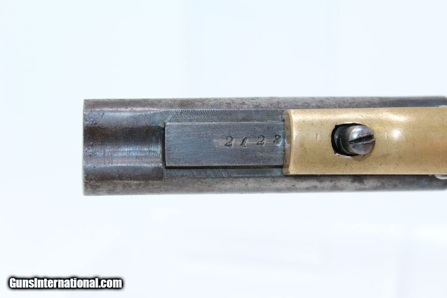 Description: CASED Antique SHARPS 4-Barrel “PEPPERBOX” Revolver Chambered for 4 Shots of .30 Rimfire Here we present an antique Sharps Pepperbox Revolver in .30 Rimfire, made circa 1866 in Philadelphia, Pennsylvania. Christian Sharps invented his famously large bore, breech-loading rifle in 1848, after practicing gun-making under John Hall at Harpers Ferry Armory. In 1859, he premiered another unique design in the 4-barreled pepperbox pistol with a revolving firing pin, made for 19th Century concealed carry. This repeating design was able to utilize the new rimfire ammunition like Smith & Wesson, without infringing on Smith & Wesson’s Rollin White Patent for bored through chambers on a revolver’s cylinder. This gave Sharps a leg up in the market since everyone else either had to produce single shot pistols, come up with an alternate ammunition and weapon design, or just stick with percussion until the patent expired. They made very nice, easy to use and compact firearms for 19th Century conceal and carry. This one features fancy sculpted gutta percha grips. The right side of the frame reads “C.SHARPS&CO./PHILADA. PA.”. The left side reads “C.SHARPS/PATENT 1859”. The overall condition is very good. Traces of the original high luster blue finish remains amidst a gray patina. The markings are clear. The numbers match. The checkered hard rubber grips are in good shape. The bores are in good shape with visible rifling under a layer of preservative wax. The action is excellent, strong and crisp, with a fully functional rotating firing pin! Own the original! This is a legitimate antique and not a reproduction. Barrel is 3 inches. Caliber: .30 Rimfire Overall condition as seen in photos. Very Fast. Very Safe. FREE SHIPPING WORLDWIDE. Delivered directly to your door by express mail! Guaranteed AUTHENTIC & Includes CERTIFICATE OF AUTHENTICITY. ancestryguns $1000 #8511 SOLD Antique: Yes |