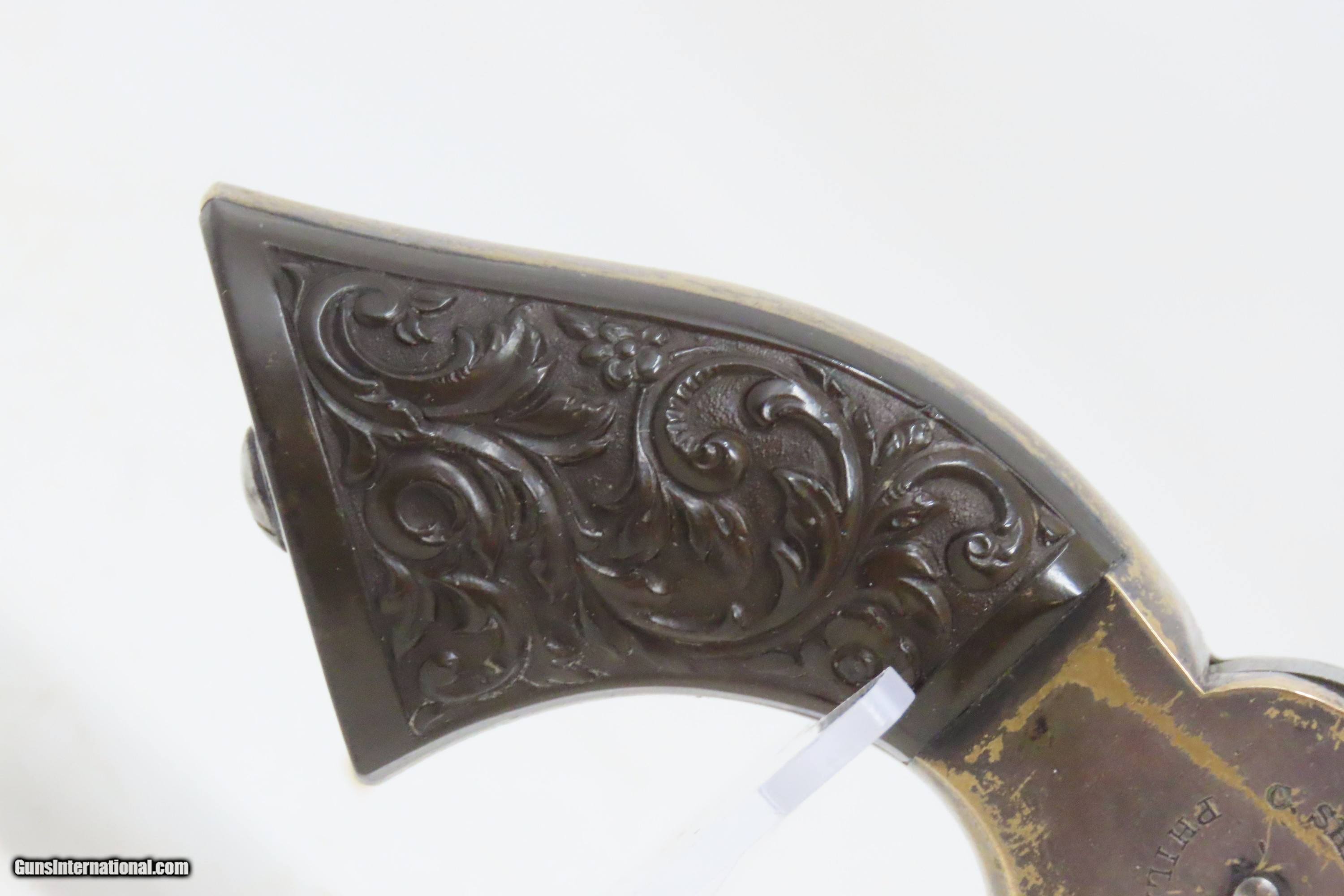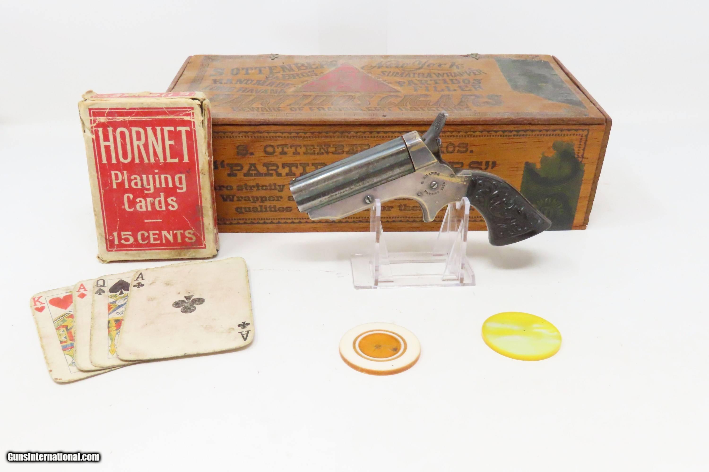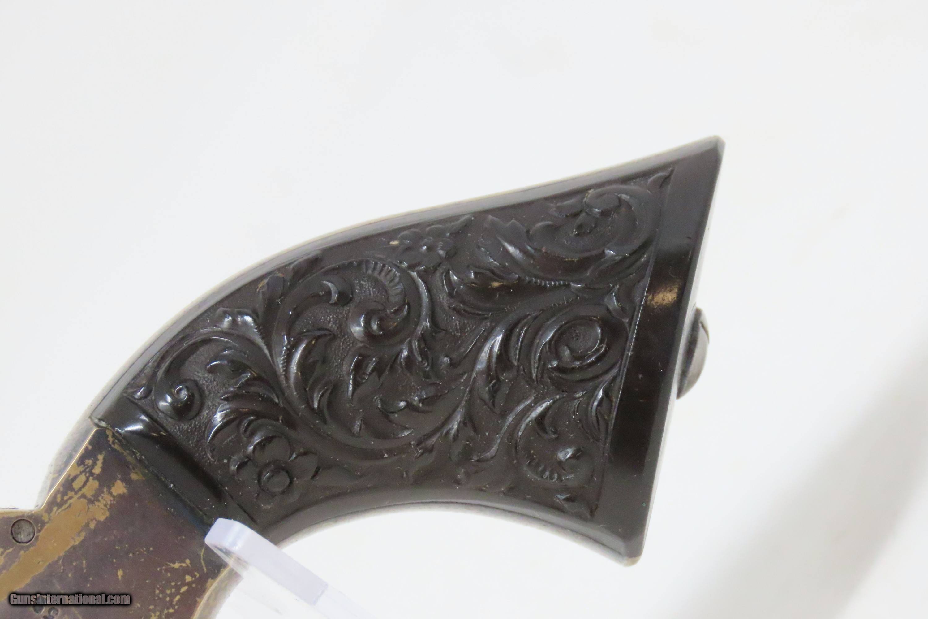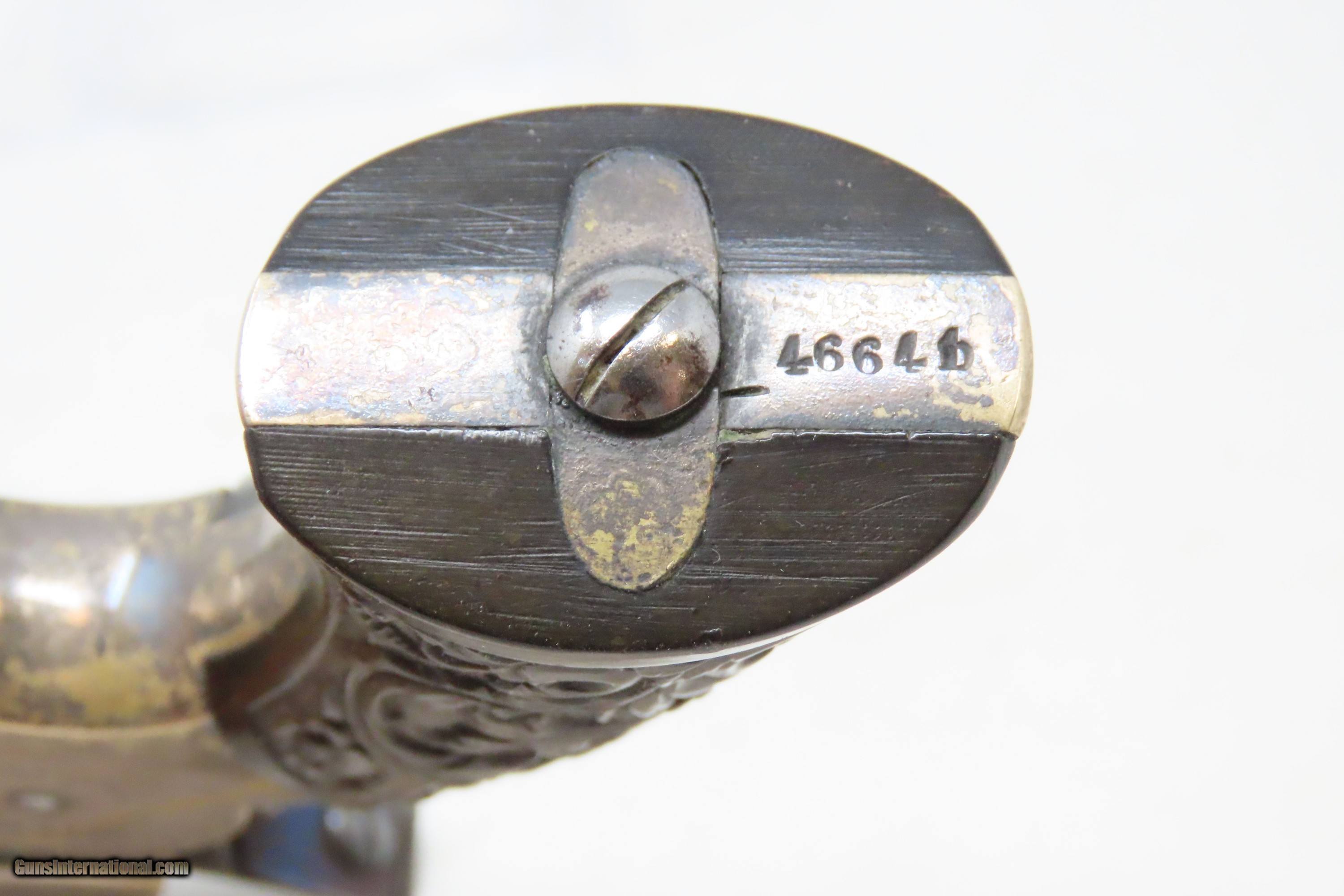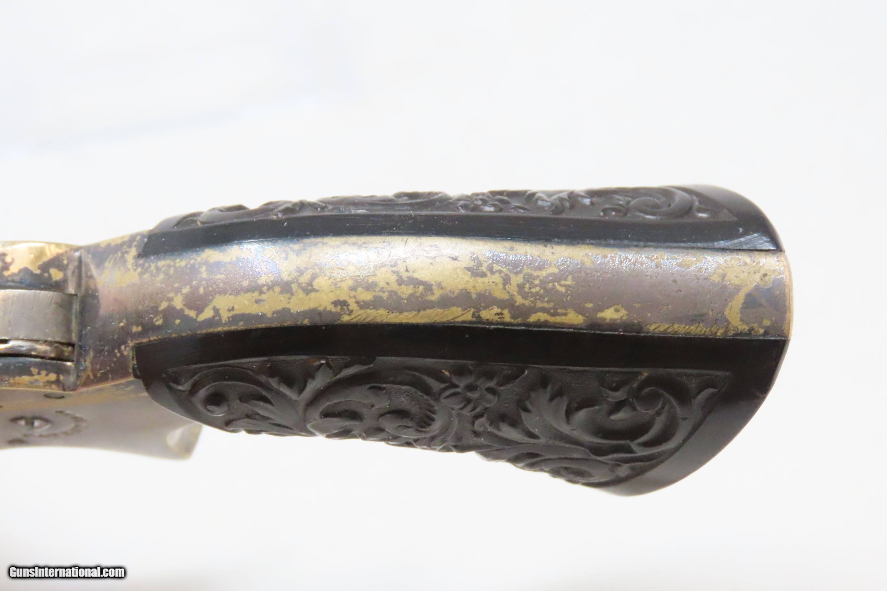 Description: CIVIL WAR Era Antique C. SHARPS .22 PEPPERBOX Wild West RIVERBOAT GAMBLER FINE Model 1 Pocket Pepperbox Revolver Here we present an antique Christian Sharps Model 1 Pepperbox Pistol, made during its production run between 1859 and 1874 in Philadelphia, Pennsylvania. Christian Sharps invented his famously large bore, breech-loading rifle in 1848, after practicing gun-making under John Hall at Harpers Ferry Armory. In 1859, he premiered another unique design in the 4-barreled pepperbox pistol with a unique revolving firing pin, made for 19th Century concealed carry. Production ceased with the death of Christian Sharps in 1874. This repeating design was able to utilize the new rimfire ammunition like Smith & Wesson, without infringing on Smith & Wesson’s Rollin White Patent for bored through chambers on a revolver’s cylinder. This gave Sharps a leg up in the market since everyone else either had to produce single shot pistols, come up with an alternate ammunition and weapon design, or just stick with percussion until the patent expired. They made very nice, easy to use and compact firearms for 19th century conceal and carry. We can see proof that a small pepperbox such as this one, made a pivotal impact on the industry and country, as Grantley Berkeley, in his book “The English Sportsman in the Western Prairies” shares after being presented with one in the fall of 1859. Berkeley was in St. Louis, Missouri at the time when he reminisced about the pistol…“The most perfect little bijou of a revolver I ever saw in my life… In size it is so small that I carried it in my waistcoat-pocket, and in execution so effective that at eight yards I could shoot as correctly, if not more so, than I could with my favourite pair of John Manton duelling pistols….” It truly was an ace in the hole for the gabling table, simply, to assure an honest game was played. The overall condition is fine. Original finish has been preserved. Excellent action. The bores are bright and nicely rifled. Markings are sharp throughout. Both grips are in good shape with minimal handling wear. Numbers match. The cigar box and accessories are in good shape. Own the original! This is a legitimate antique and not a reproduction. Barrels are 2-1/2 inches. Caliber: .22 Rimfire Overall condition as seen in photos. Very Fast. Very Safe. FREE SHIPPING WORLDWIDE. Delivered directly to your door by express mail! Guaranteed AUTHENTIC & Includes CERTIFICATE OF AUTHENTICITY. ancestryguns $1250 #233284 SOLD Antique: Yes |
