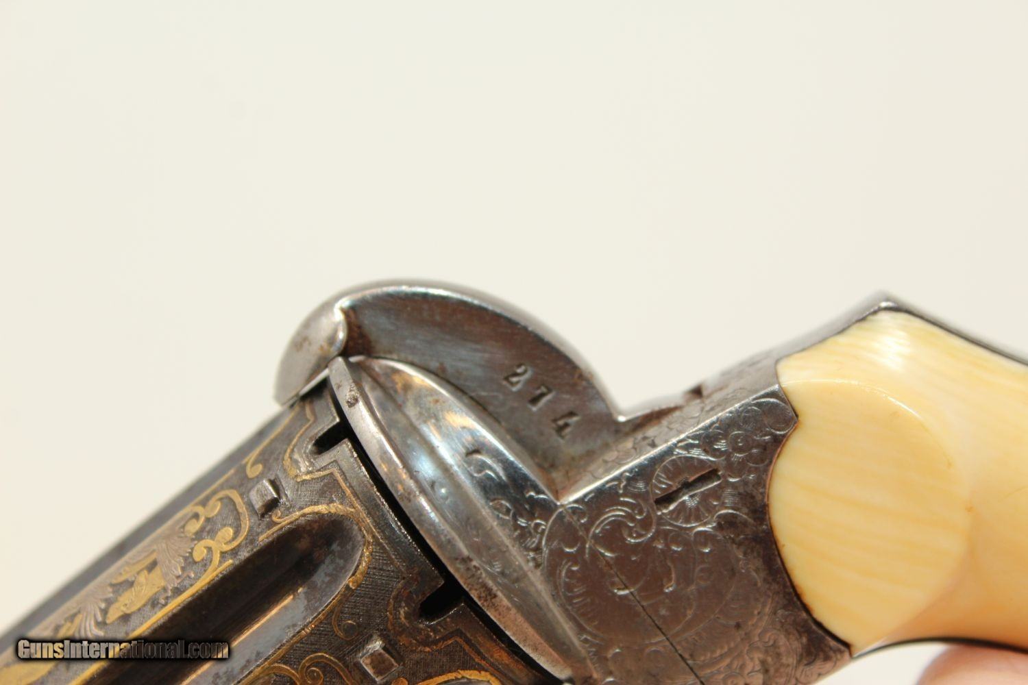 Description: DOG & RABBIT CHASE Gold Engrave PEPPERBOX Revolver 1870s Pinfire by Orbea Hermanos in Spain Here we present an antique Orbea Hermanos Pepperbox Pinfire Revolver with a Beautiful Dog & Rabbit Chase Cylinder Scene in Gold and Ivory Grips, made circa 1870 in Eibar, Spain. Before the turn of the century, Orbea Hermanos was one of the largest pistol manufacturers in the city of Eibar in Spain. This small revolver was designed to be used for concealable self-defense in the last half of the 19th Century. This piece is just as much a work of are as weapon. Ivory grips, engraved frame, and fantastically decorated cylinder make it so. The cylinder bears the likeness of a stag, doe, game birds, and a dog giving chase to a rabbit. The overall condition is fine. The bores are smooth and in good condition. The action is strong and crisp. Find another one like it! Own the original! This is a legitimate antique and not a reproduction. Barrel is 1-3/4 inches. Caliber: 7mm Pinfire Overall condition as seen in photos. Very Fast. Very Safe. FREE SHIPPING WORLDWIDE. Delivered directly to your door by express mail! Guaranteed AUTHENTIC & Includes CERTIFICATE OF AUTHENTICITY. ancestryguns $1650 #190333 SOLD Antique: Yes |