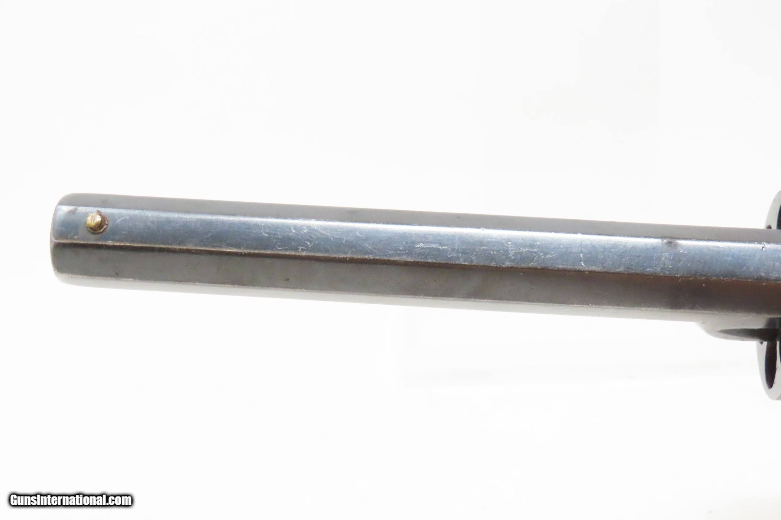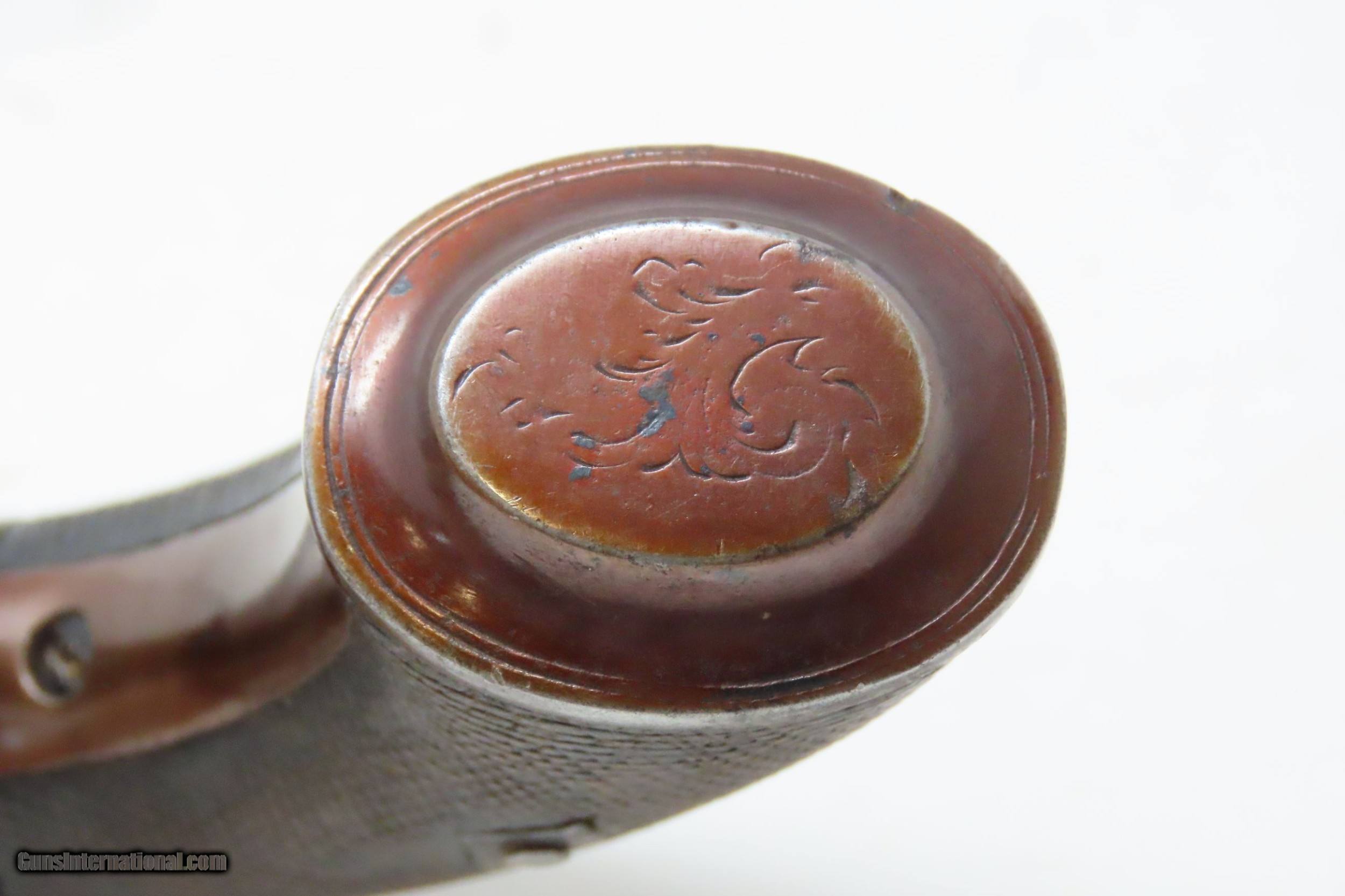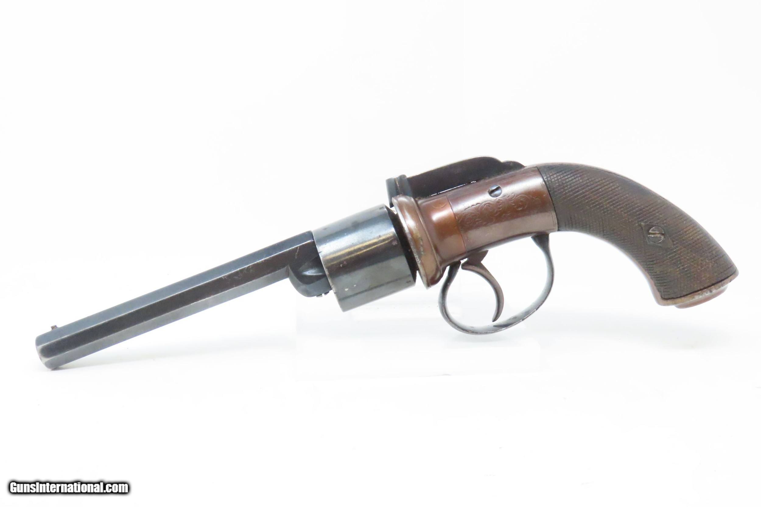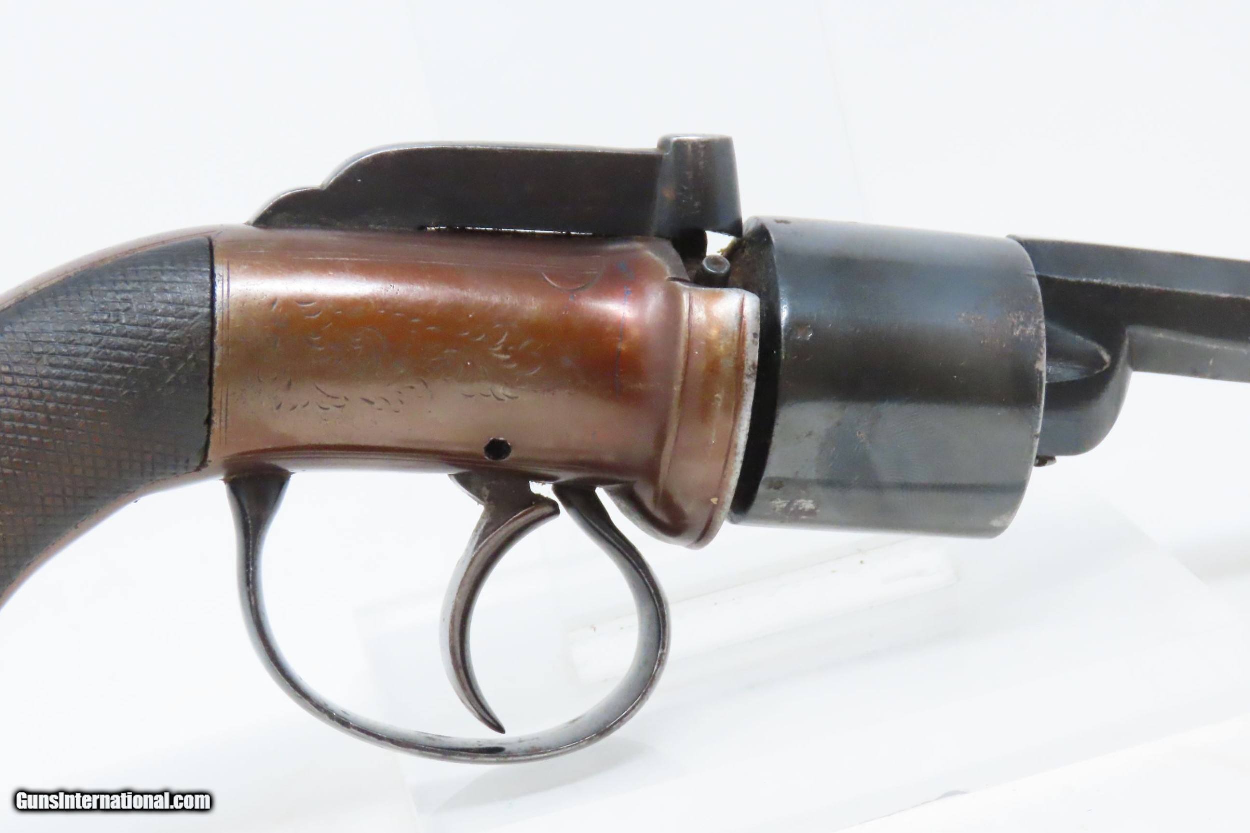 Description: ENGRAVED Antique BAR HAMMER Transitional .38 Caliber PERCUSSION DA Revolver PEPPERBOX to REVOLVER Transitional Firearm Here we present an antique English Transitional Bar Hammer Revolver made likely in Birmingham, England circa the late 1840s. Between the invention and patenting of the more “modern” revolvers and their widespread affordable availability, a transitional style of pepperbox self-defense firearm was produced, largely in the United Kingdom. These guns used a barrel cluster truncated into a cylinder and a single rifled barrel affixed to the end of the axis pin. The resulting firearm was rather weak, but one which was accessible and inexpensive, and more accurate than the traditional smoothbore pepperbox revolvers. After Colt’s appearance at the Crystal Palace’s Great Exhibition of 1851, everyone wanted a “revolving pistol”. The English gunmakers attempted to meet this demand without infringing on Colt’s English Patents. Thus, the “Transitional Revolver” came into being. The overall condition is good. Strong action. The bore is in good shape for its age. Both grips are seated firmly with an average amount of handling. Lightly engraved frame. This example wears an old re-finish. Own the original! This is a legitimate antique and not a reproduction. Barrel is 5 inches. Caliber: .37 Percussion Overall condition as seen in photos. Very Fast. Very Safe. FREE SHIPPING WORLDWIDE. Delivered directly to your door by express mail! Guaranteed AUTHENTIC & Includes CERTIFICATE OF AUTHENTICITY. ancestryguns $1500 #220117 SOLD Antique: Yes |
