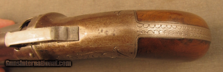 Description: Batch #191, .31 caliber, 4” barrel cluster with good, lightly pitted bores. This is a Worcester-made pistol that has a good 40-50% of the original blue remaining on the barrel cluster that blends smoothly into a mild plum-brown patina on the balance. The engraved frame has a darkly mottled gray patina with some even, mild freckling on the gripstraps and nipple shield. The bar hammer has some mottled freckling as well with muted original color case-hardening still present along the sides, and the matching numbered walnut grips are in fine shape with scattered minor handling marks and blemishes in the original piano varnish. The mechanism is still tight, functions flawlessly, and the pistol rates fine-near excellent condition overall. Antique SOLD Manufacturer: Allen Model: Pepperbox Caliber Info: .31 Cal Gauge Info: .31 Cal |