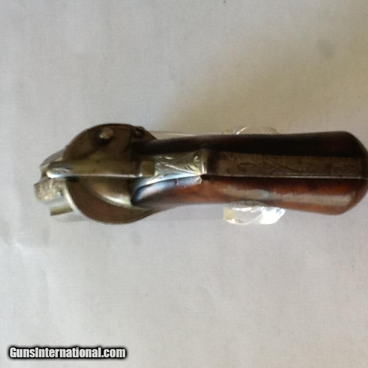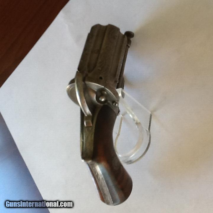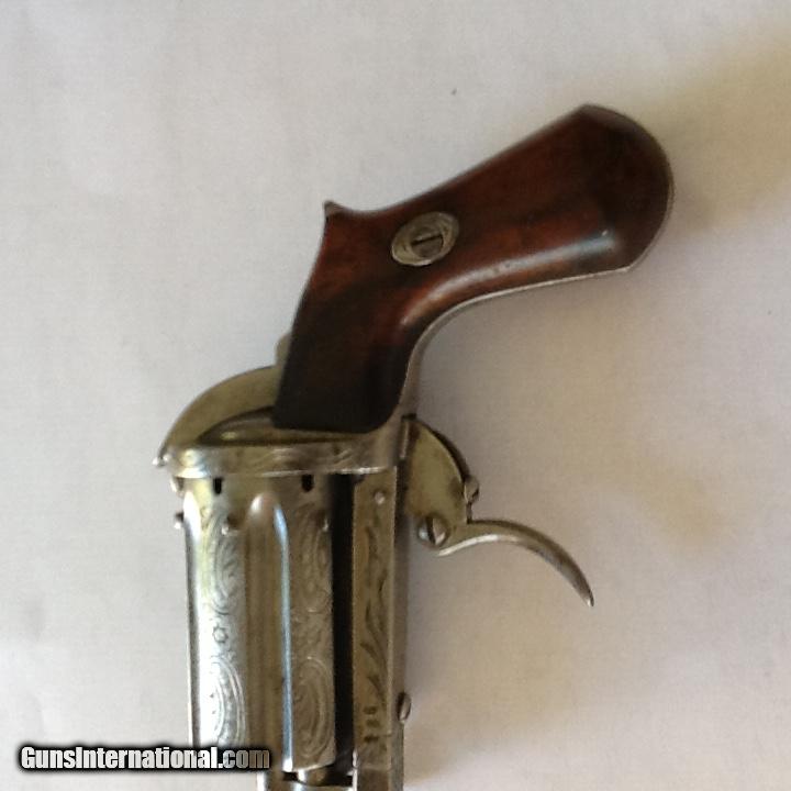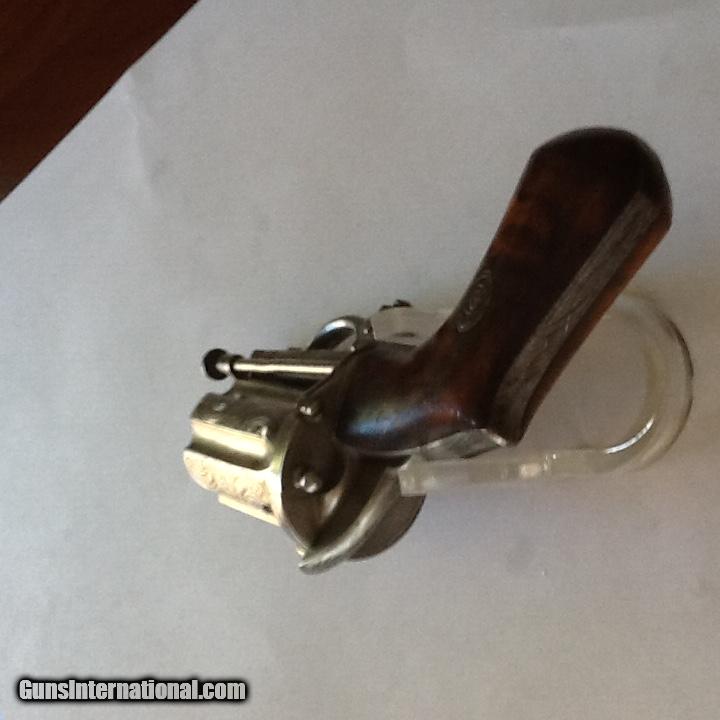 Description: Six cylinder rotates ,double action, rotation is very strong . Gun operates as it should ,shows very little signs of wear,all engraving is strong with no signs of wear an is very prolific on the gun. The only item I found not functioning is the ejector rod which does not seat into its resting place titely. SOLD Antique: Yes Manufacturer: Lefaucheux (assumed from research none apparent on gun) Model: Fist Pistol Serial Number: None apparent |