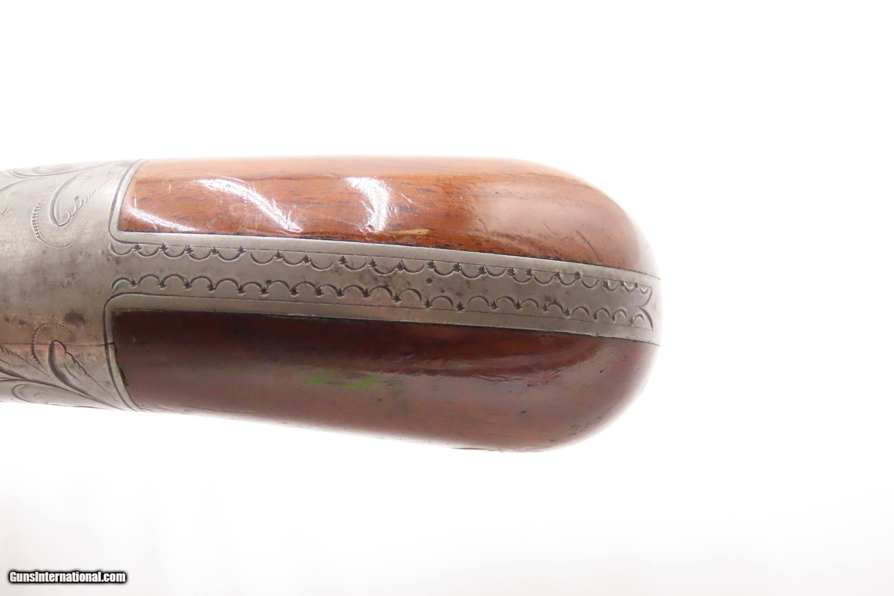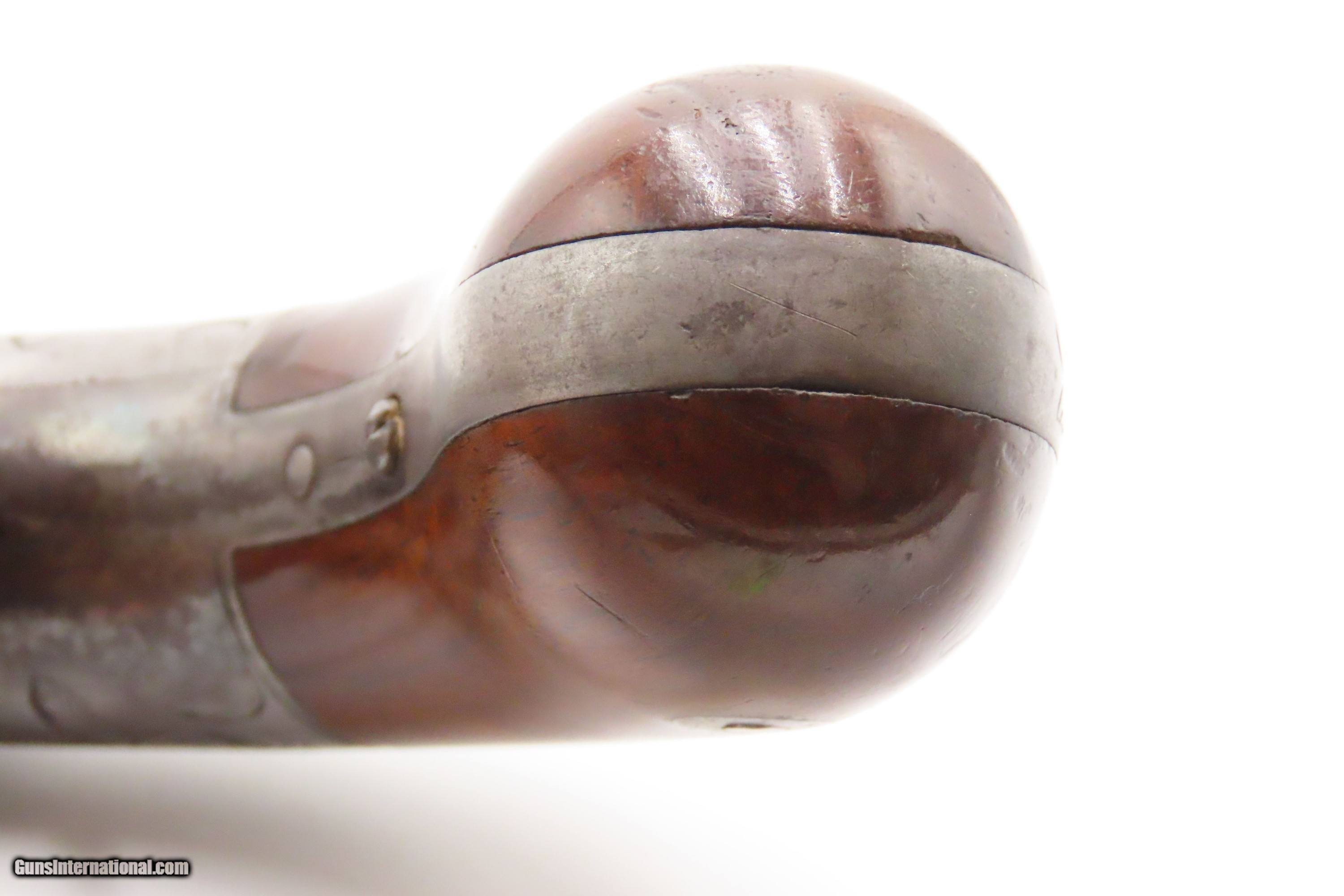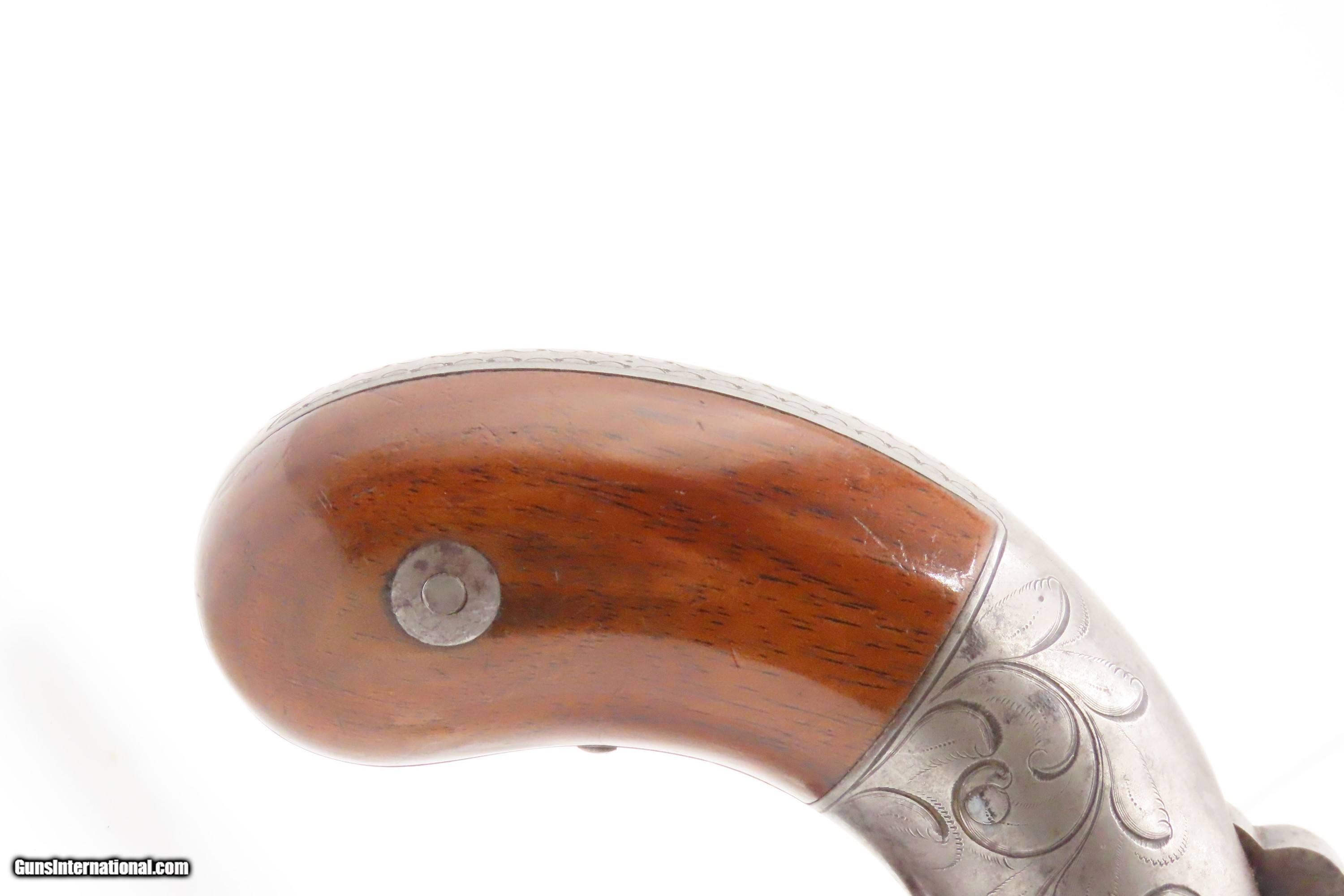 Description: GOLD RUSH Era ALLEN & THURBER Antique WORCHESTER Period PEPPERBOX Revolver ENGRAVED First DA Revolving Percussion Pistol Here we present an antique Allen & Thurber Bar Hammer 6-shot Percussion Pepperbox pistol with accessories made circa 1847 to 1856 in Worcester, Massachusetts. Only six-barrel pepperbox pistols were produced during the Grafton and Norwich periods (1837–1847), and all had smooth barrel external contours until the later Worchester and Allen and Wheelock period, when fluted barrels became the norm. Though this is a six shot, it was during the Worchester period that the five-shot pepperbox was introduced. Percussion nipples were integrated to the barrels. Made with a bar hammer and standard trigger, models have been encountered with or without an integral nipple shield. While simplifying shooting (no manual cocking of the hammer), the bar hammer did preclude the inclusion of usable sights. However, this early example of a double-action pistol must have been quite a selling point. As these were considered “point and shoot” short range defensive weapons or “belly guns”, the market did not seem to object to the limitation of not having sights. Ethan Allen was already a prolific inventor and successful businessman in the 1830s when he came up with this design. This percussion, six-shot, double-action pocket revolver was a very popular pistol that was produced in Worcester, Massachusetts. It’s a 32-caliber pepperbox with a revolving screw off fluted barrel and has factory engravings in a floral motif executed on both sides of the frame. Made from 1847-1856, these pistols enjoyed even greater popularity than Sam Colt’s first pistol. The history that these pistols enjoyed over the years is astounding: the Seminole Wars, Gold Rush, Mexican War and American Civil War. These guns are true relics of American history. The overall condition is good. Traces of original blue are present on the frame. The action partially functions, but the cylinder must be manually rotated. Engraved frame. Solid grips. Good bores for their ages. Markings are legible. Both the mold and powder flask are in good shape. Own the original! This is a legitimate antique and not a reproduction. Barrel is 3-1/2 inches. Caliber: .32 Percussion Overall condition as seen in photos. Very Fast. Very Safe. FREE SHIPPING WORLDWIDE. Delivered directly to your door by express mail! Guaranteed AUTHENTIC & Includes CERTIFICATE OF AUTHENTICITY. ancestryguns $1100 #247828 SOLD Antique: Yes |