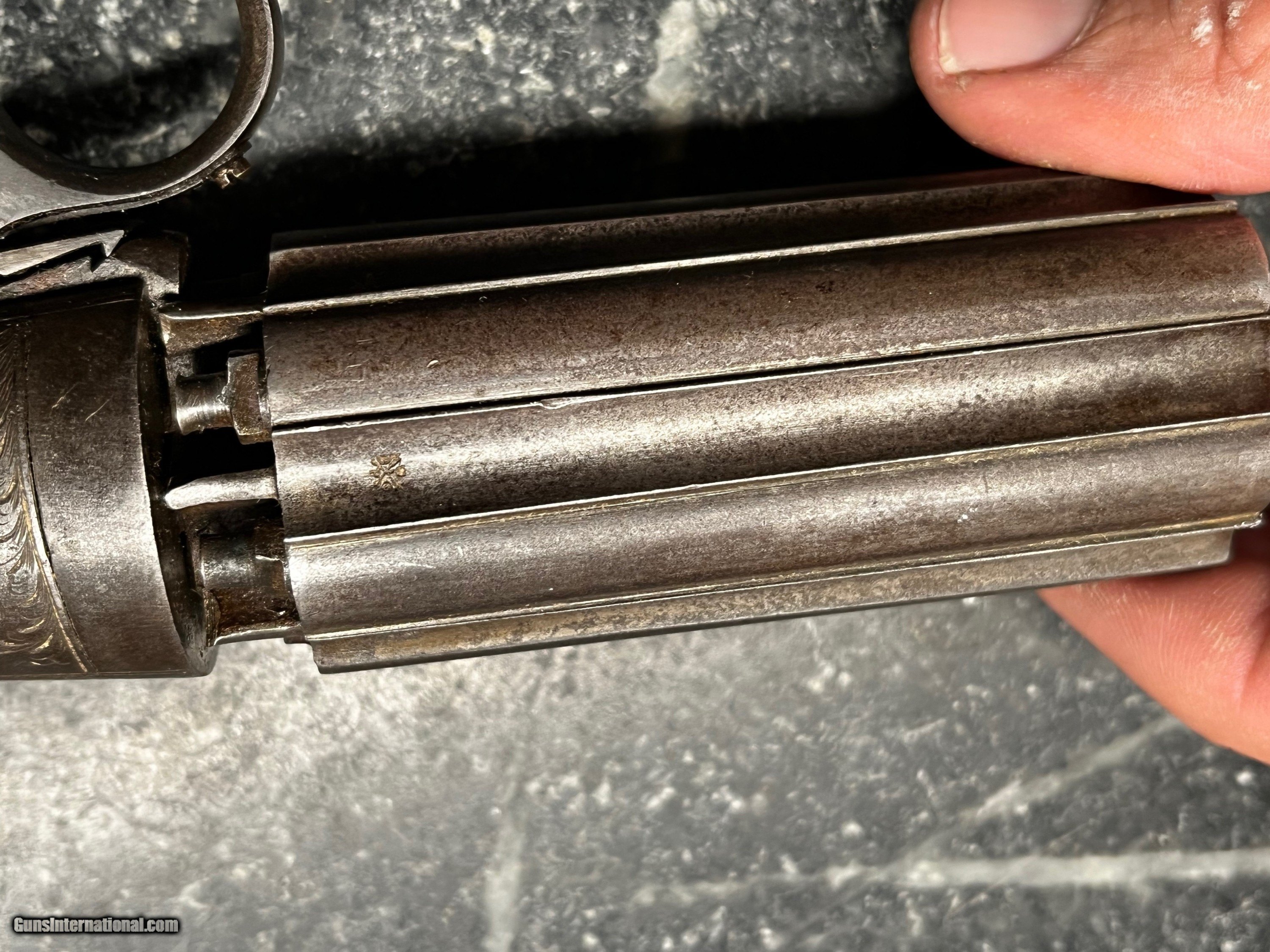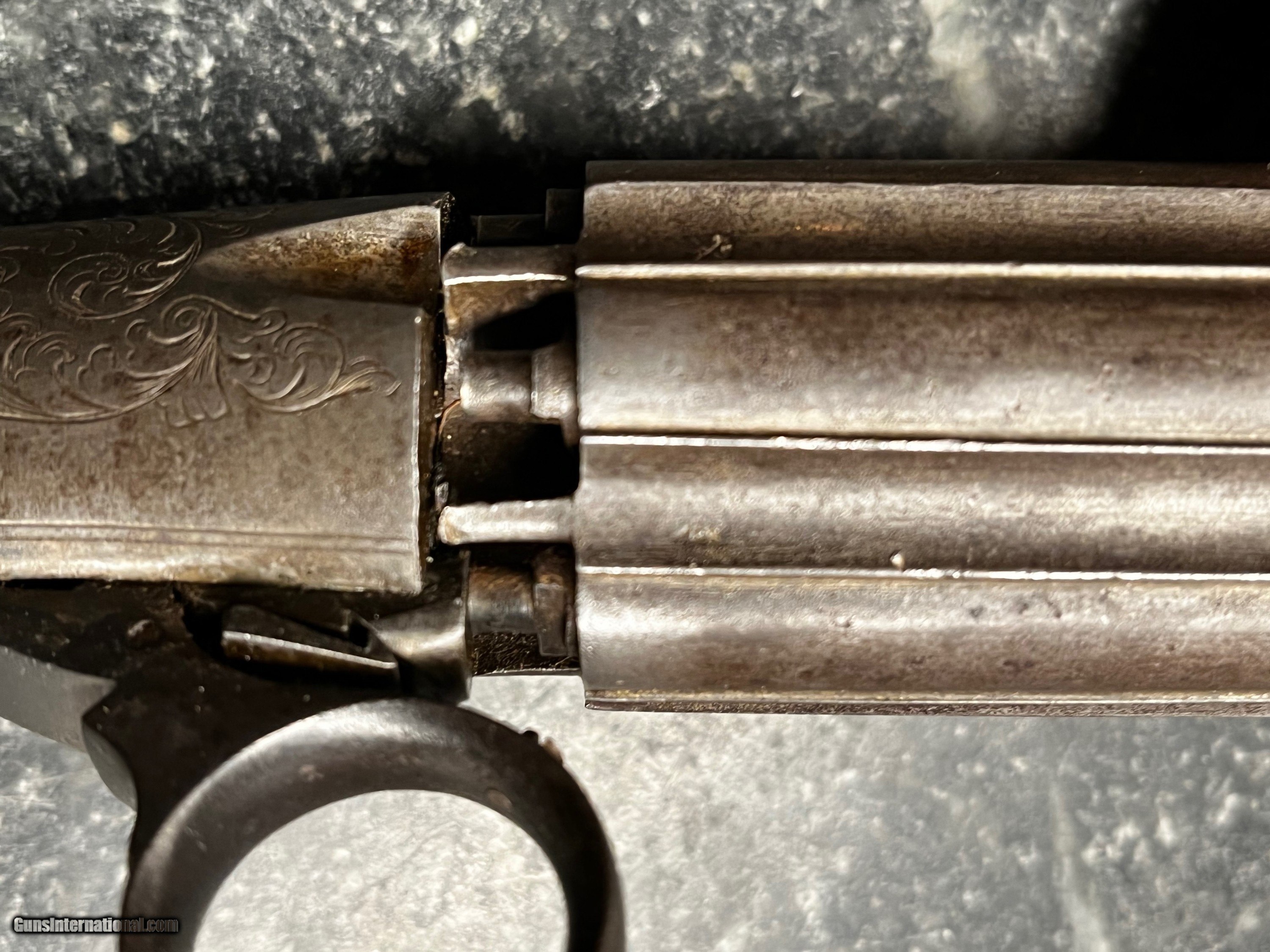 Description: Here is a really nice looking Pepperbox pistol . With fluted barrels, foliate engraved rounded action and border engraved butt, 'J.R. Cooper Patentee' on one side, ring-trigger, Birmingham proof marks .3 1/2 inch barrel with grip plates showing some shrinkage toward end but fits well in most places. Good mechanics ..Works nicely SOLD Curio/Relic: Yes Antique: Yes Manufacturer: JR Cooper Chambers: 6 Metal Condition: Nice Wood Condition: Some shrinkage Bore Condition: Nice |