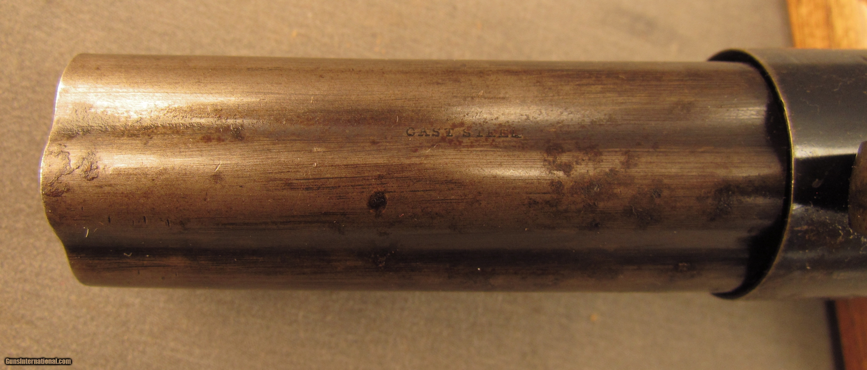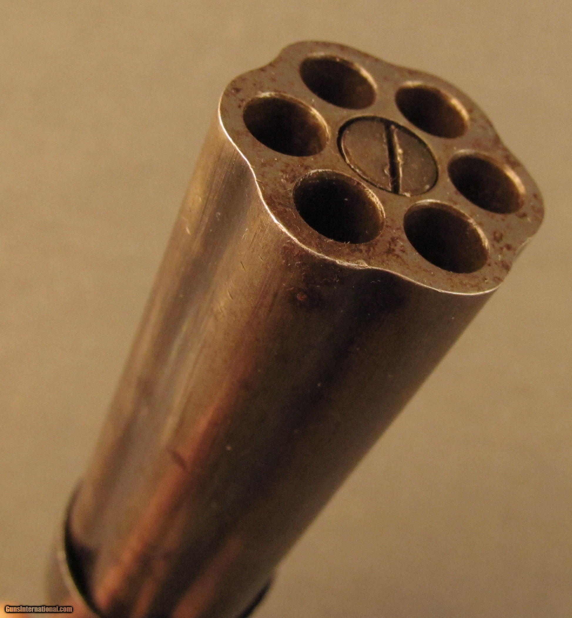 Description: Serial/Batch #62, .31 caliber, 4” barrel cluster with good, lightly pitted bores. This is a rare, six-shot pistol that has about 25-30% of the original blue remaining on the barrel cluster, mostly on the protected areas within the barrel flutes, and a mild plum-brown patina on the balance with some traces of freckling present towards the breech end. The engraved frame has a pale gray mottled patina with traces of the bright original blue just behind and on the nipple shield. The bar hammer likewise has bright original color case-hardening still present along the sides that blends into spots of darker freckling on the edges. The matching numbered walnut grips are in fine shape with scattered minor handling marks and blemishes as well as some mild flaking of the original piano varnish. The mechanism is still tight, functions flawlessly, and the pistol rates fine-near excellent condition overall. Very few of these six-shot pepperboxes were made and they are seldom encountered today. This example has an unusual amount of original finish remaining and would make a great addition to any collection. Antique (900) 1495 SOLD Antique: Yes Manufacturer: Manhattan Model: Pepperbox Caliber Info: .31 Cal Gauge Info: .31 Cal |