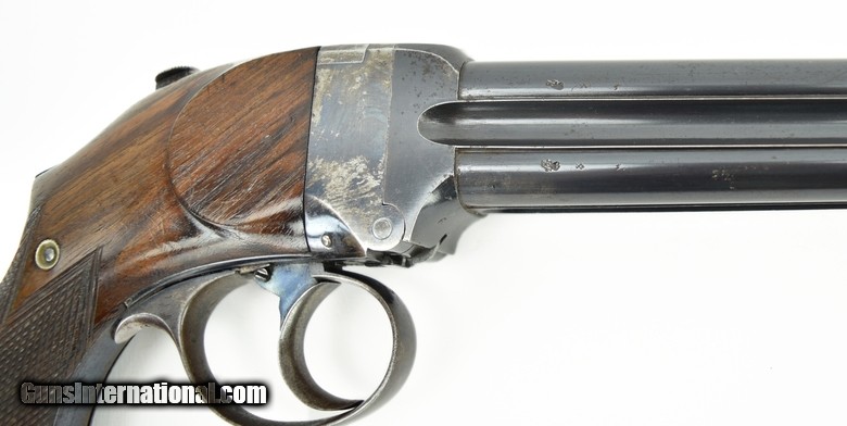 Rare Thomas Bland Mitrailleuse 4 barrel pistol. Extremely rare gun made under Abraham Martin’s patent. Very few of these guns were made by Thomas Bland. These guns were very similar to the Charles Lancaster design, but differ substantially on the internal mechanism. The flaw of this design was the recoil on the Martin patent could cause multiple barrels to fire where this was not an issue with the Lancaster pistols. Condition is excellent! Excellent original blue. Gun is a 380 cartridge (not a 380 ACP). Grips are excellent with very sharp checkering. Action works perfect. Bores are very good with some pitting. Very scarce gun that few know exist.