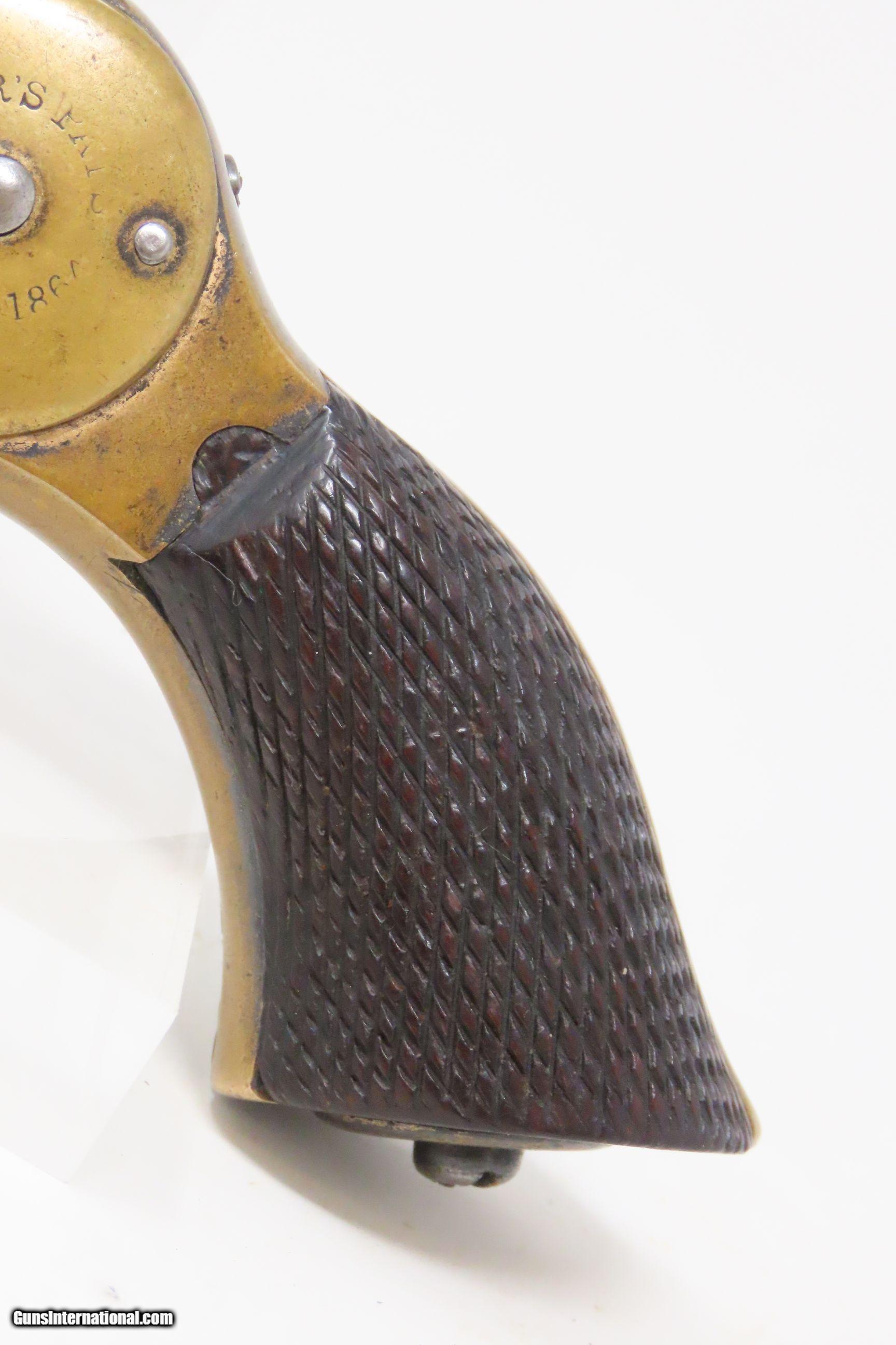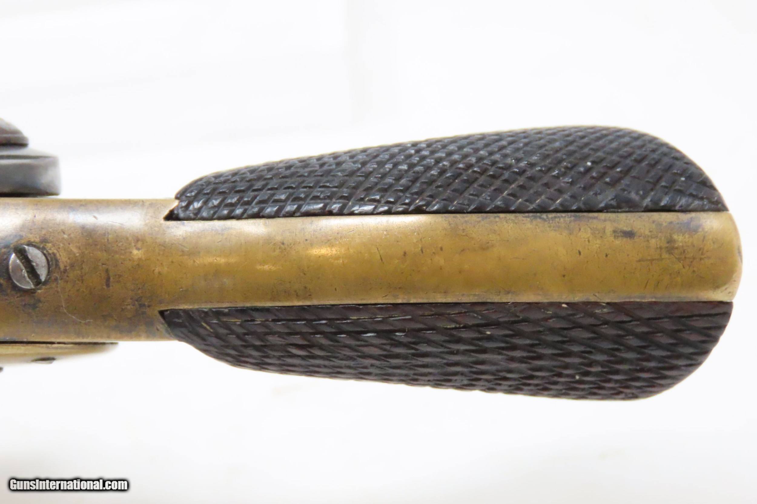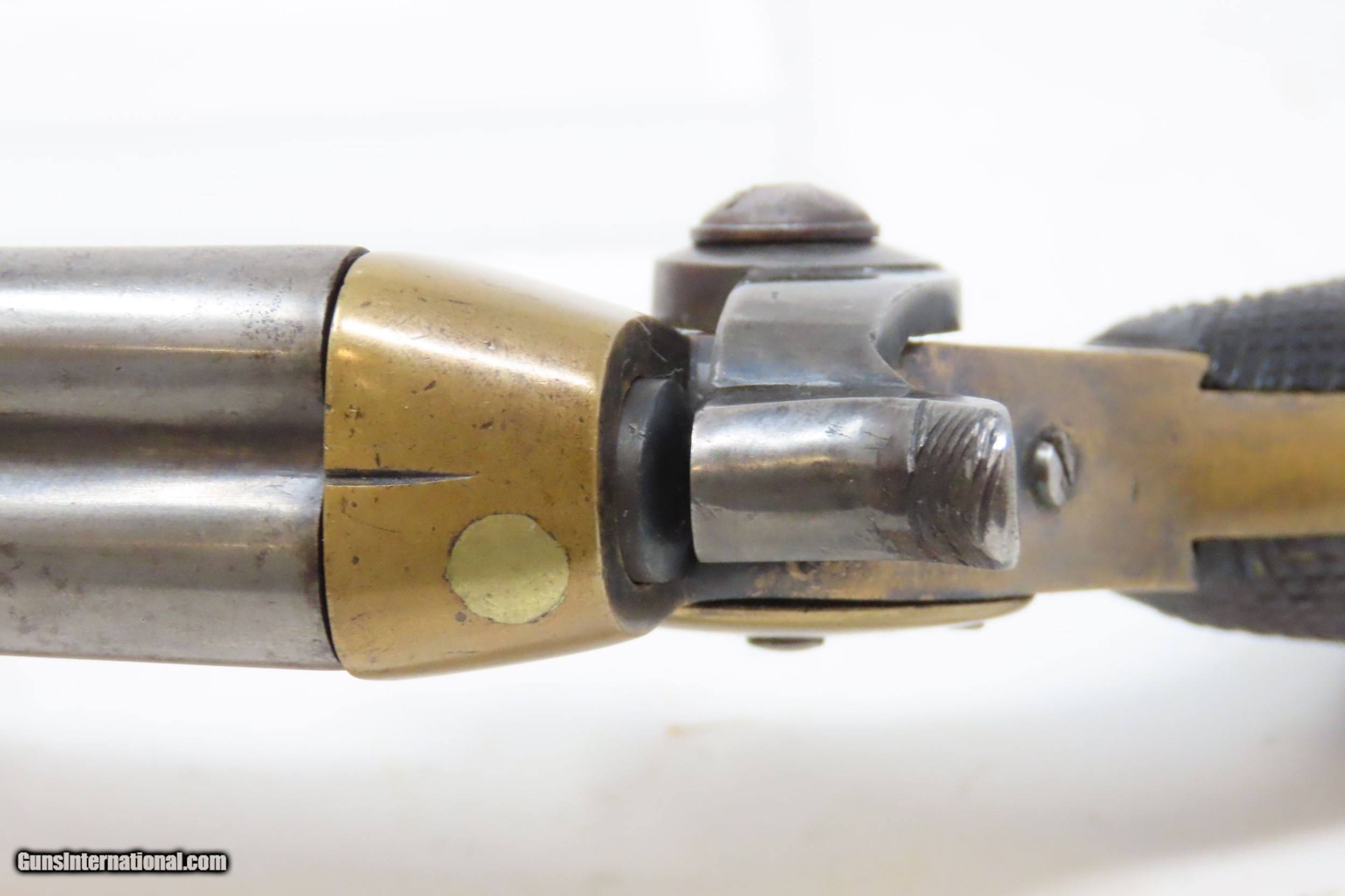Description: SCARCE Antique EBEN T. STARR .32 Caliber RF Four Barrel PEPPERBOX Pistol Only 2,000 Estimated Made in the Late 1860s Here we present an antique Eben T. Starr Pepperbox Pistol, manufactured circa 1864-69 in New York, New York. This pistol was designed by prolific inventor Eben T. Starr and it very much resembles Christian Sharps’ own pepperbox pistol, complete with a revolving firing pin. The Starrs were actually produced by the Merrill Patent Firearms Mfg. Co. in Baltimore, Maryland. Starr was also the inventor of several Civil War weapons including both a double and a single action revolver as well as a cavalry carbine. This specimen is a 3rd Model with the barrel release spring not visible on the right exterior of the frame. The left side of the plate is marked “STARR’S PAT’S/MAY 10, 1864”. Unlike the Sharps Pepperbox, the Starr features a distinct push-button trigger, a side-mounted hammer, and a rotating firing pin that is housed within the frame rather than on the hammer. The barrels also pivot on a hinge at the front of the frame rather than sliding forward. The overall condition is good+. Strong action with a fully functioning firing pin. Good bores, semi-bright with a few patches of pitting. Legible markings. Good grips with sharp checkering. Own the original! This is a legitimate antique and not a reproduction. Barrel is 2-3/4 inches. Caliber: .32 Rimfire Overall condition as seen in photos. Very Fast. Very Safe. FREE SHIPPING WORLDWIDE. Delivered directly to your door by express mail! Guaranteed AUTHENTIC & Includes CERTIFICATE OF AUTHENTICITY. ancestryguns $1425 #217469 SOLD Antique: Yes |
