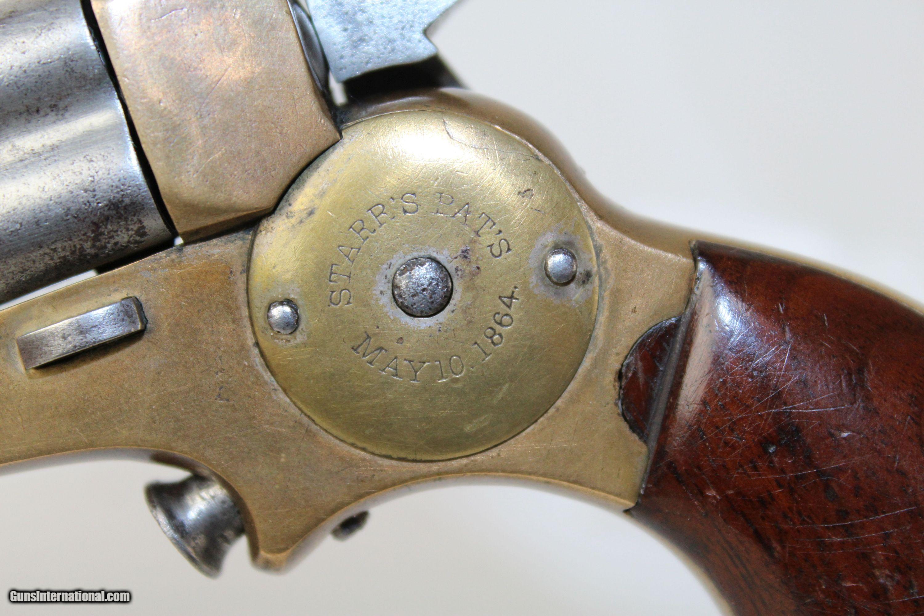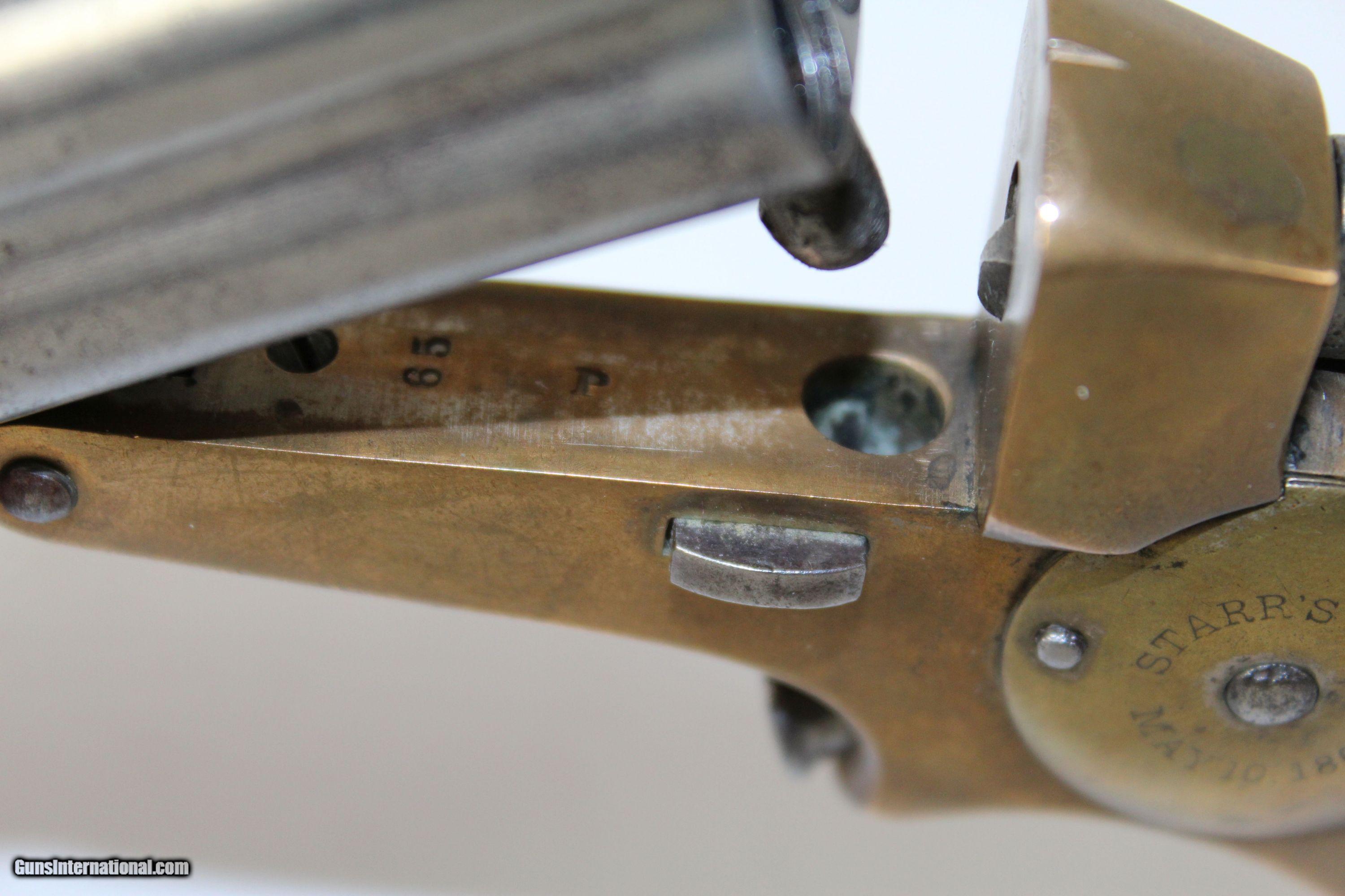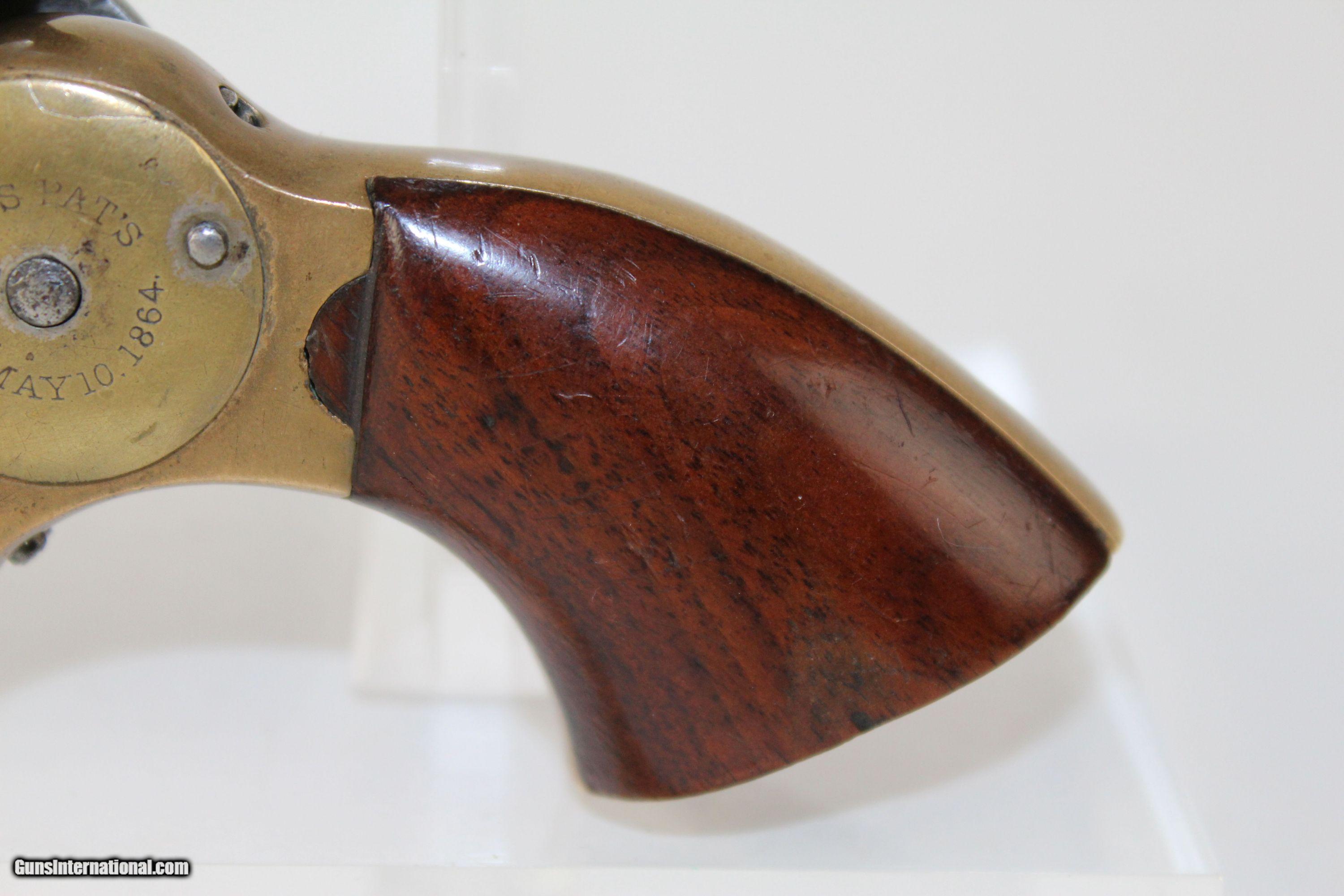 Description: SCARCE Antique Eben T. Starr PEPPERBOX Pistol in .32 Only 2,000 Estimated Made in the Late 1860s Here we present an antique Eben T. Starr Third Model Pepperbox Pistol, manufactured circa the late 1860s. This pistol was designed by prolific inventor Eben T. Starr and it very much resembles Christian Sharps’ own pepperbox pistol, complete with a revolving firing pin. The Starrs were actually produced by the Merrill Patent Firearms Mfg. Co. in Baltimore, Maryland. Starr was also the inventor of several Civil War weapons including both a double and a single action revolver as well as a cavalry carbine. This specimen is a 3rd Model with the barrel release spring not visible on the right exterior of the frame. The left side of the plate is marked “STARR’S PAT’S/MAY 10, 1864”. Unlike the Sharps Pepperbox, the Starr features a distinct push-button trigger, a side-mounted hammer, and a rotating firing pin that is housed within the frame rather than on the hammer. The barrels also pivot on a hinge at the front of the frame rather than sliding forward. The overall condition is very good. The metal surfaces and smooth and bright. The markings are clear and legible. The walnut grips are in great shape. All four bores are bright with strong rifling and minor patches of roughness. The action on this pepperbox is excellent. Here is a very scarce, if not rare, example of a very neat American Pepperbox! Own the original! This is a legitimate antique and not a reproduction. Barrel is 3-1/8 inches. Caliber: .32 Rimfire Overall condition as seen in photos. Very Fast. Very Safe. FREE SHIPPING WORLDWIDE. Delivered directly to your door by express mail! Guaranteed AUTHENTIC & Includes CERTIFICATE OF AUTHENTICITY. ancestryguns $1425 #6263 SOLD Antique: Yes |