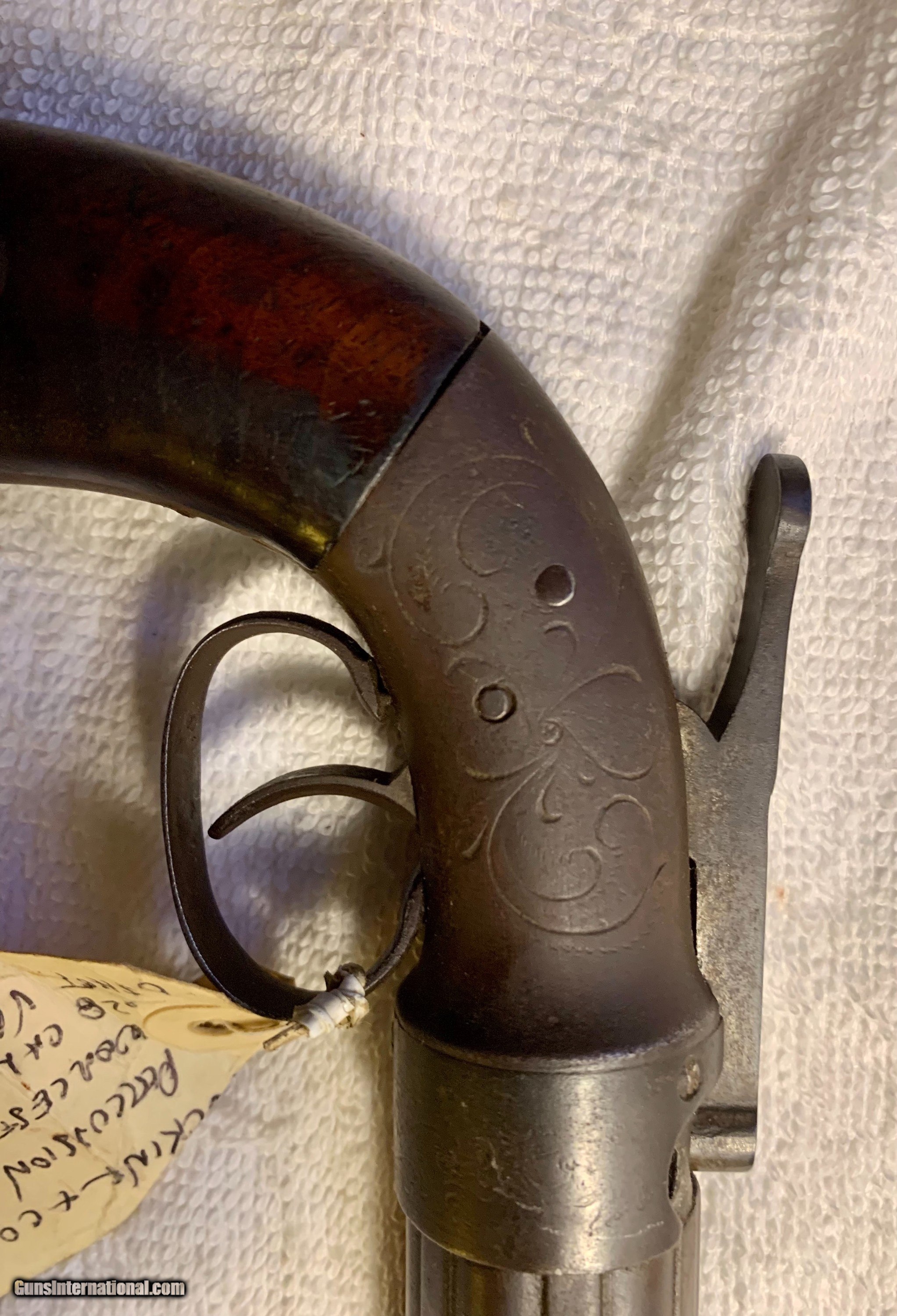 Description: Very nice piece, single action percussion pepperbox Worcester Ma c1845-50 .28 caliber, 3 1/2" barrel SOLD Antique: Yes |