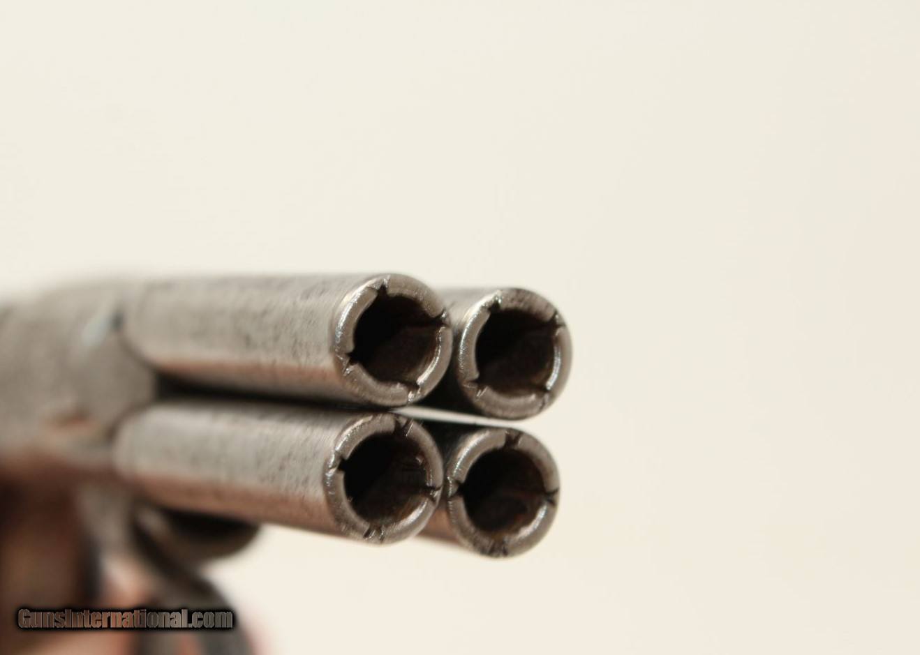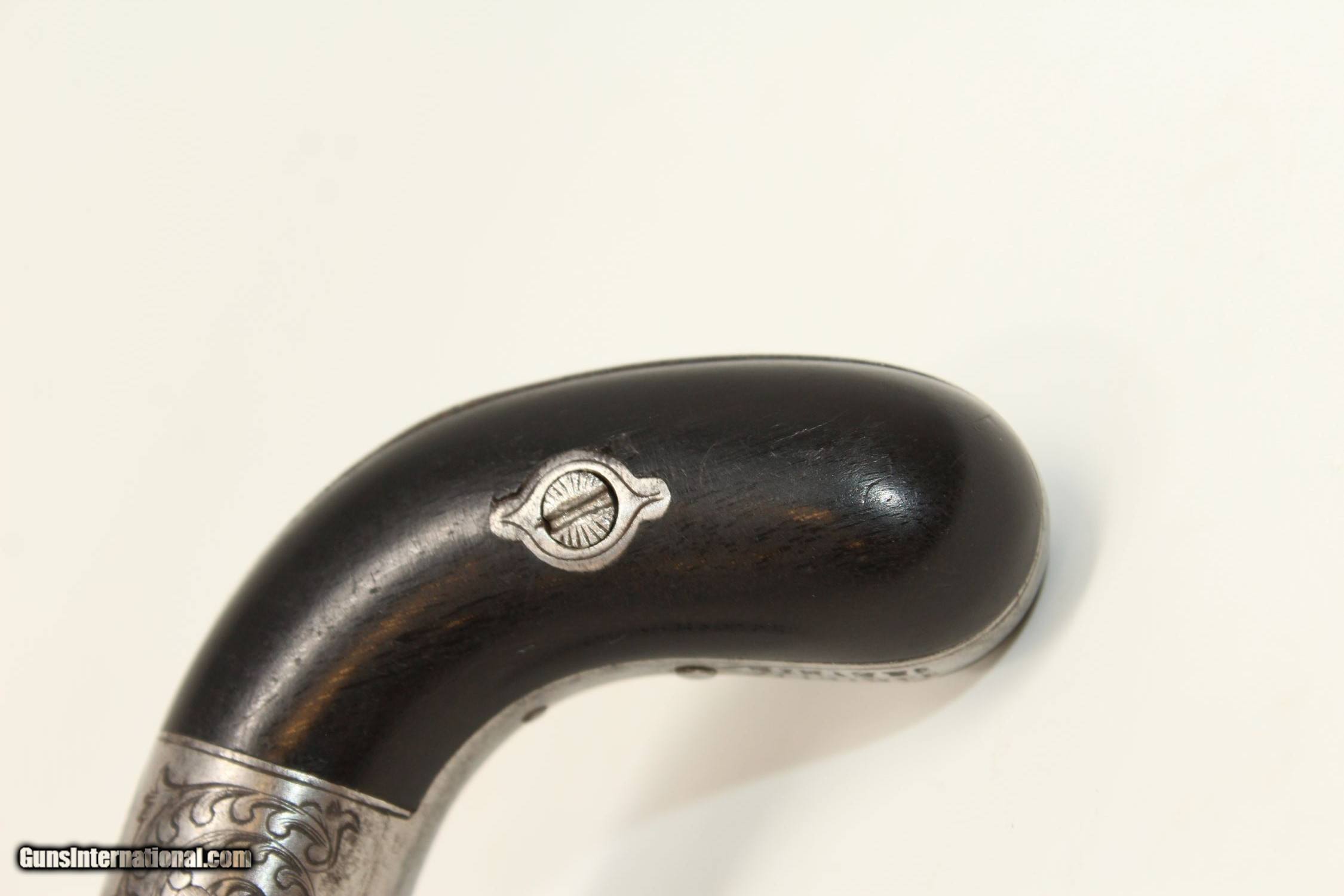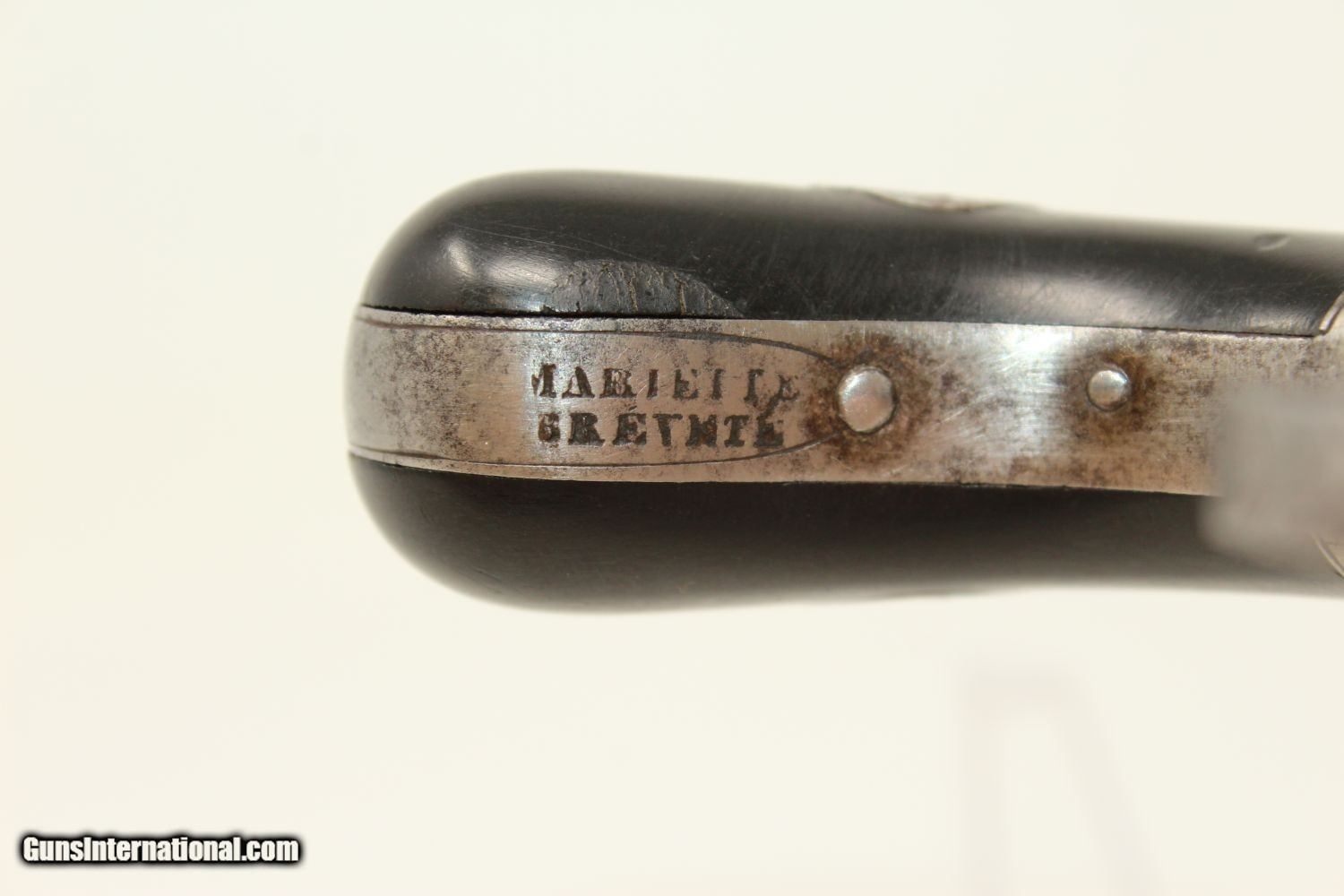 Description: TINY Vest-Pocket ENGRAVED Antique .22 PEPPERBOX Fine Mariette Brevette from 1850s Belgium Here we present an antique Belgian Mariette Brevette Ring Trigger/Under Hammer Percussion Pepperbox. This firearm was made in the 1850s in Liege, Belgium, known for centuries now as one of the foremost firearms capitals of the world. It was expressly made for self-defense, giving the shooter 4 shots of .22 caliber ball without having to cock a hammer. This pistol is double action, with a cluster of 4 barrels that revolves with each pull of the trigger. This is a percussion piece, and each of the 4 barrels is keyed and can be independently unscrewed for loading. In fact, each of the barrels is numbered and corresponds to the same number on the firearm, so that the user could not lose track of which barrel goes to its particular portion of the breech. The loading of the gun from the breech, rather than from the muzzle, was beneficial to loading a larger ball—yielding a better gas seal—as opposed to trying to load from the muzzle. The grip frame is marked “Mariette Brevete”. The barrels and breeches are numbered 1-4 in sequence. This gun is numbered “1017” on the top of the frame. The breech of the barrel cluster is Liege proofed with a “Crown/AF”, for Auguste Francotte. The overall condition is fine. The iron parts retain their bright white finish. The markings are clear, along with the engravings. The grips are in fine shape. The bores are smooth and dark. The action is excellent. Here is a rare, vest pocket-sized .22 caliber percussion pepperbox from 19th Century Belgium! Own the original! This is a legitimate antique and not a reproduction. Barrel is 1-3/8 inches. Caliber: .22 Percussion Overall condition as seen in photos. Very Fast. Very Safe. FREE SHIPPING WORLDWIDE. Delivered directly to your door by express mail! Guaranteed AUTHENTIC & Includes CERTIFICATE OF AUTHENTICITY. ancestryguns $1600 #190335 SOLD Antique: Yes |