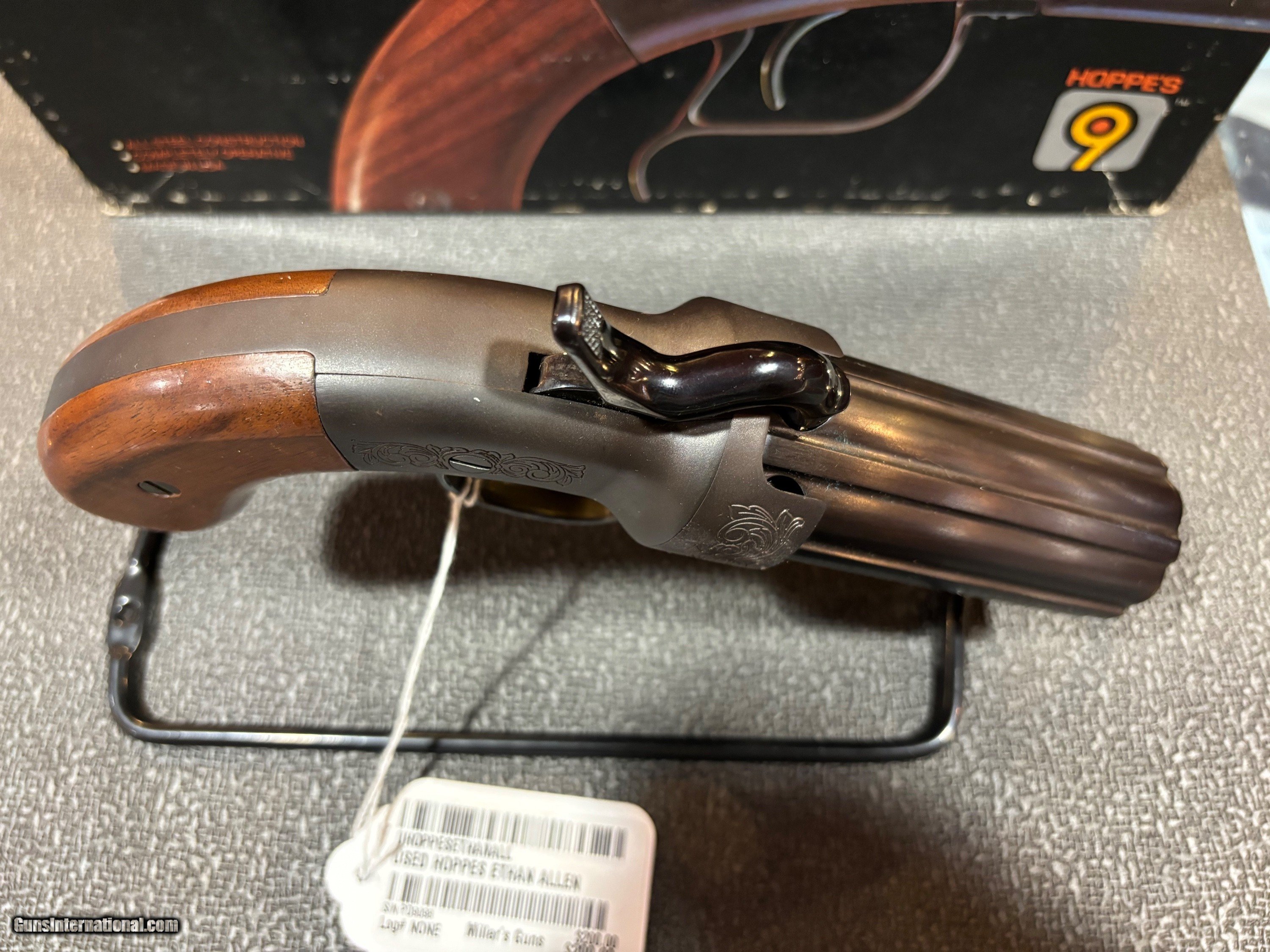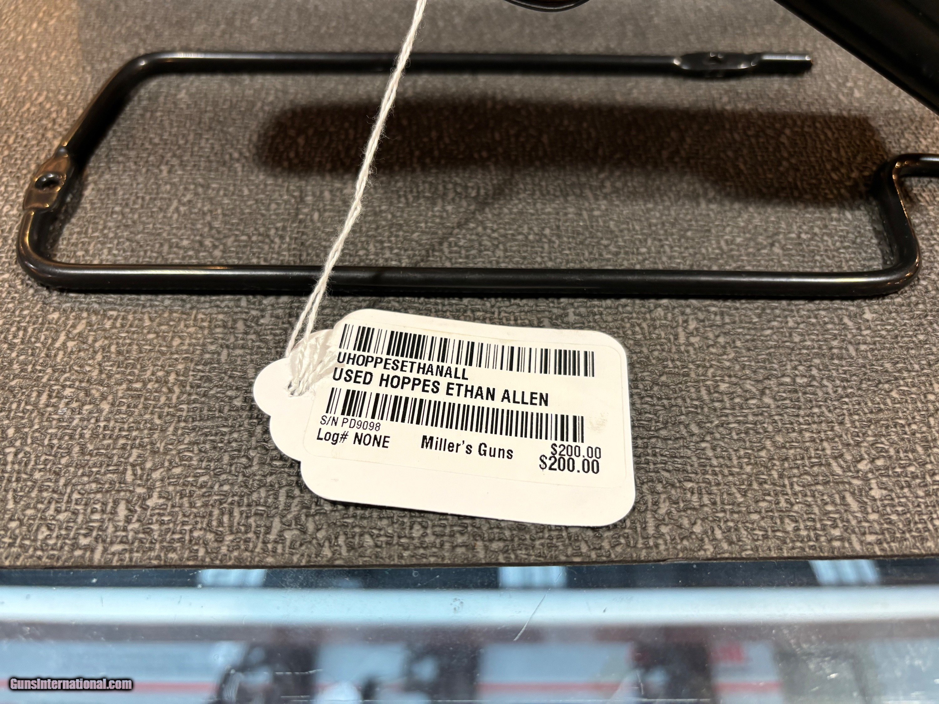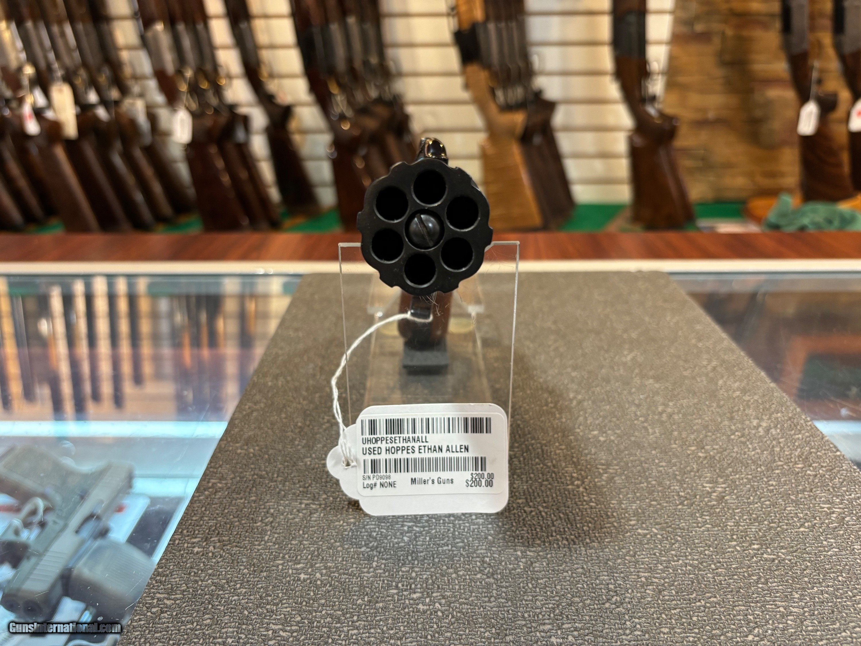 Description: USED Hoppes 9 Ethan Allen Pepperbox pistol .36 caliber 6 position Black powder Has box and literature SOLD Manufacturer: Hoppes 9 Model: Ethan Allen model 200 Pepperbox Serial Number: PD9098 Condition: Very Good |