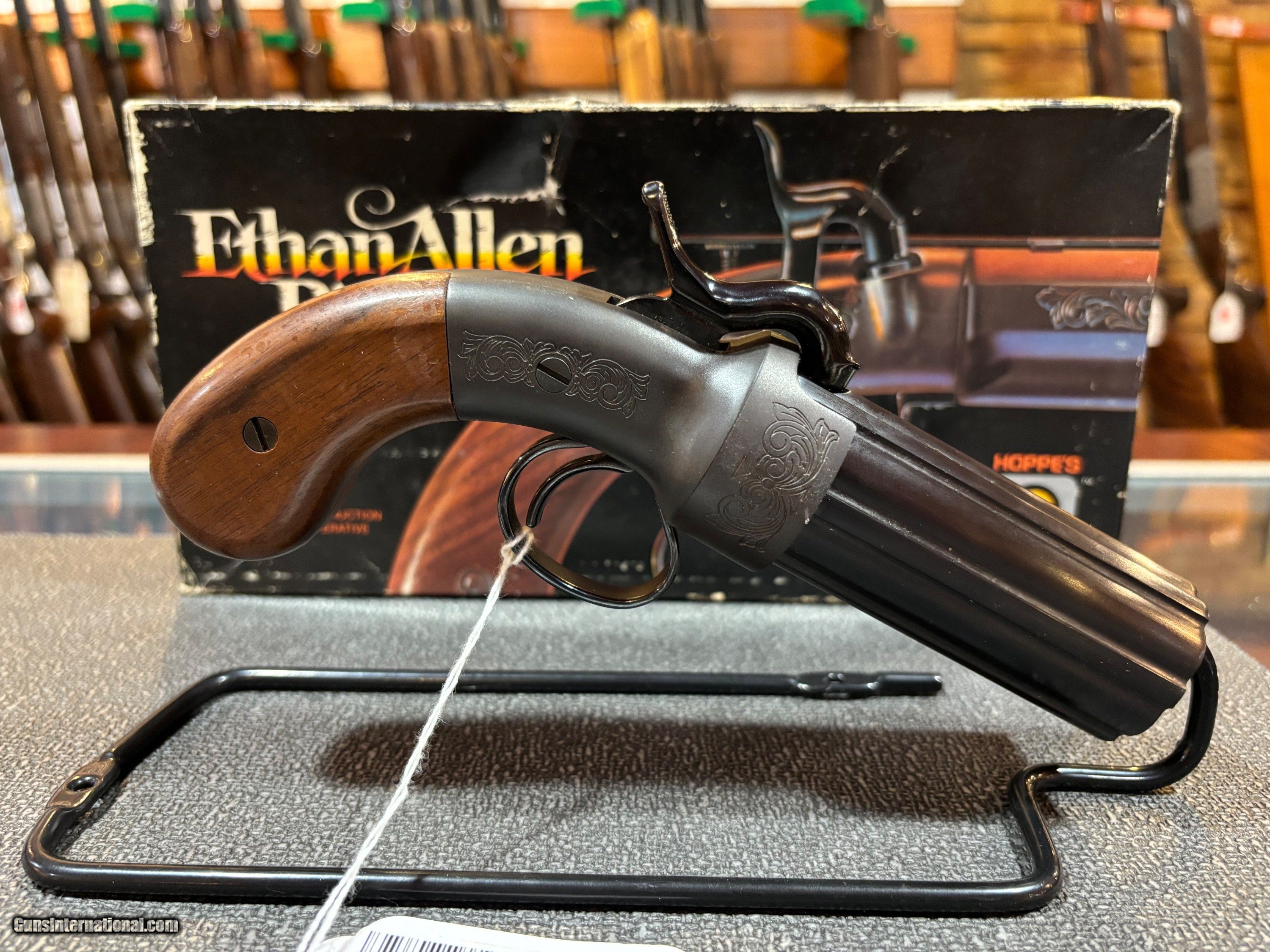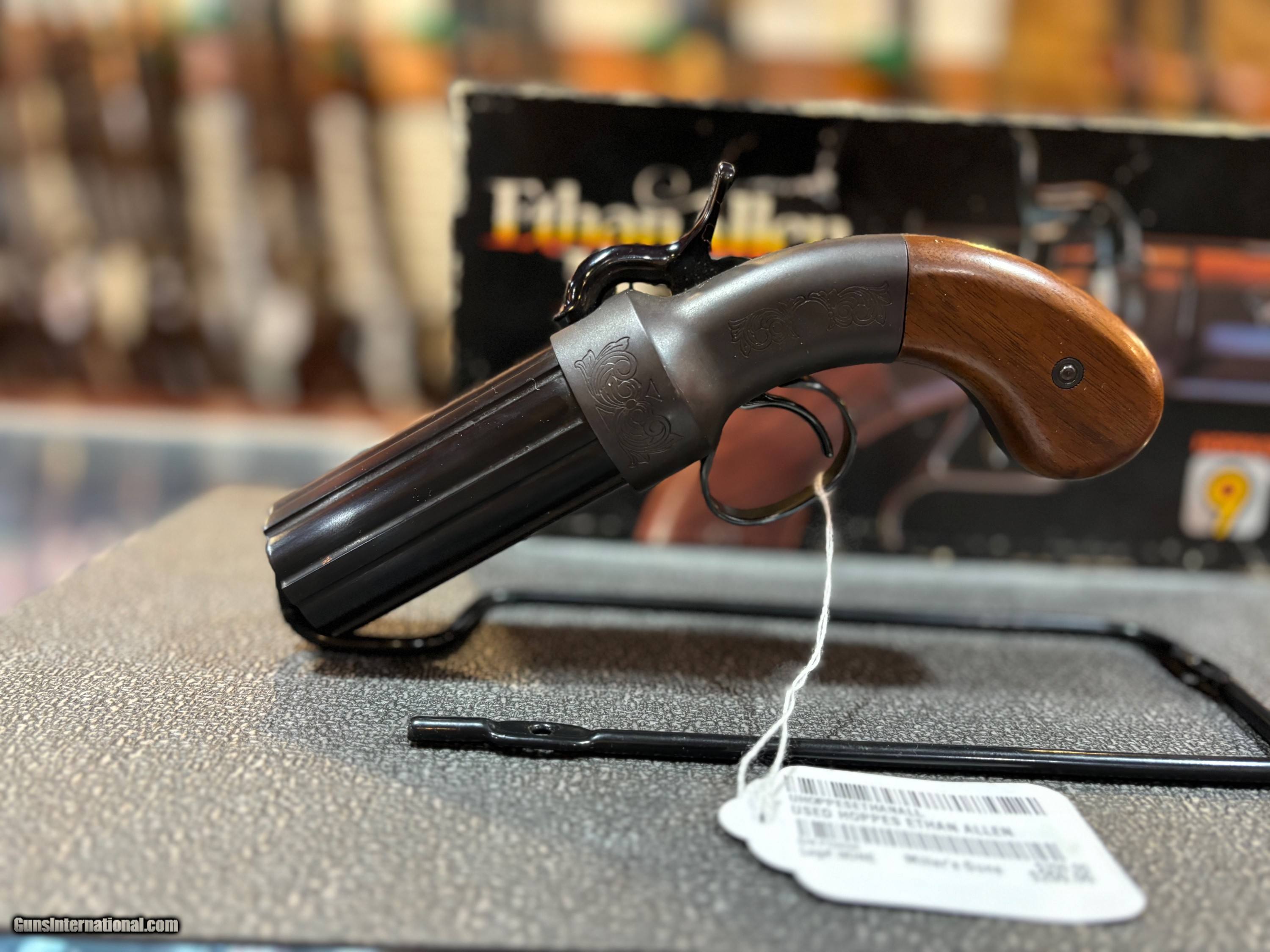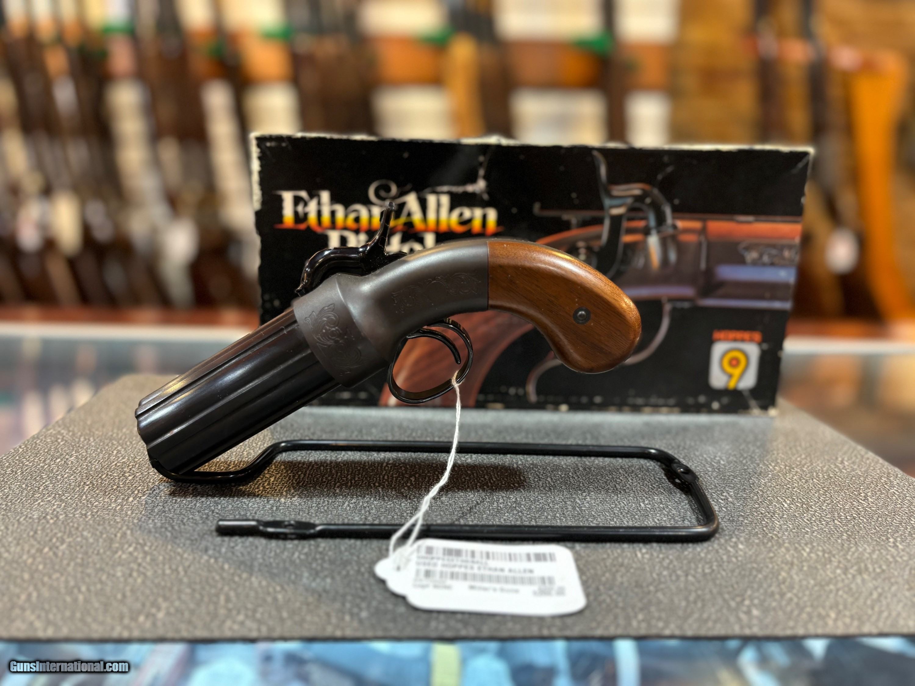 Description: USED Hoppes 9 Ethan Allen Pepperbox pistol .36 caliber 6 position Black powder Has box and literature SOLD Manufacturer: Hoppes 9 Model: Ethan Allen model 200 Pepperbox Serial Number: PD9098 Condition: Very Good |