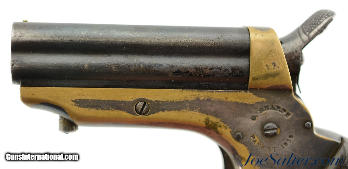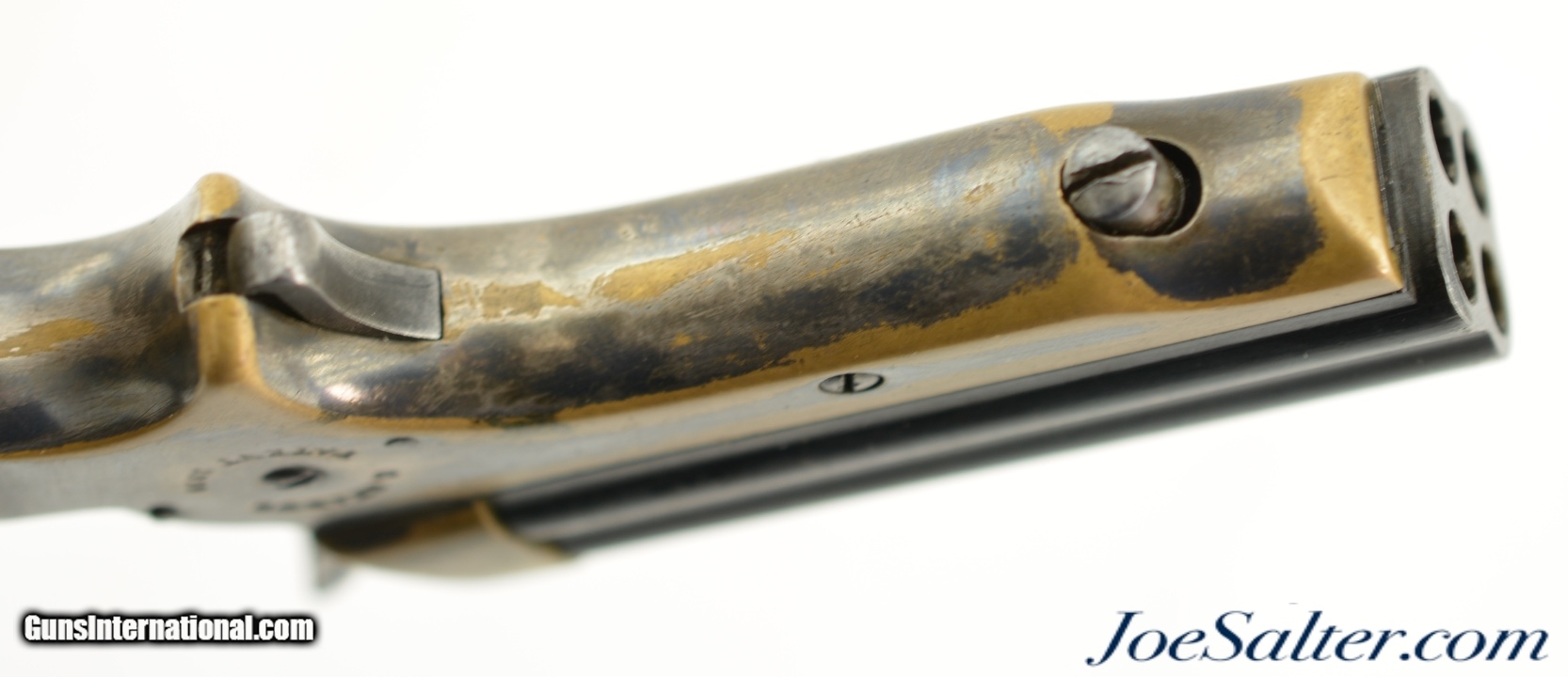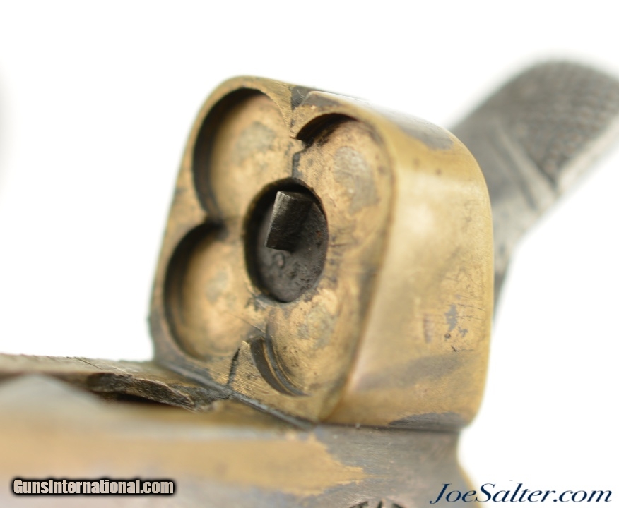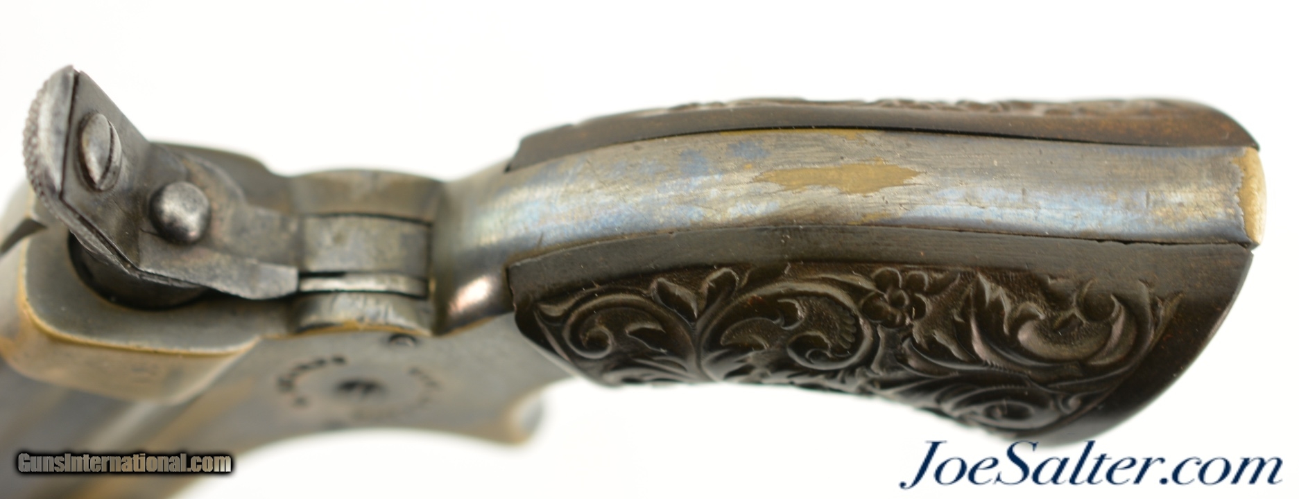 Description: Serial #18842, .22 RF (black powder), 2.5 inch barrels with fine bores having strong rifling and spots of roughness. This is the Model 1A 4 shot "Pepperbox" pocket pistol manufactured by C. Sharps & Co. in Philadelphia with an 1859 patent date. In very fine condition the barrels have about 75-80% blue fading around the muzzle and along the high edges. The frame shows about 50-55% of the original silver plate worn to smooth brass along the edges. The gutta-percha grips rate excellent and the markings are crisp on this example. The action functions properly with tight lock up and proper firing pin advancement on the hammer with each pull. A very fine to near excellent example of these classic little pocket pistols. Antique SOLD Antique: Yes |