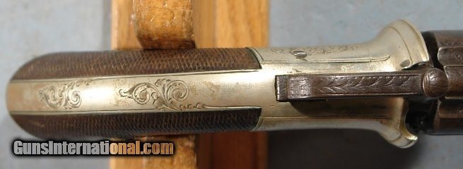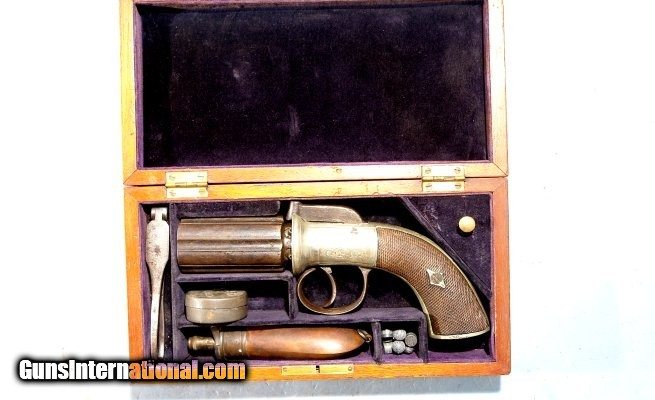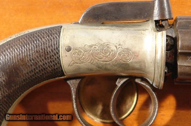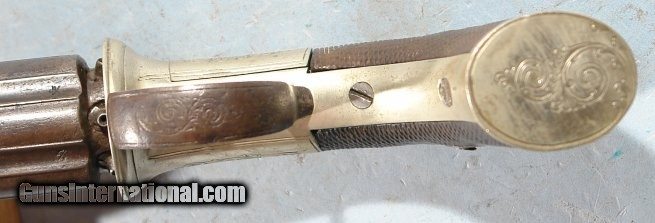Description: VERY FINE CASED BRITISH PERCUSSION BAR-HAMMER PEPPERBOX BY ADKIN OF BEDFORD CIRCA 1850. .36 cal. six shot belt size pepperbox with 3” barrels. Nickel alloy engraved frame maker signed “ADKIN BEDFORD”. All original and fine with high quality engraving and workmanship this well known British maker. Checkered walnut grips in excellent condition. Barrels with British proofs between the flutes and having a nice original dark patina. Working order and nice bores. Excellent original case with the original lining in fine condition. Original mold, flask and cap tin. SOLD Antique: Yes |