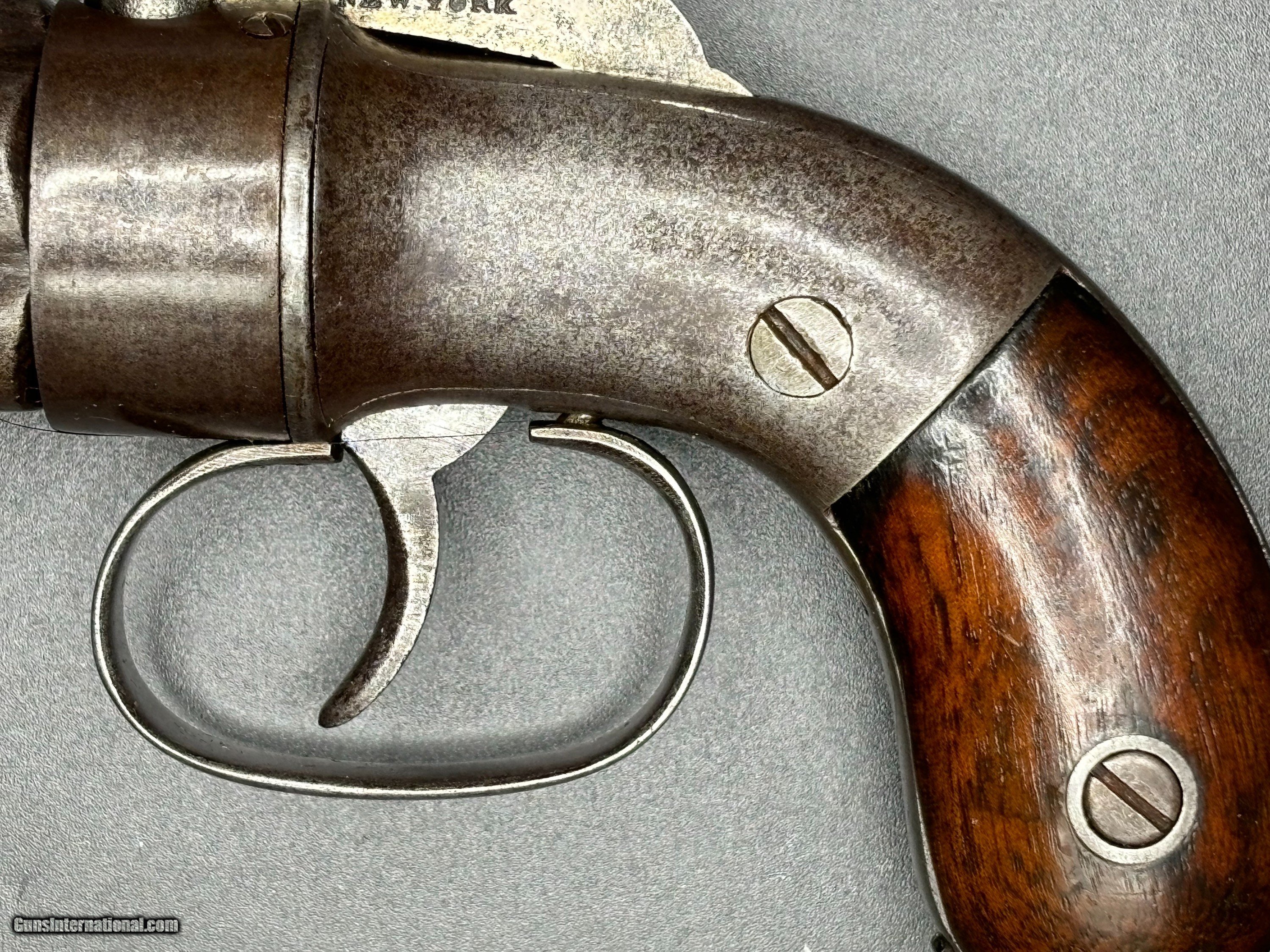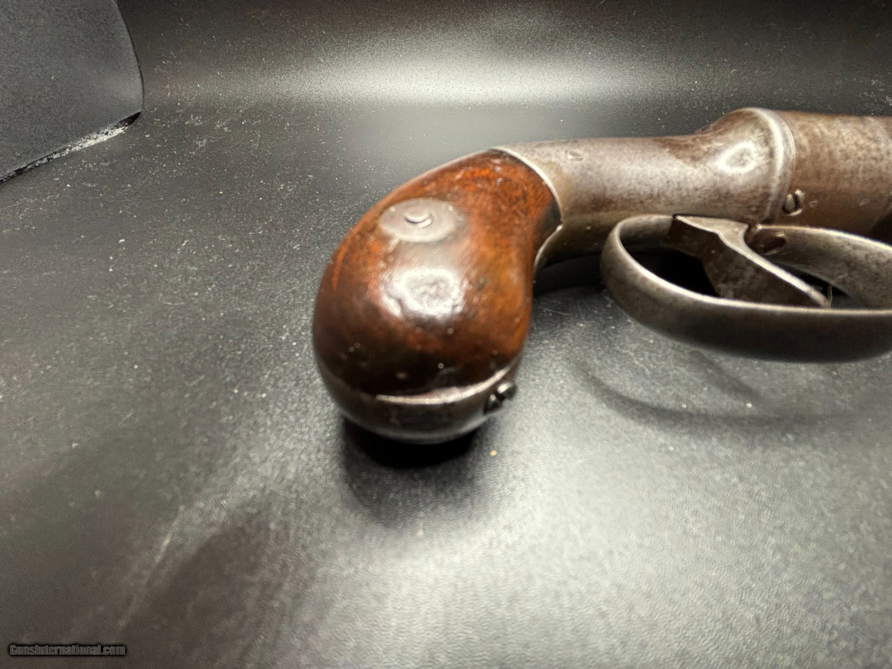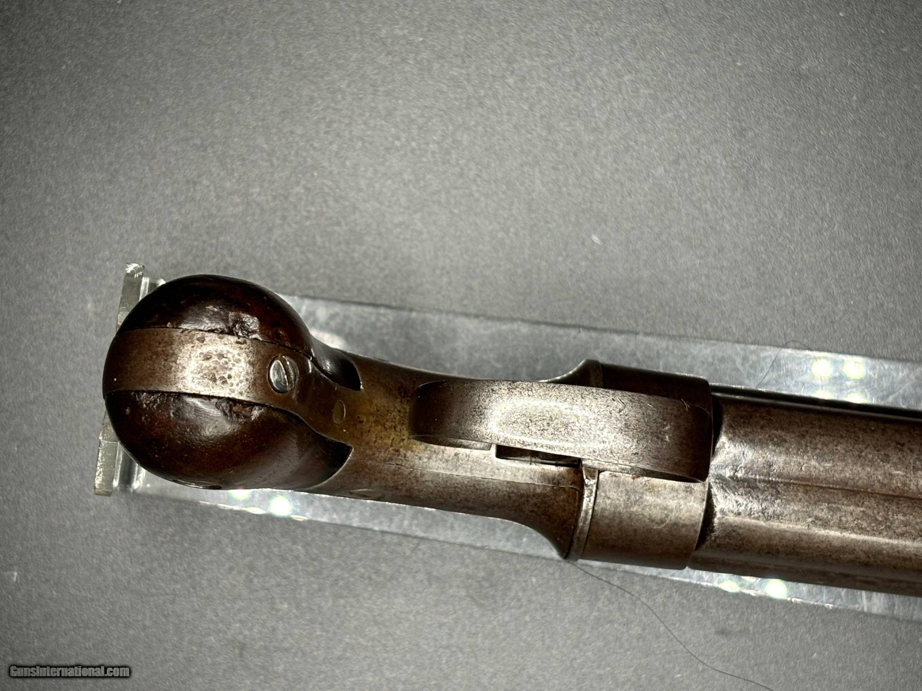 Description: Very Rare Manhattan Arms co. .31 cal , 5 shot pepperbox with 3” barrel MANHATTAN F.A. MFG.CO / NEW YORK Serial number 301 Manhattan Arms Co. Pepperbox Pistol Manufacturer: Manhattan Arms Company Model: Pepperbox Pistol Caliber: .31 Barrel Length: 3 inches Production Period: Mid-19th century, primarily during the Civil War era Estimated Production Quantity: Approximately 3,000 units Brief Company History: The Manhattan Arms Company was a significant player in the firearms industry during the mid-19th century. Founded in 1856, it was based in Newark, New Jersey. The company quickly gained prominence for its innovative designs and quality craftsmanship, particularly in the realm of revolvers and pistols. Manhattan Arms Co. was a direct competitor to other renowned firearm manufacturers of the time, including Colt, Remington, and Smith & Wesson. Their firearms, including the pepperbox pistols, were highly regarded for their reliability and effectiveness, earning them popularity among both civilian and military markets. Features and Historical Significance: Design: The Manhattan Arms Co. pepperbox pistols featured a unique design with multiple barrels (typically five) arranged in a circular pattern around a central axis. This configuration allowed for quick successive shots without the need for reloading. Caliber: The .31 caliber variant was among the most common produced by Manhattan Arms Co. It provided a balance between firepower and manageability. Popularity during the Civil War: Manhattan Arms pepperbox pistols saw extensive use during the Civil War period. They were favored by both Union and Confederate soldiers for their compact size, ease of use, and rapid firing capability. These pistols were often carried as sidearms by officers and cavalrymen. Limited Production: Despite their popularity, Manhattan Arms Co. pepperbox pistols were produced in relatively limited quantities compared to some of their competitors. The estimated production figure of around 3,000 units adds to their rarity and collectibility. Condition: .31 Cal 3" barrel cluster with light oxidized bores. The metal surfaces have evenly toned to an antique brown-gray patina with scattered areas of pinprick pitting. The bag shaped Walnut grips rate near excellent with a couple of small flakes along the bottom of the butt The bar hammer shows the marking, MANHATTAN F.A. MFG.CO / NEW YORK The barrel cluster and gripstrap are both serialized "301". The double action trigger does not reset with pushing forward with help but the action correctly times and the fixed machine nipples remain intact. Collector's Value: Due to their historical significance, limited production numbers, and association with the Civil War, Manhattan Arms Co. pepperbox pistols are highly sought after by collectors of antique firearms. Their value can vary greatly depending on factors such as condition, rarity of specific models, and historical provenance. A well-preserved example of the .31 caliber 5-shot pepperbox pistol with a 3" barrel, like the one is highly desirable among collectors of Civil War-era firearms. This pistol represents a rare and historically significant firearm from the Civil War era. Its innovative design, association with both Union and Confederate forces, and limited production make it a prized collectible for enthusiasts of antique firearms and military history alike. This gun is and Antique and ships direct to the buyer with FREE SHIPPING INCLUDED. Payment can be made with a personal check, money order, Zelle or Venmo. $925 reasonable offers considered SOLD Antique: Yes |