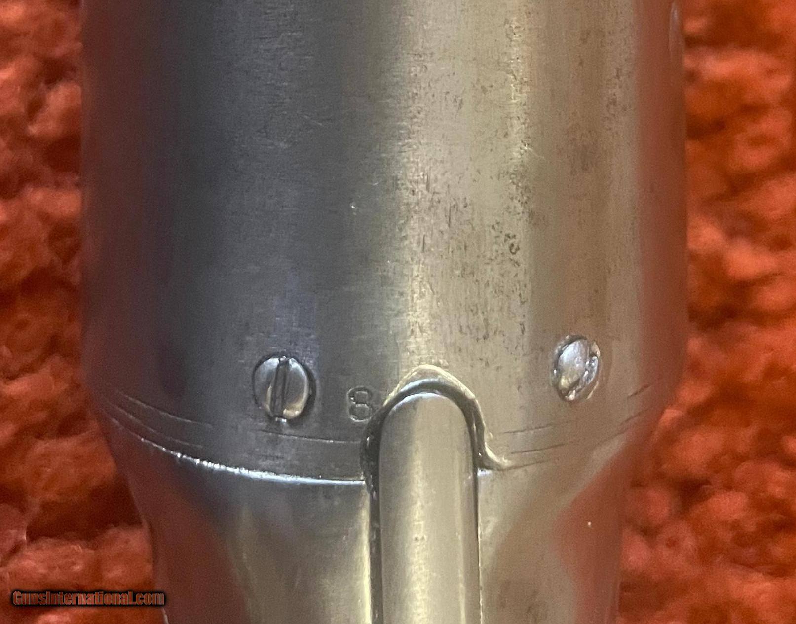 Description: The serial number "8" is stamped on the left side of the trigger and on the barrel sheath next to the trogger. We believe the very early pisols were finished bright as this one appears to be.. We have seen 1 other single digit gun finished bright. The action is functional. These guns were made in the late 1840s and early 1850s. The iron frame guns are much rarer than the brass frame. See photos for condition. SOLD Antique: Yes Manufacturer: Pecare and Smith Model: 10 Shot .28 Caliber Pepperbox Serial Number: 8 Barrel Length: 3 |