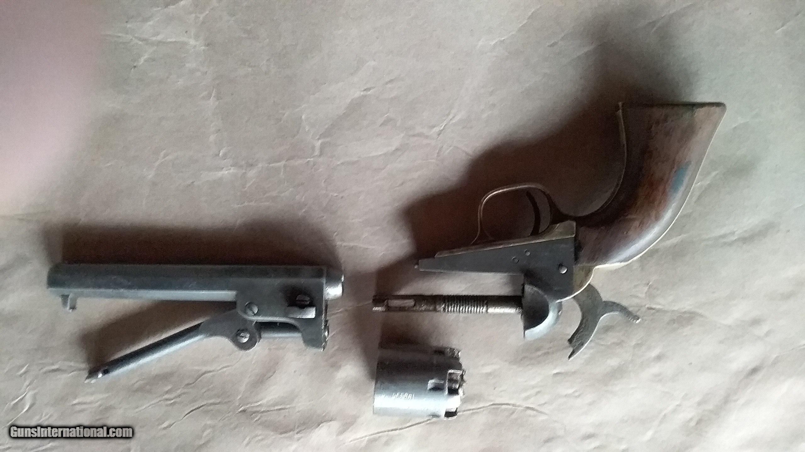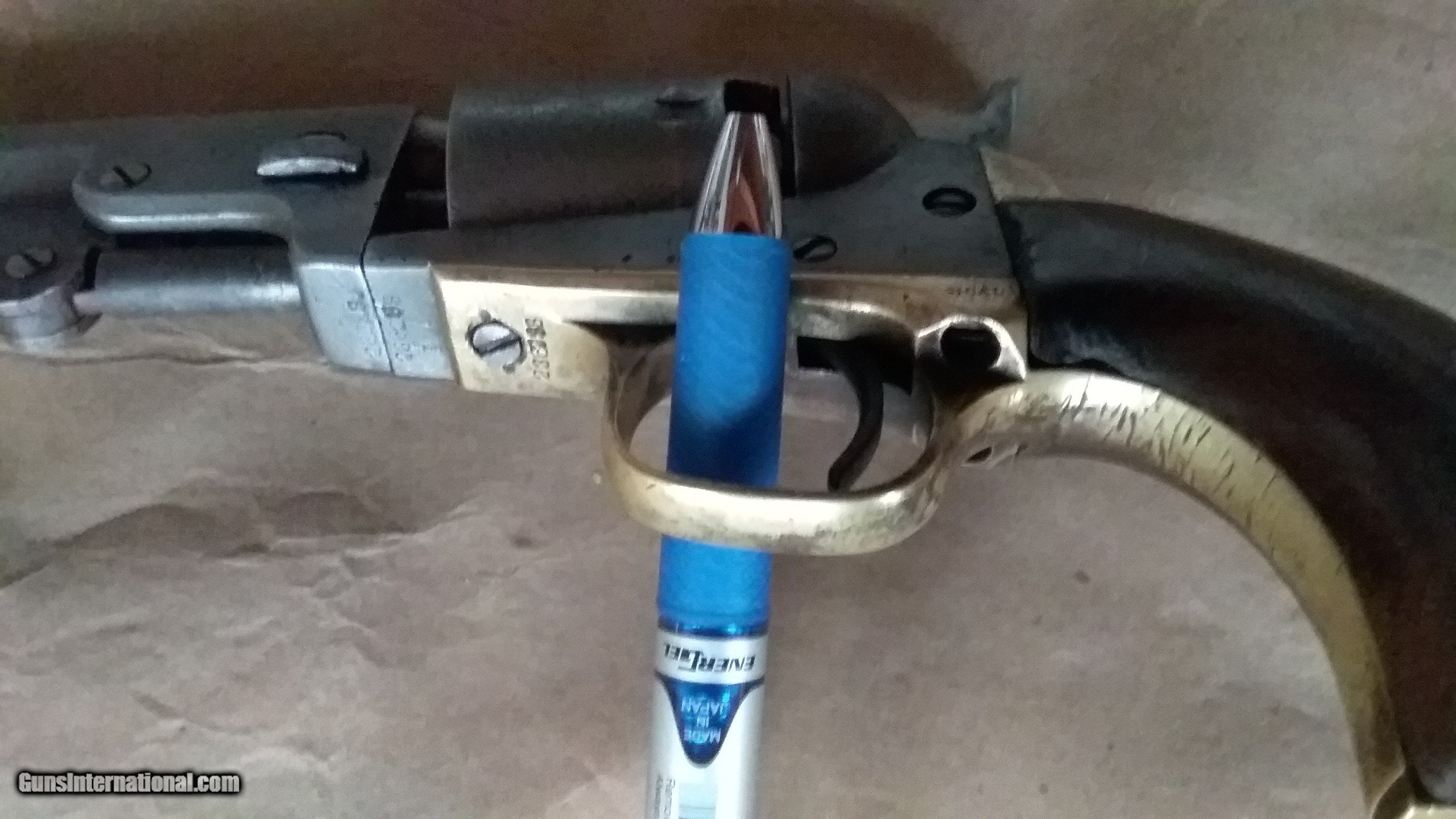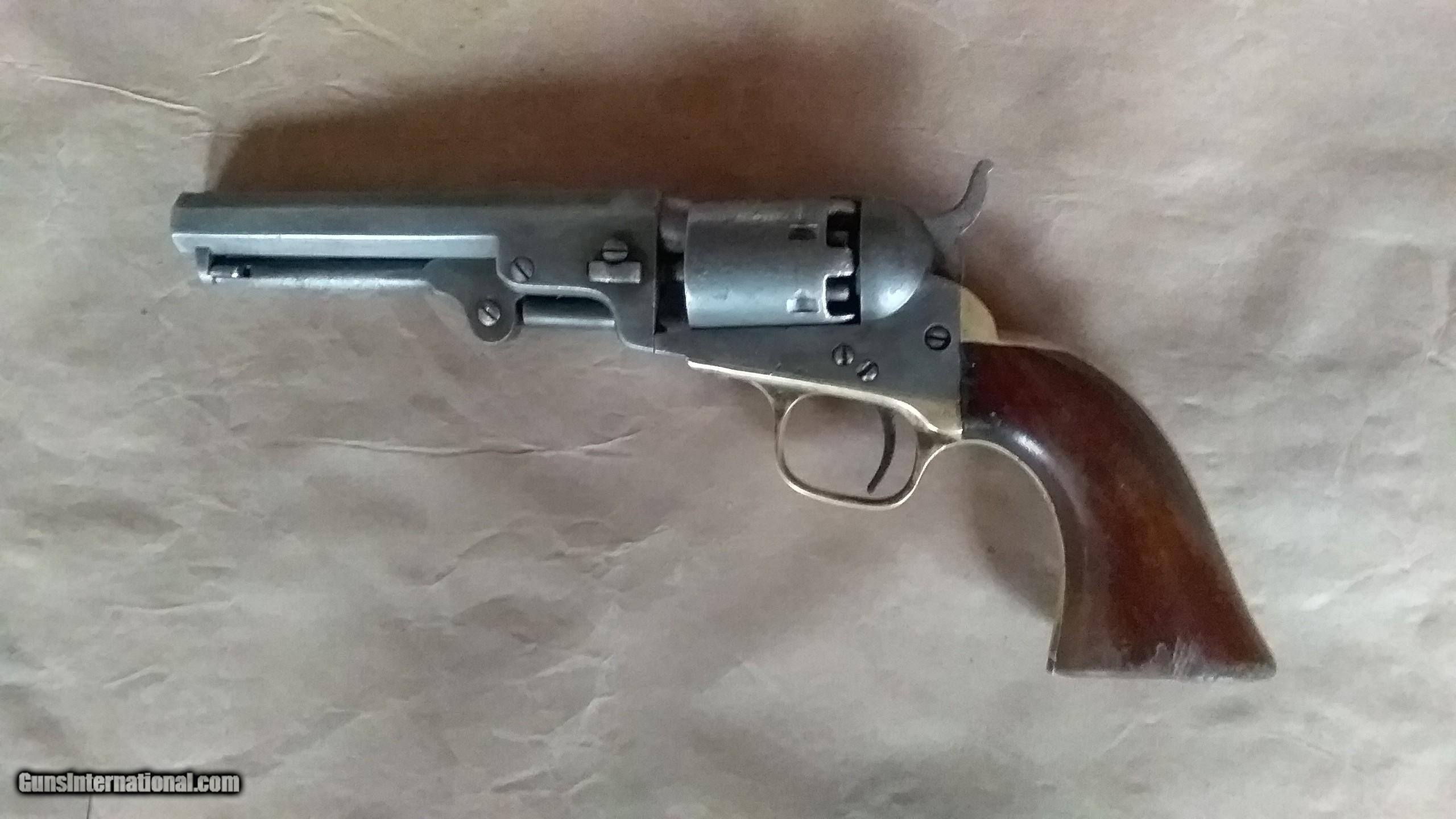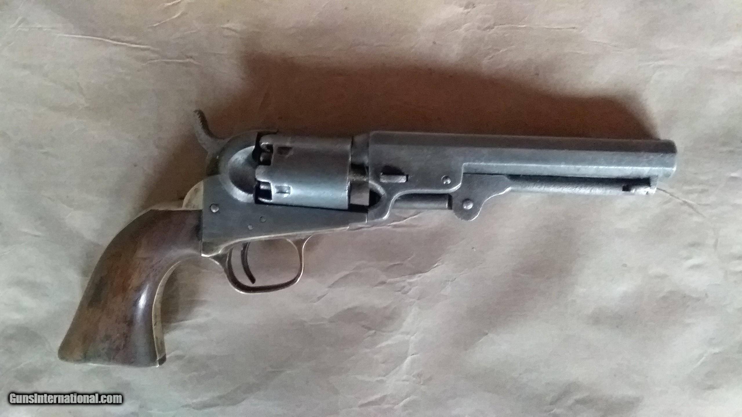 Description: Colt Civil War vintage Pocket Pistol, serial number 236288, made in 1862. All matching serial numbers, including the wedge. Most of the Pocket Pistols were 5 shot, this one is the harder to find 6 shot with the longer 6 inch barrel. Marked with single line "ADDRESS COL. SAML.COLT NEW-YORK U.S.AMERICA " on barrel, "COLTS PATENT "on frame and ".31 CAL " on trigger guard. Brass backstrap and trigger guard, I can find no evidence that they were ever silver plated. Well used but not abused, finish on wood grips is worn but partly intact, and has turned to patina on brass and iron surfaces. Cylinder rotates and locks up, but is slightly stiff. Bore is worn and pitted but still has strong visible rifling. The cylinder stagecoach scene is very faint, but still partly visible. Condition is fair to good, but is in pretty good shape for an historic 162 year old pistol that survived the Civil War and western expansion. SOLD Antique: Yes Manufacturer: Colt Model: 1849 Pocket Pistol Serial Number: 236288 Bore: . 31 Chambers: loose powder and ball Condition: fair to good Metal Condition: patina Wood Condition: good Bore Condition: pitted with visible rifling Barrel Type: Octogon Action: single action Manufacture Date: 1862 |