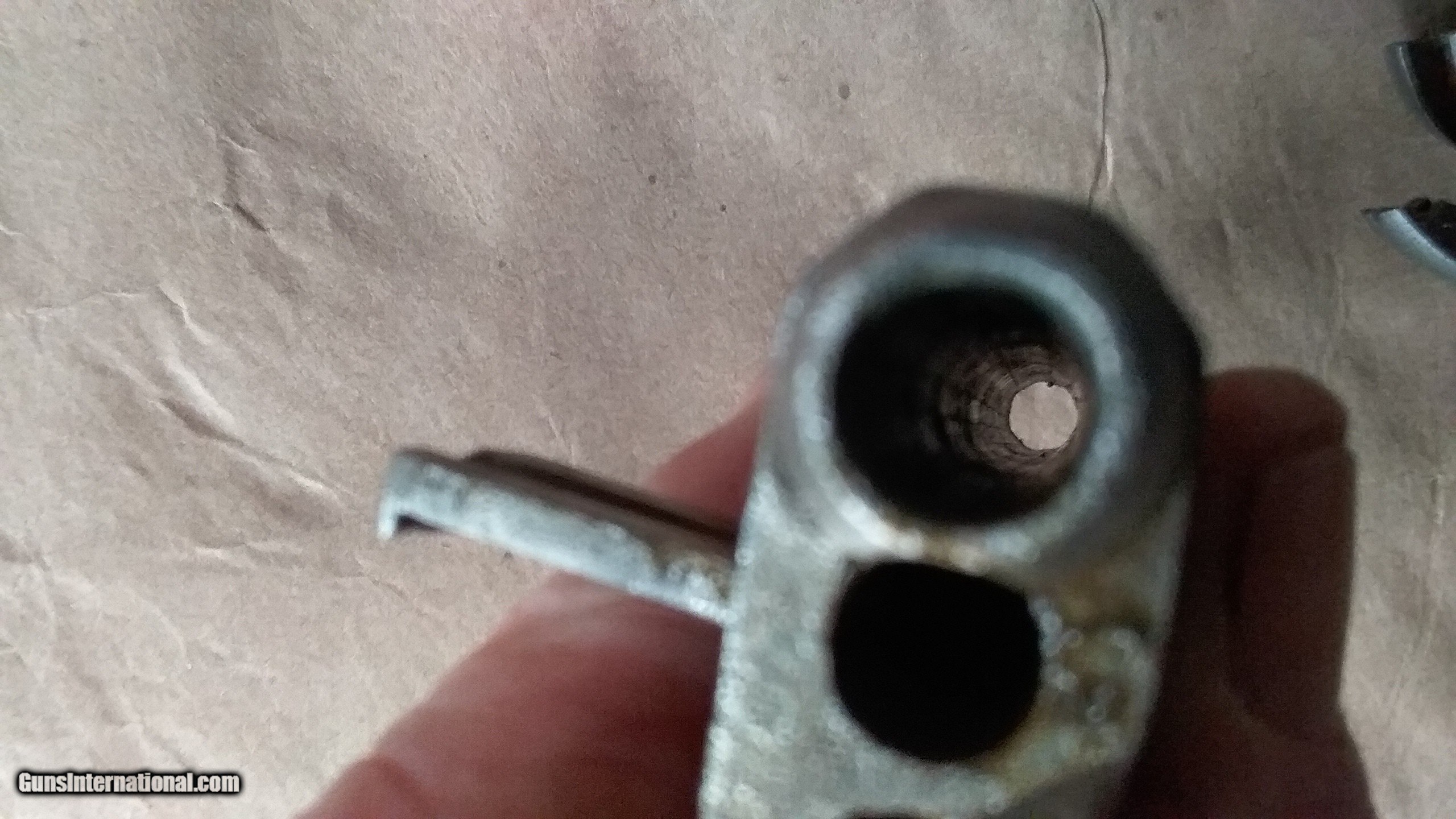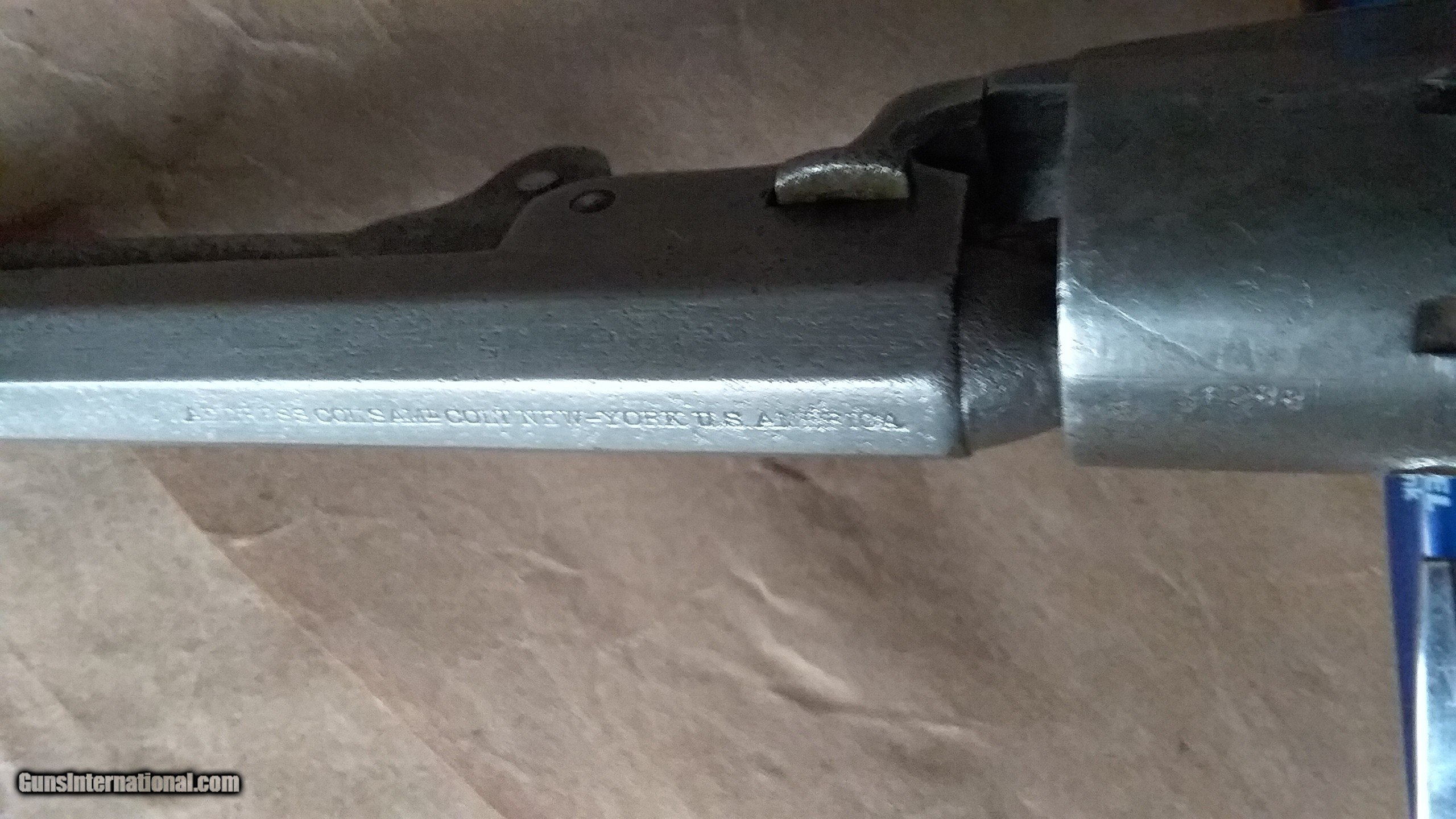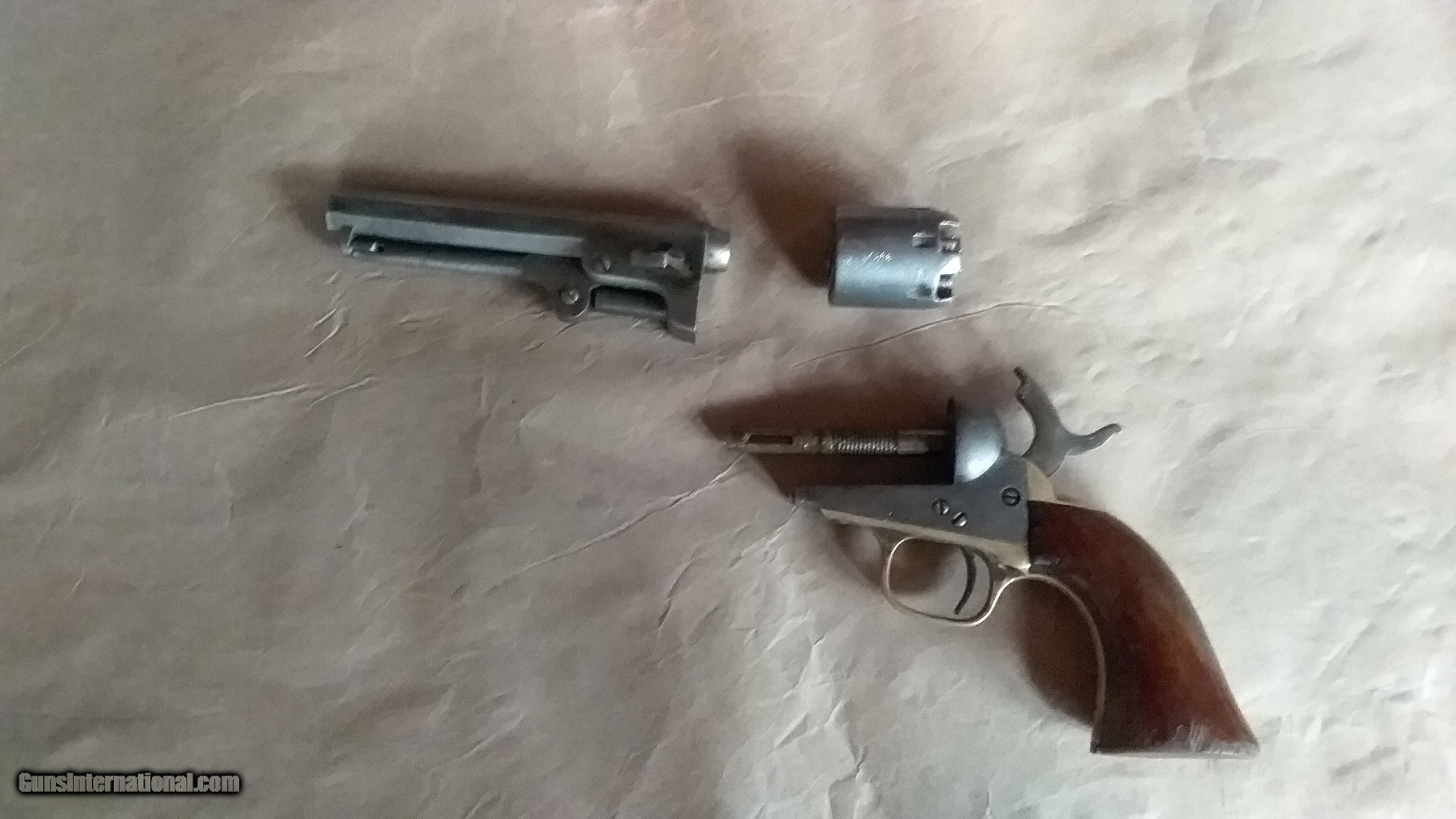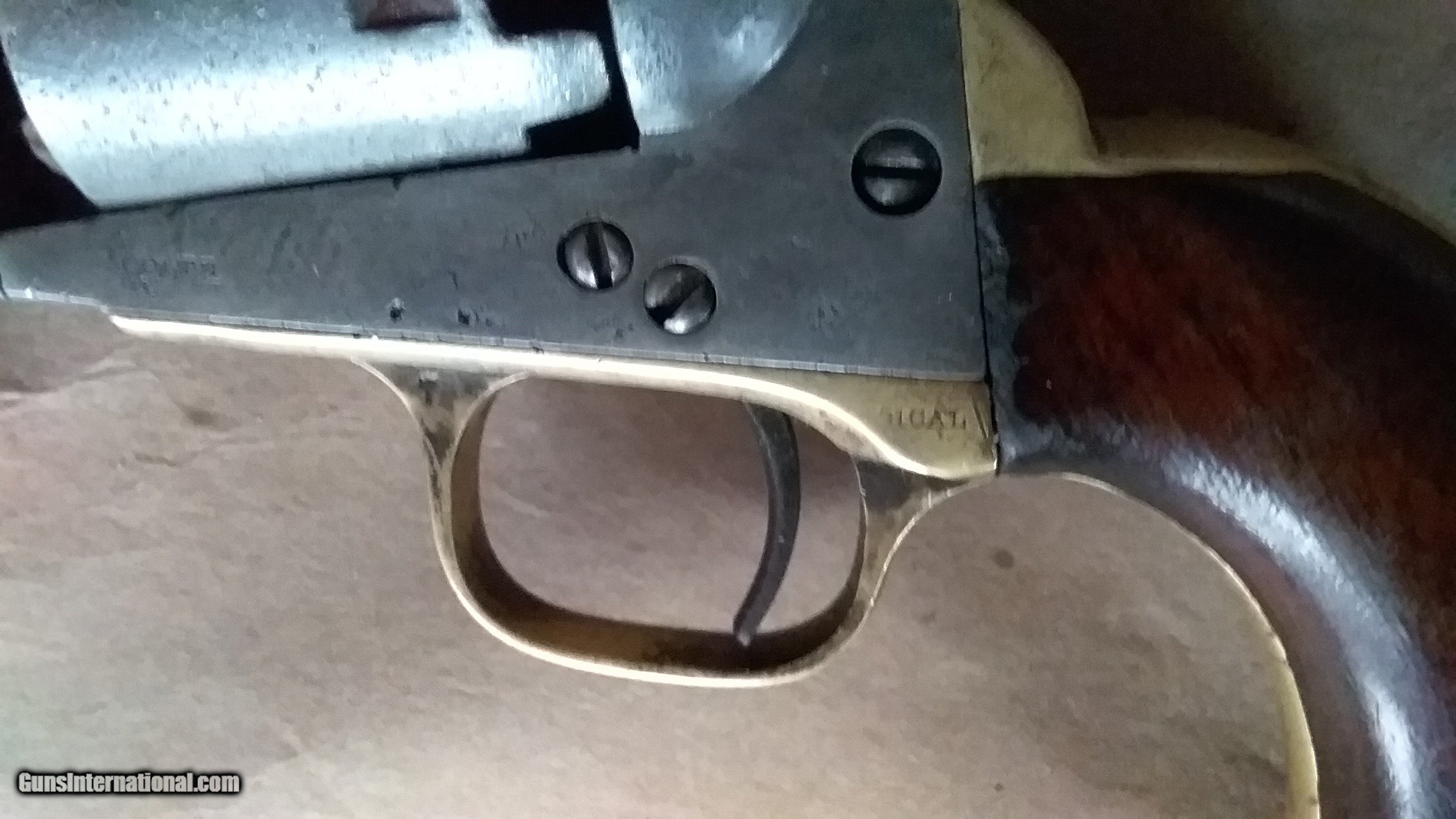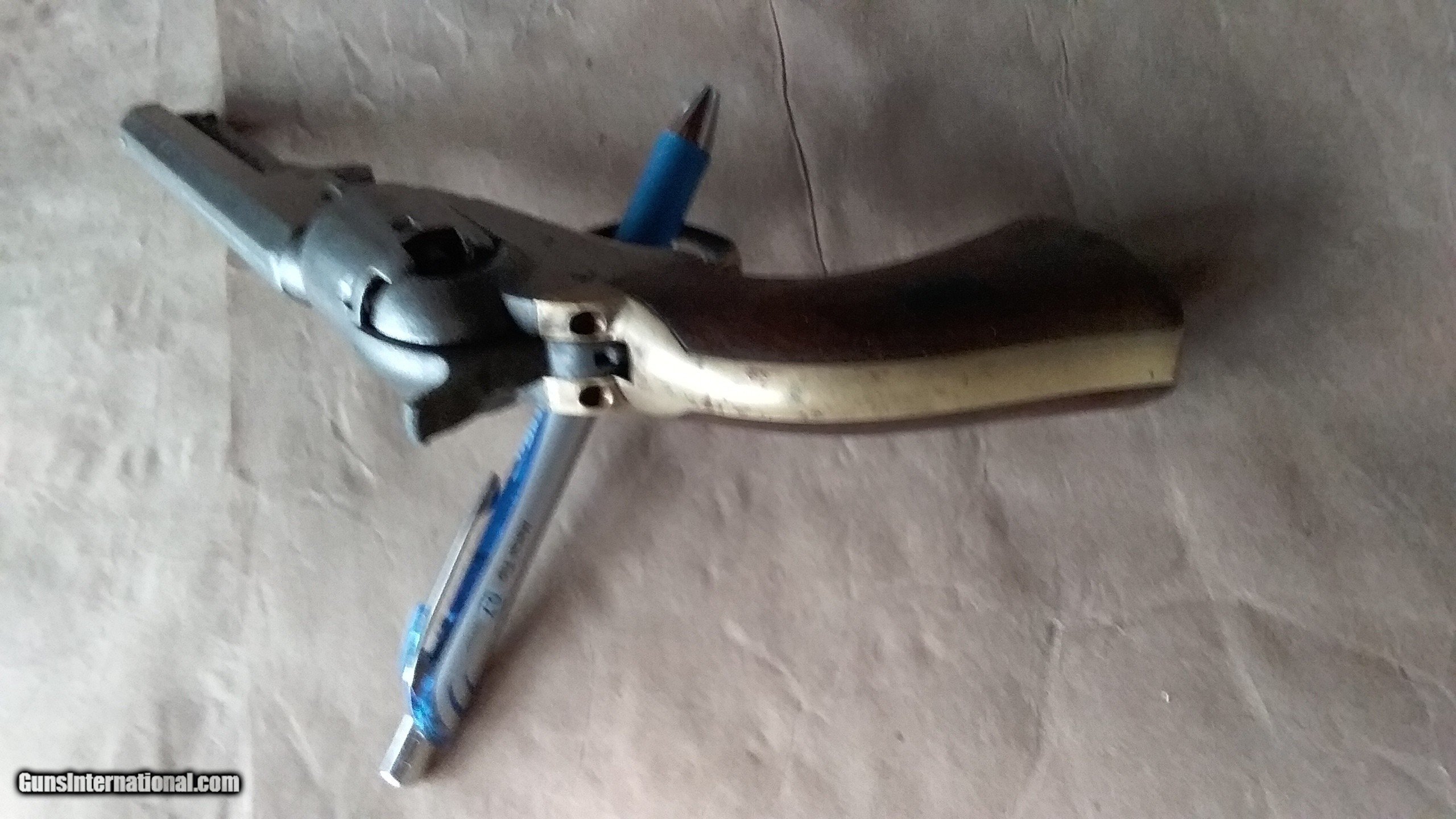 Description: Colt Civil War vintage Pocket Pistol, serial number 236288, made in 1862. All matching serial numbers, including the wedge. Most of the Pocket Pistols were 5 shot, this one is the harder to find 6 shot with the longer 6 inch barrel. Marked with single line "ADDRESS COL. SAML.COLT NEW-YORK U.S.AMERICA " on barrel, "COLTS PATENT "on frame and ".31 CAL " on trigger guard. Brass backstrap and trigger guard, I can find no evidence that they were ever silver plated. Well used but not abused, finish on wood grips is worn but partly intact, and has turned to patina on brass and iron surfaces. Cylinder rotates and locks up, but is slightly stiff. Bore is worn and pitted but still has strong visible rifling. The cylinder stagecoach scene is very faint, but still partly visible. Condition is fair to good, but is in pretty good shape for an historic 162 year old pistol that survived the Civil War and western expansion. SOLD Antique: Yes Manufacturer: Colt Model: 1849 Pocket Pistol Serial Number: 236288 Bore: . 31 Chambers: loose powder and ball Condition: fair to good Metal Condition: patina Wood Condition: good Bore Condition: pitted with visible rifling Barrel Type: Octogon Action: single action Manufacture Date: 1862 |
