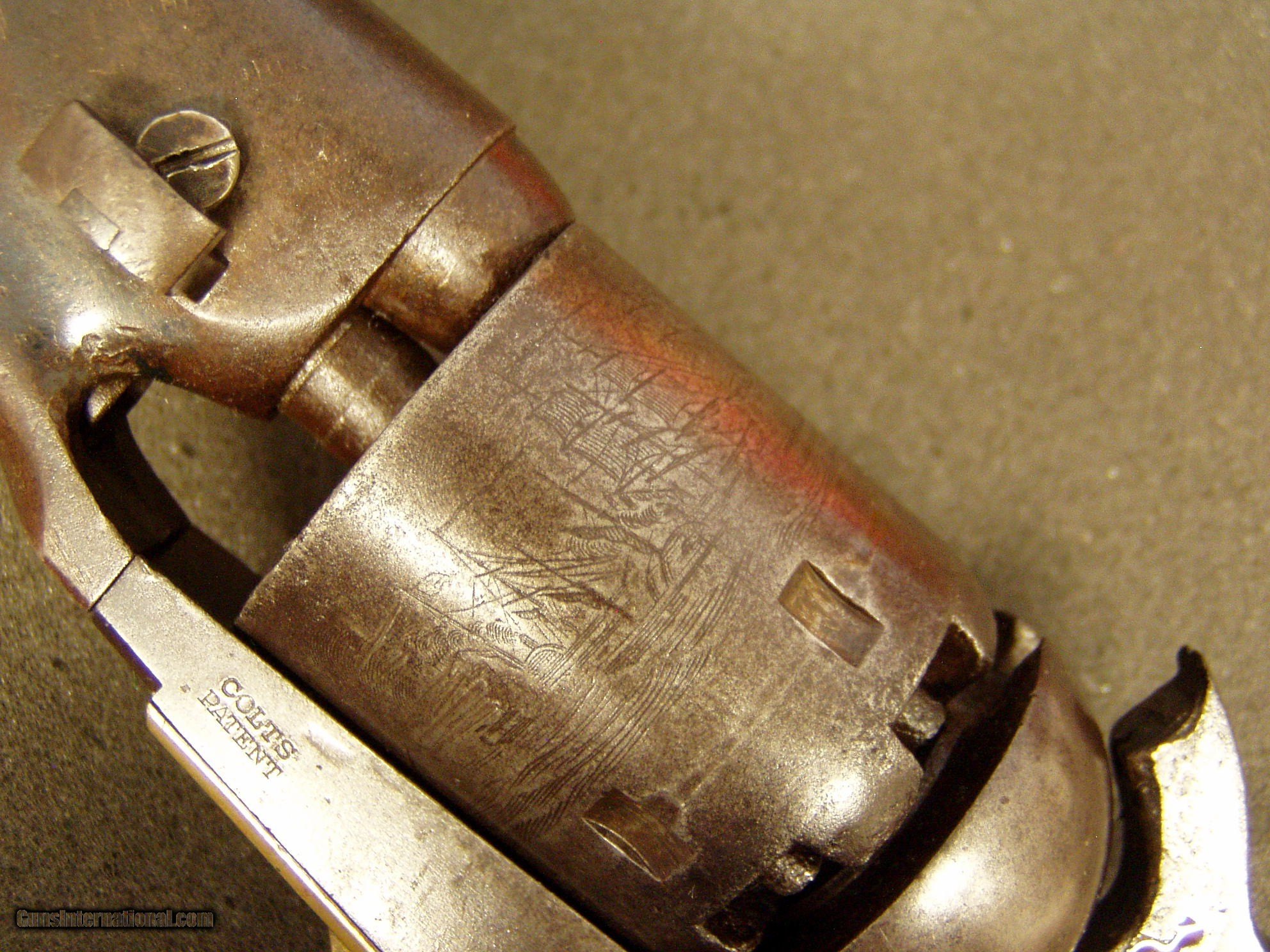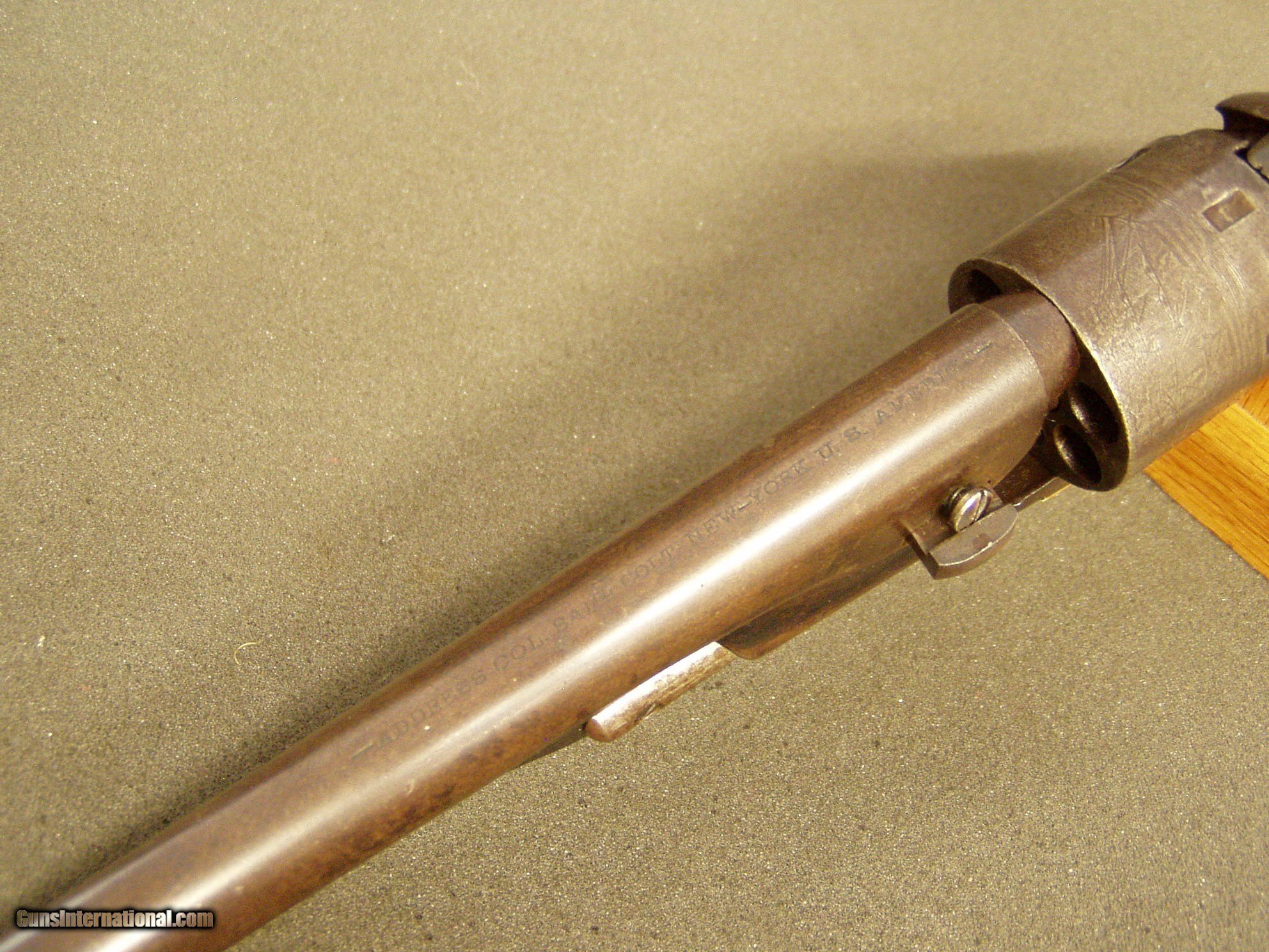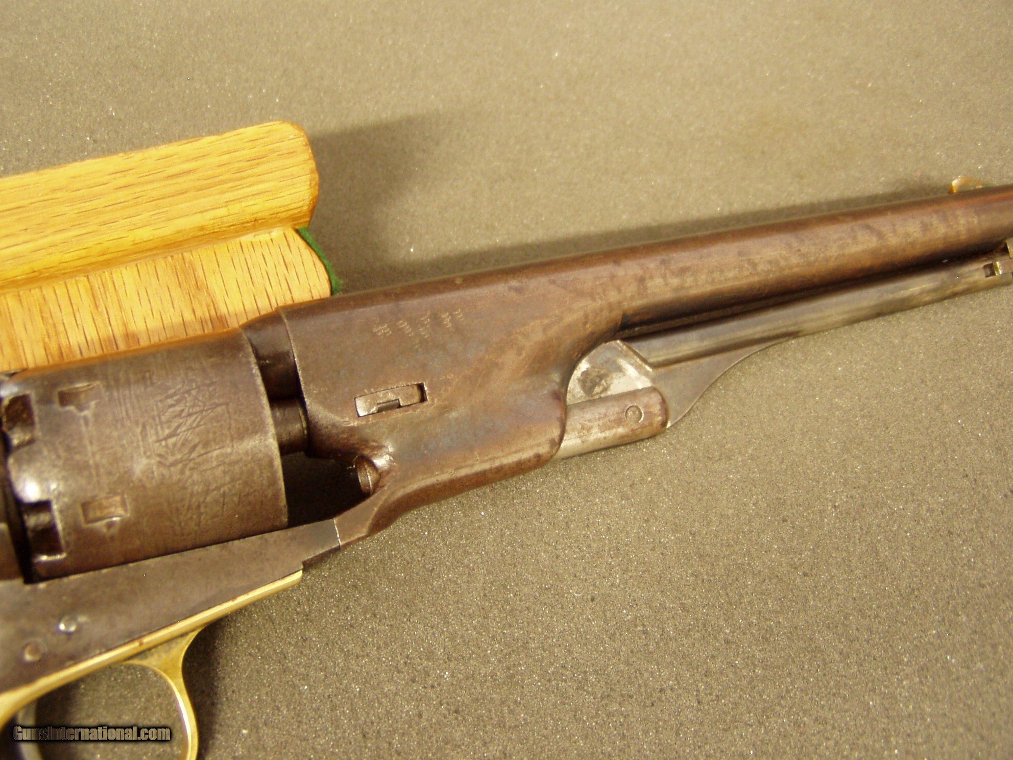Description: This is a Model 1861 Navy Colt percussion Revolver. Six (6) shot. with an 7.5" barrel. Has a very good bore. Action and lockup is tight and indexes properly. All numbers match the serial number #12961, including the wedge, arbor and grips. Manufactured in 1865, at the end of the Civil War. Blued/ casehardened finish, walnut grips. Fine overall 40% bright original high blue finish on the bottom half of barrel, mostly blued and brown patina on the balance, excellent cylinder scene, flattened safety pins, minor oxidation/pitting. Screw heads are nice. Grip has strong original varnish and is in excellent condition. , Has only mild lower edge wear and some scattered light scratches and marks. Marked "COLTS/PATENT" on left side of frame. Marked "-ADDRESS COL. SAML COLT NEW-YORK U.S. AMERICA-". Also marked on cylinder is:"COLTS PATENT No. 961. " Buyer pays $20.00 shipping to lower 48 states. I accept USPS Money Orders and Bank Cashier's Check.( Will accept Personal check, with shipping hold). 3 Day non-firing non-disassembly inspection period. If returned, for any reason, full refund less shipping. Layaway Available! One third down, balance on or before end of 90 days. Other reasonable layaway options considered. ANTIQUE! SOLD Antique: Yes Manufacturer: COLT Model: MODEL 1861 NAVY Serial Number: SERIAL #27961 Caliber Info: .36 Bore: 7.5 Chambers: SIX Ejectors: PERCUSSION Condition: EXCELLENT Metal Condition: EXCELLENT Wood Condition: Excellent Bore Condition: VERY GOOD Barrels: ONE Barrel Type: ROUND Action: SINGLE ACTION Triggers: ONE Stock: WALNUT Finish: BLUED- BRASS- PATINA Sights: BARREL Manufacture Date: 1865 |
