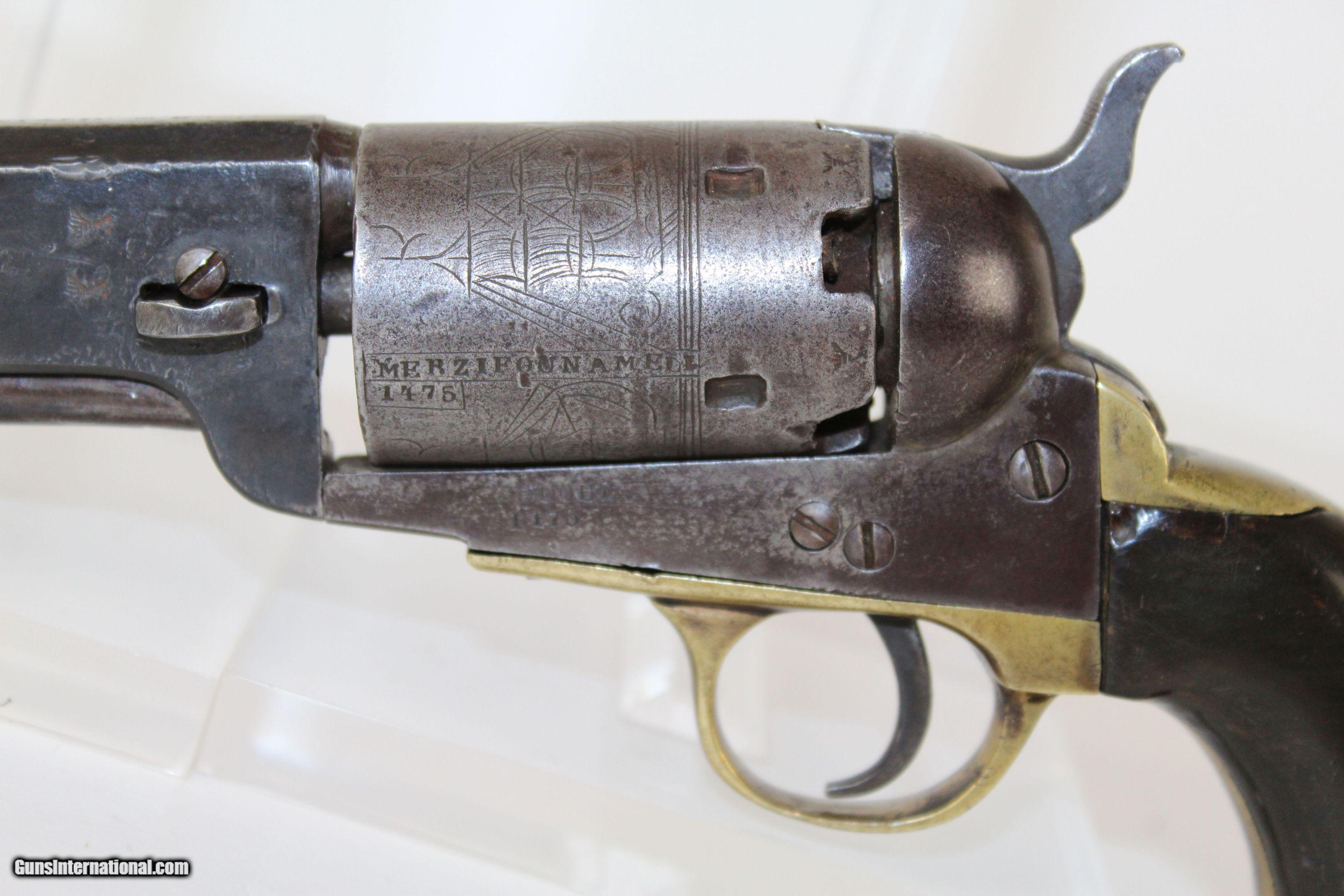 Description: INTERESTING Eastern Antique Copy of COLT Revolver With Middle Eastern CORSAIR Cylinder Scene Here we present an antique Middle Eastern Copy of a Colt Model 1849 Pocket Revolver, made circa the 1850s. The Model 1849 was Samuel Colt’s most successful revolvers during his lifetime. It was specifically designed for use by civilians for self-defense. Licensed and unlicensed copies were produced in Europe among other places. This revolver differs from a Hartford Colt in several ways: 1) the cylinder is about a ½-inch longer than standard, 2) the cylinder scene is of 4 corsair ships (reminiscent of those depictions of the Barbary Wars in the early 19th Century), 3) numerous markings 4) horn grips, and 5) obviously hand-crafted manufacture. The top barrel flat is marked “MERZIFOUN—AMELI—ABDOUL MOUTALIP”. The cylinder is marked “MERZIFOUNAMELI”. The frame is marked “ABDOUL”. The serial number is “1475” and all numbers match. “CROWN/Lamda” proof-style marks are found all over. The bottom of the barrel is marked “VXC/KJI”. The overall condition is very good. The metal surfaces retain about 40%. A dark patina makes up the balance. The markings are numerous, clear and legible. The cylinder scene is very good. The horn grips show honest wear. The bore is sharp and clean. The action is strong. The cylinder safety pins are still intact. Here is a fascinating Eastern copy of Samuel Colt’s famous revolver that was obviously handmade! It very well may be a one-of-a-kind! Own the original! This is a legitimate antique and not a reproduction. Barrel is 5-1/2 inches. Caliber: .31 Percussion Overall condition as seen in photos. Very Fast. Very Safe. FREE SHIPPING WORLDWIDE. Delivered directly to your door by express mail! Guaranteed AUTHENTIC & Includes CERTIFICATE OF AUTHENTICITY. ancestryguns $1450 #6183 SOLD Antique: Yes |