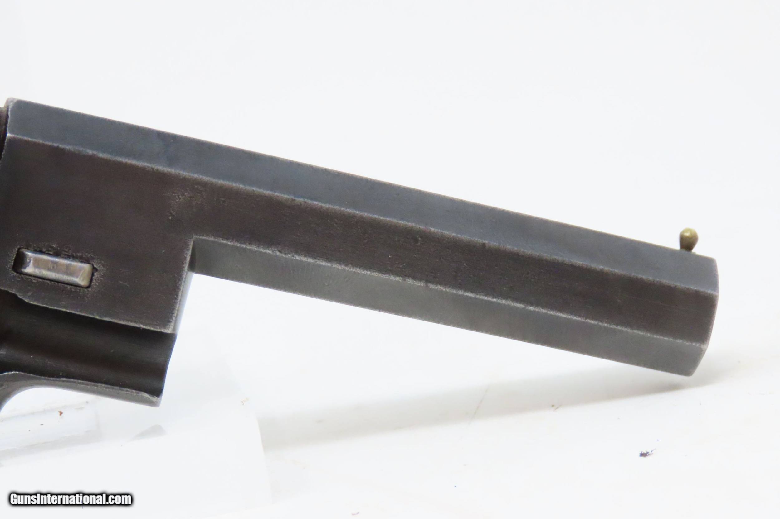 Description: Scarce NEW HAVEN ARMS Co. WALCH 10-Shot SUPERPOSED LOAD Percussion Revolver Antique Pocket Revolver Manufactured Circe 1860-62 Here we present a scarce antique New Haven Arms Co. Walch Superposed Load Pocket Revolver, made in 1860-62 in New Haven, Connecticut. These 10-shot pocket revolvers and the larger Navy Model 12-shot revolvers were manufactured around the early 1860s. The pocket model, as is this one, was manufactured by the New Haven Arms Co. for John Walch’s Walch Fire-Arms Co. of New York City alongside the famous Henry rifles. On February 8, 1859, John Walch of New York City received US Patent #22,905 for a somewhat unique revolver that fired superimposed loads from its cylinder, thus doubling the number of times the revolver could be fired before it was reloaded. Walch knew that the concept of a superimposed positioning of two or more loads in a single chamber was not a new idea and did not claim that design in his patent. In fact, the U.S. military had experimented with the concept circa 1829 with the Ellis-Jennings repeating rifle, which was produced in both four and ten shot variants. Rather his claim ran specifically to the arrangement of two rows of nipples on the rear of a revolving cylinder allowing double loads to be fired from each cylinder chamber. His other claim referred to his trigger, which as he notes, “is on its upper end made in two parts.” Thus, a single conventional trigger appeared in the trigger guard, which had two operating parts in the frame, which allowed the release of the right and then the left hammer with two distinct pulls. Robert Reilly in his book United States Military Small Arms, 1816-1865 notes that some of the Walch Pocket revolvers were acquired by the 9th Michigan and 14th Wisconsin Volunteer Infantry Regiments, but he asserts that these were certainly personal purchases and not state of Federal government purchases. As handguns were not regularly issued or carried by infantry, this seems quite logical. However, Flayderman states categorically that “One entire outfit, Company I of the 9th Michigan Infantry armed themselves with the gun, where it received favorable comment.” The overall condition is fine. The barrel and cylinder have been refinished. There are some original case colors still on the hammers and trigger. The action is excellent. The bore is patinated with good rifling. The grips are smooth and solid with just a small chip at the front of the left panel. A very nice example of a rare 10-shot pocket revolver from the early Civil War period! Own the original! This is a legitimate antique and not a reproduction. Barrel is 3-1/4 inches. Caliber: .31 Percussion Overall condition as seen in photos. Very Fast. Very Safe. FREE SHIPPING WORLDWIDE. Delivered directly to your door by express mail! Guaranteed AUTHENTIC & Includes CERTIFICATE OF AUTHENTICITY. ancestryguns $7115 #226930 SOLD Antique: Yes |