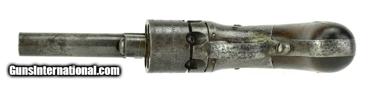 Springfield Arms Pocket Model Revolver. Made circa 1851. .28 Caliber with a 2 ½” barrel. Metal has a nice even gray patina with spots of light pitting. Cylinder scene is good. Grips are very good. Action works well.