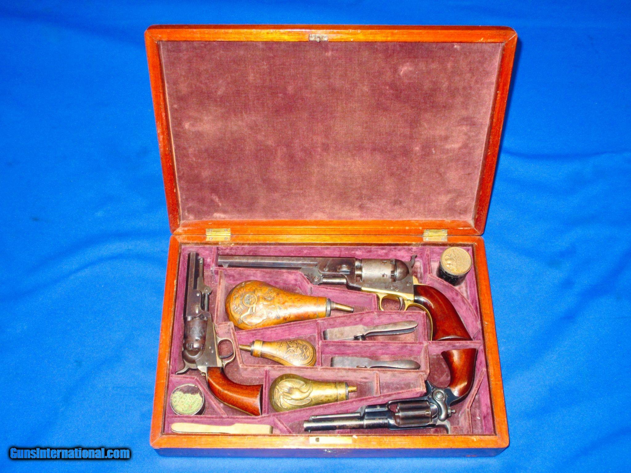 Triple Colt Cased Set, Colt Model 1851 Navy Revolver, Colt Model 5A,1855 Root Revolver, and Colt Model 1849 Pocket Revolver With Accessories
