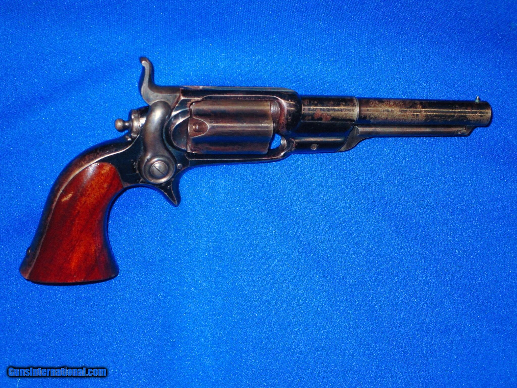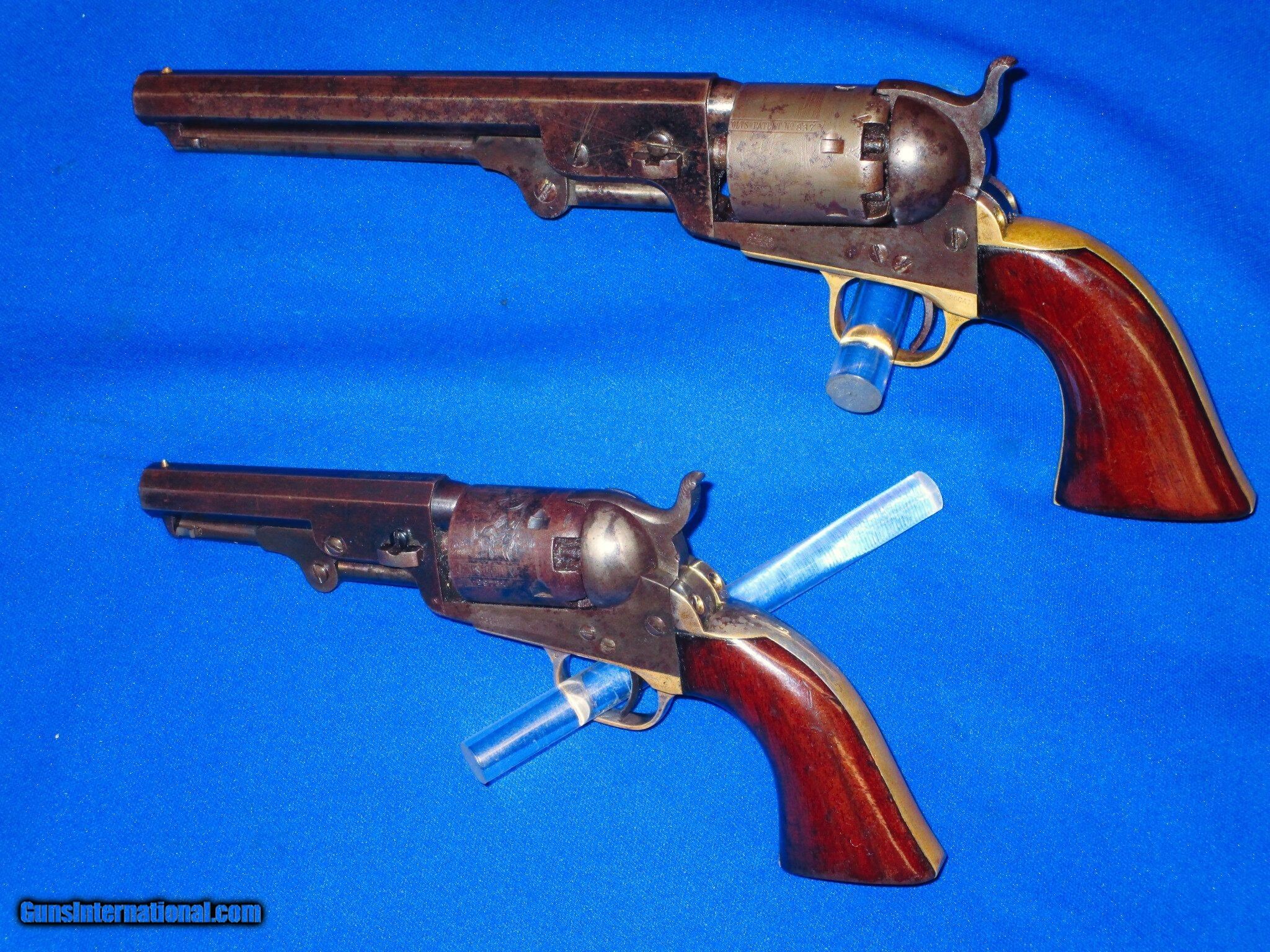 Description: A Very Rare Deluxe Triple Colt Cased Set Which Includes A Colt Model 1851 Percussion Navy Revolver, A Colt Model 5A, 1855 Root Revolver, And A Colt Model 1849 Percussion Pocket Revolver With Accessories All In Fine Condition. I will describe each revolver & the case with accessories seperately below. The Colt Model 1851 Percussion Navy Revolver Is In Very Nice Untouched Condition. It is serial #214,837, with all matching numbers. Made in 1872. All original and complete. The revolver has fine metal, markings, and edges. It has a clear original cylinder scene. The barrel on the gun retains a lot of original blue throughout it with some areas fading lightly into a natural patina. The cylinder blue has faded into a nice even light patina. The frame, hammer, and lever all show light faded case colors throughout them. All screws are fine as is the brass backstrap & trigger guard. The original grips are excellent plus and retain their original factory varnish on them. It has a fine, tight action and fine bore. The Colt Model 5A Root Revolver With Fluted Cylinder & 4 1/2 Inch Barrel Is Excellent Throughout. Serial #2,908, made in early 1861. All matching numbers, made in .31 caliber. All original and complete. The revolver has excellent metal, markings, and edges. The barrel and cylinder retain lots of their original blue with some areas fading to a plum color. The frame and backstrap retain most of their original factory blue with small spots of fading. The loading lever and hammer retain most of their original case colors. The grips are mint throughout and retain all of their original factory varnish on them. The root Revolver has an excellent action and bore. The early Colt Model 1849 Percussion Pocket Revolver With A 4 Inch barrel Is fine Throughout. Serial #99,732, made in 1854. All matching numbers and made in .31 caliber. All original and complete. The revolver has fine metal, markings, and edges. It has a very fine and full cylinder scene on it. The barrel and cylinder retain most of their original blue with some small areas fading into a plum color. The frame, loading lever, & hammer retain most of their original case colors which are darkening. All screws are excellent. The backstrap and trigger guard retain about 3/4 of their original silver on them. The grips are excellent throughout and retain all of their original factory varnish on them. The revolver has an excellent action and bore in it. The Original Deluxe Triple Case Is Fine Throughout. it has an excellent contoured bergundy lining throughout it with fine partitions inside. The case comes with a Colt Navy Flask with sloping charger on it. It also has a Colt Pocket and a Colt Root Flask in it. There is also a Colt Navy Mold, A Colt Pocket Mold, & A Colt Root Mold In The Set. There is an Eleys Foil Top 250 count tin & an Eleys Colt's Pt. 250 count tin inside. The ouside of the rare case is fine throughout with no warping in the lid. This Is A Very Rare And Difficult Set To Find. These Sets Rarely Turn Up For sale. This Set Just Came Out Of An Old Collection That We Just Purchased From The Owner. This Rare Cased Triple Colt Revolver Set Has A Wonderful Look To It Inside And Out And May Be The Only One You Ever See For Sale! DISCLAIMER: All firearms are sold as collector’s items only – we did not accept responsibility as to the shooting safety or reliability of any antique firearm. All firearms as described as accurately as possible, given the restraints of a catalog listing length. We want satisfied customers and often under describe the weapons. Any city or state regulations regarding owning antique firearms are the responsibility of the purchaser. All firearms are mechanically perfect unless noted, but again are NOT warranted as safe to fire. We do not sell or ship any Antique Guns or Antique Ammo to anywhere in New York State. SOLD Antique: Yes Manufacturer: Colt Model: 1849 Pocket, 1851 Navy & 1855 Root Serial Number: Pocket 99732, Navy 214837, Root 2908 Condition: Fine Untouched Condition Metal Condition: Fine Untouched Condition Wood Condition: Fine Untouched Condition Action: Single |